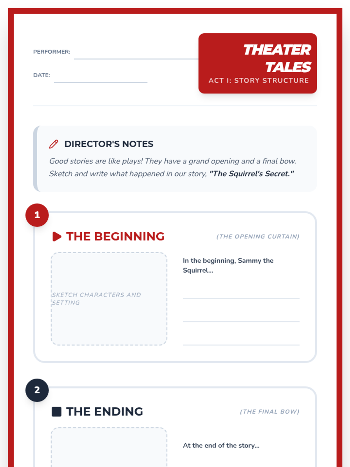 Focuses on the overall structure of a story, specifically identifying the beginning (setting the stage) and the ending (the final bow).