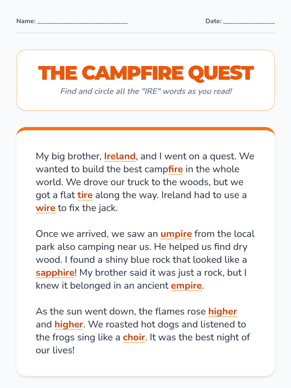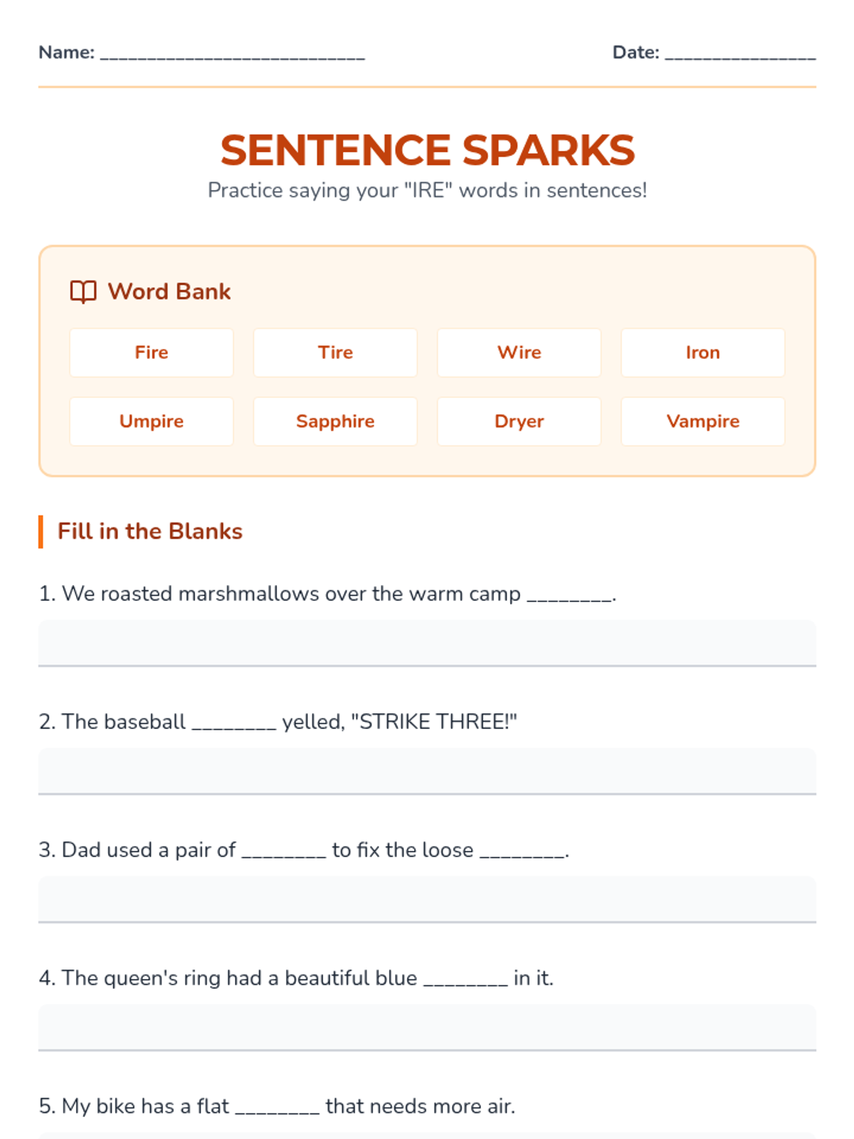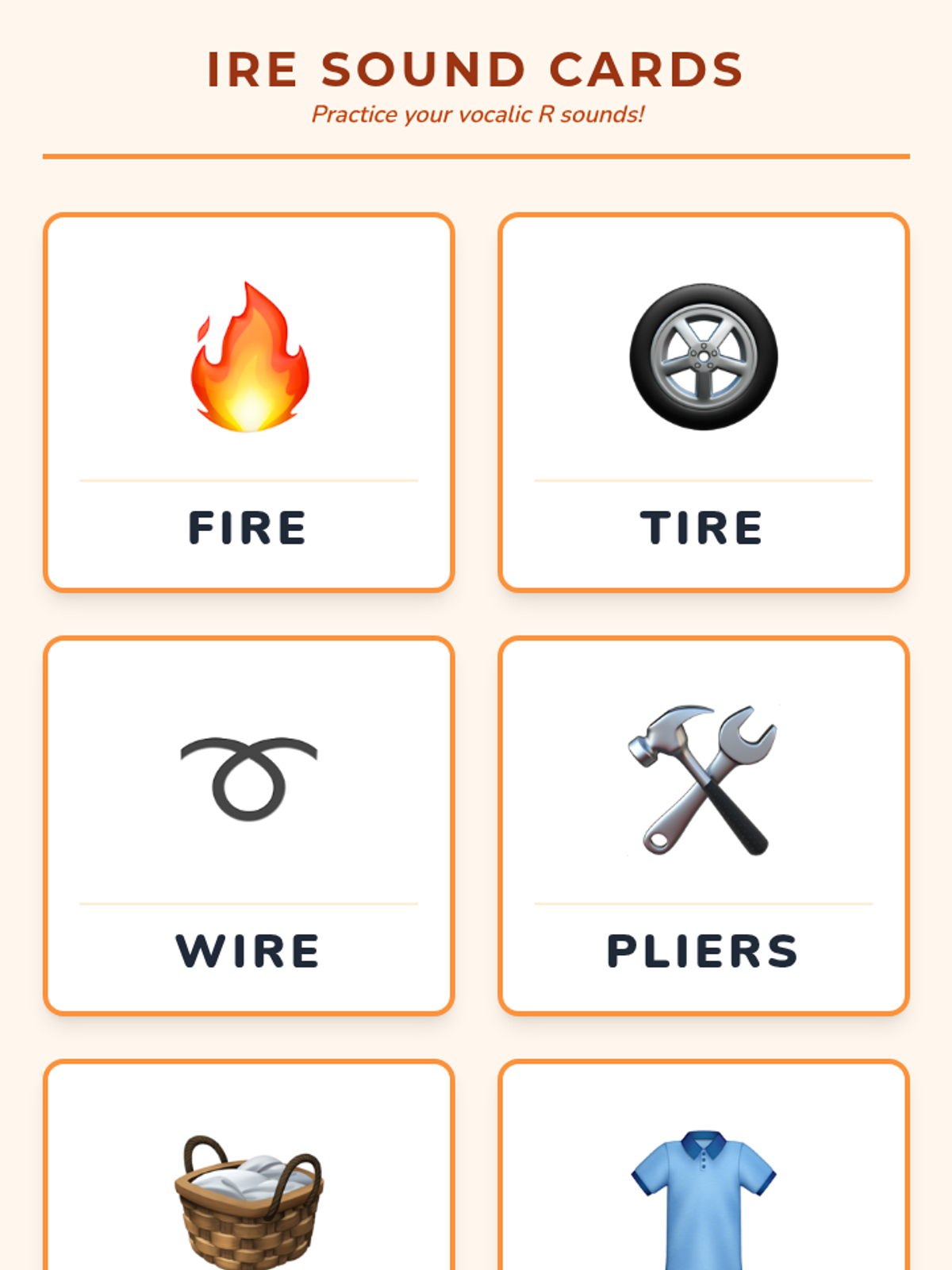 A collection of materials designed to practice the 'IRE' vocalic R sound in initial, medial, and final positions through visual aids, sentence construction, and narrative reading.
