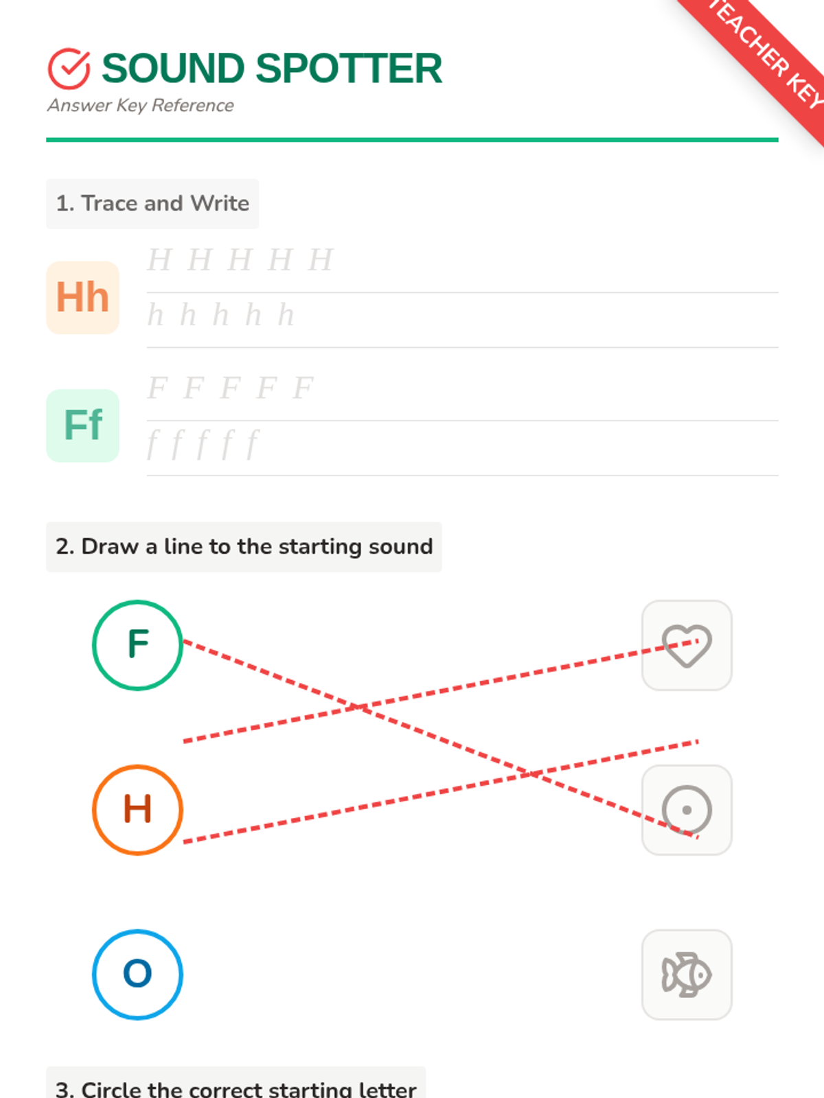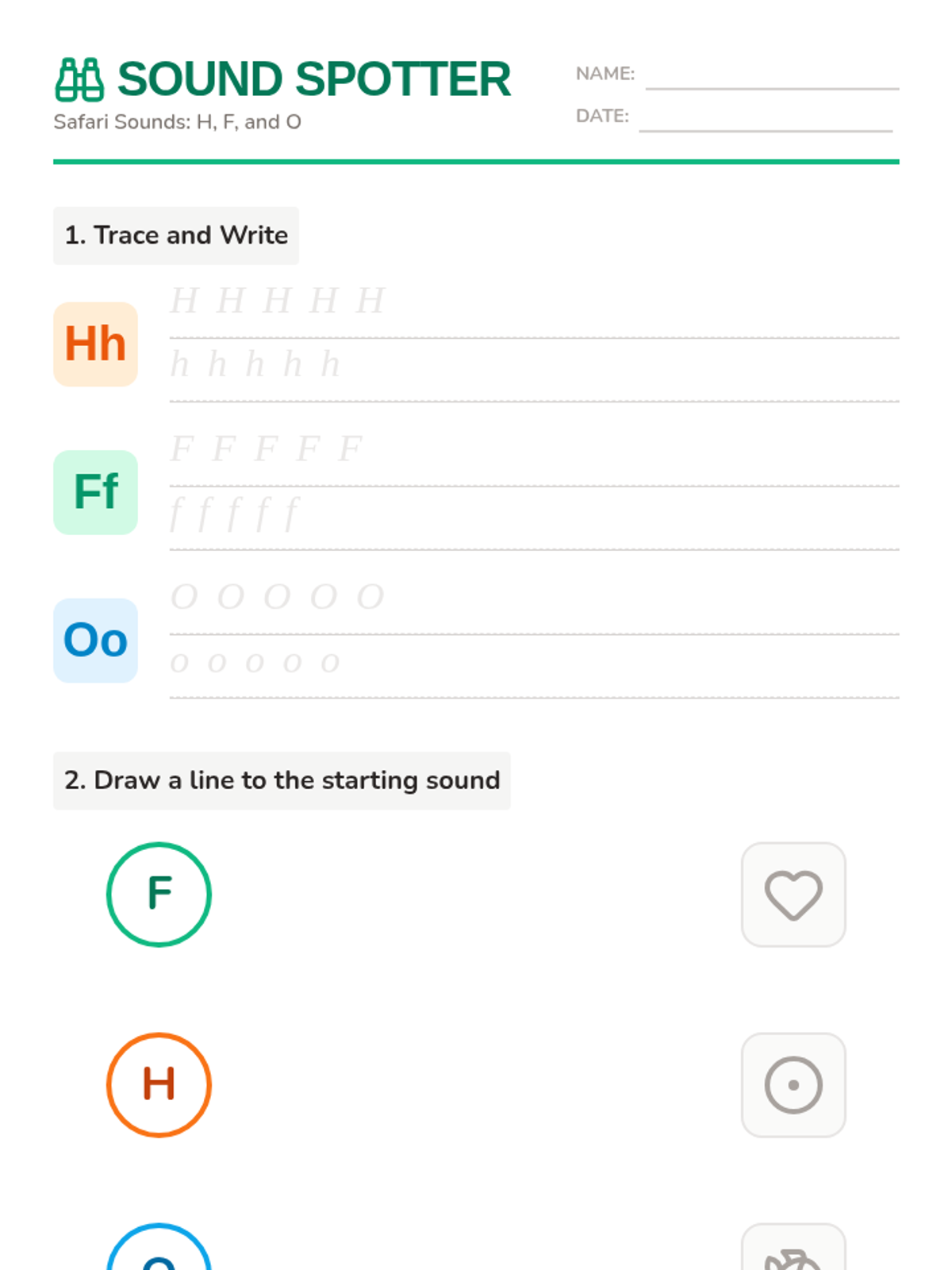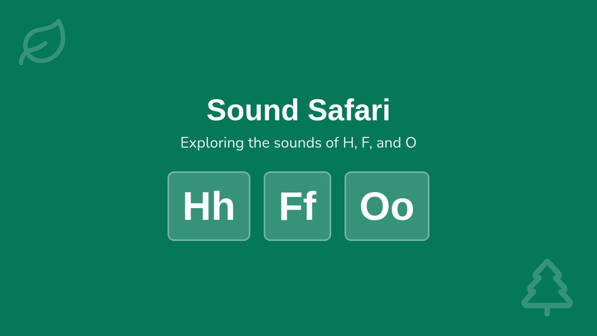 A fun, nature-themed lesson introducing the letter sounds H, F, and O through visual recognition, handwriting practice, and initial sound matching.
