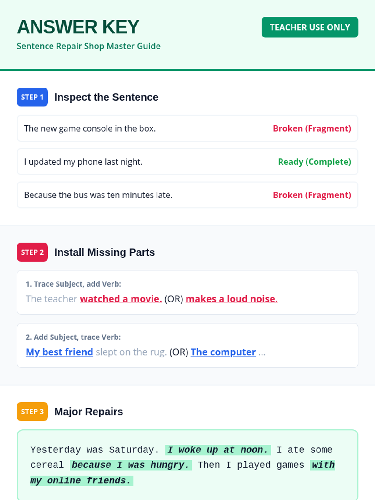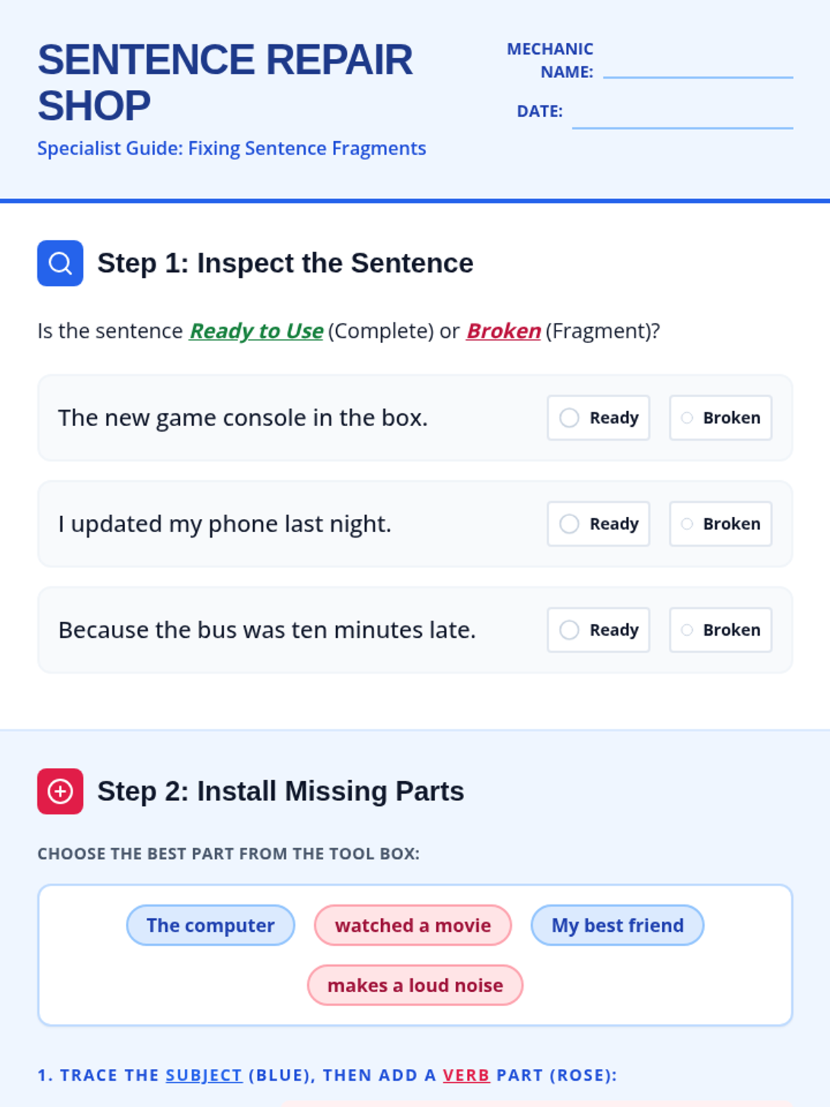 A comprehensive lesson on identifying and fixing sentence fragments using visual supports, color-coding, and step-by-step practice tailored for neurodivergent learners.