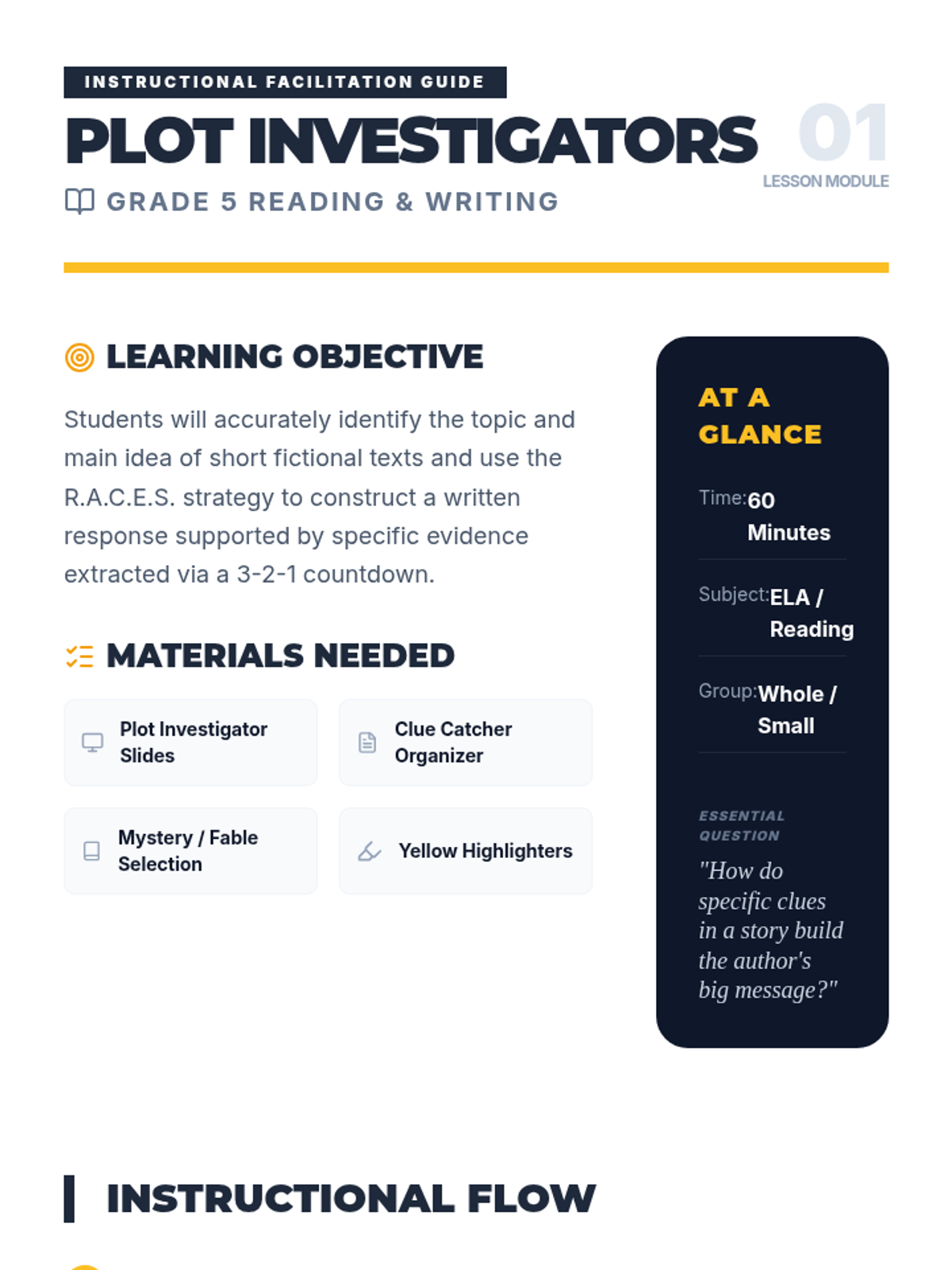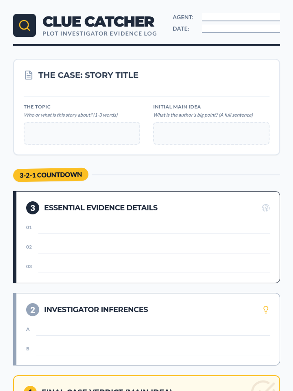 In this lesson, students become 'Plot Investigators' to distinguish between a story's topic and its main idea. Using mystery-themed tools like a 3-2-1 countdown and the RACES writing strategy, students will learn to extract key evidence from fables and short stories to construct well-supported thematic statements.