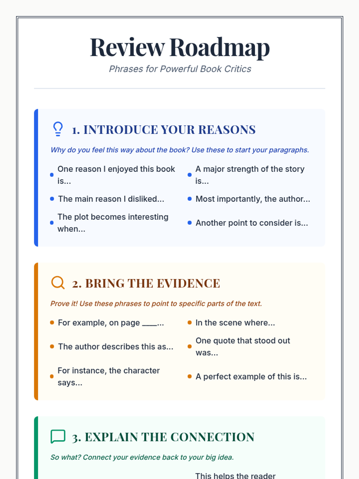A lesson focused on teaching students how to write compelling book reviews by using specific transition phrases to connect their opinions with text-based evidence.
