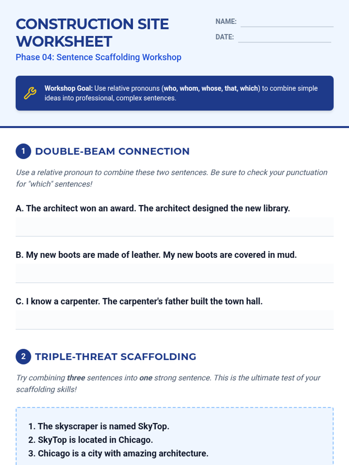 A hands-on workshop where students combine choppy sentences into elegant complex structures.