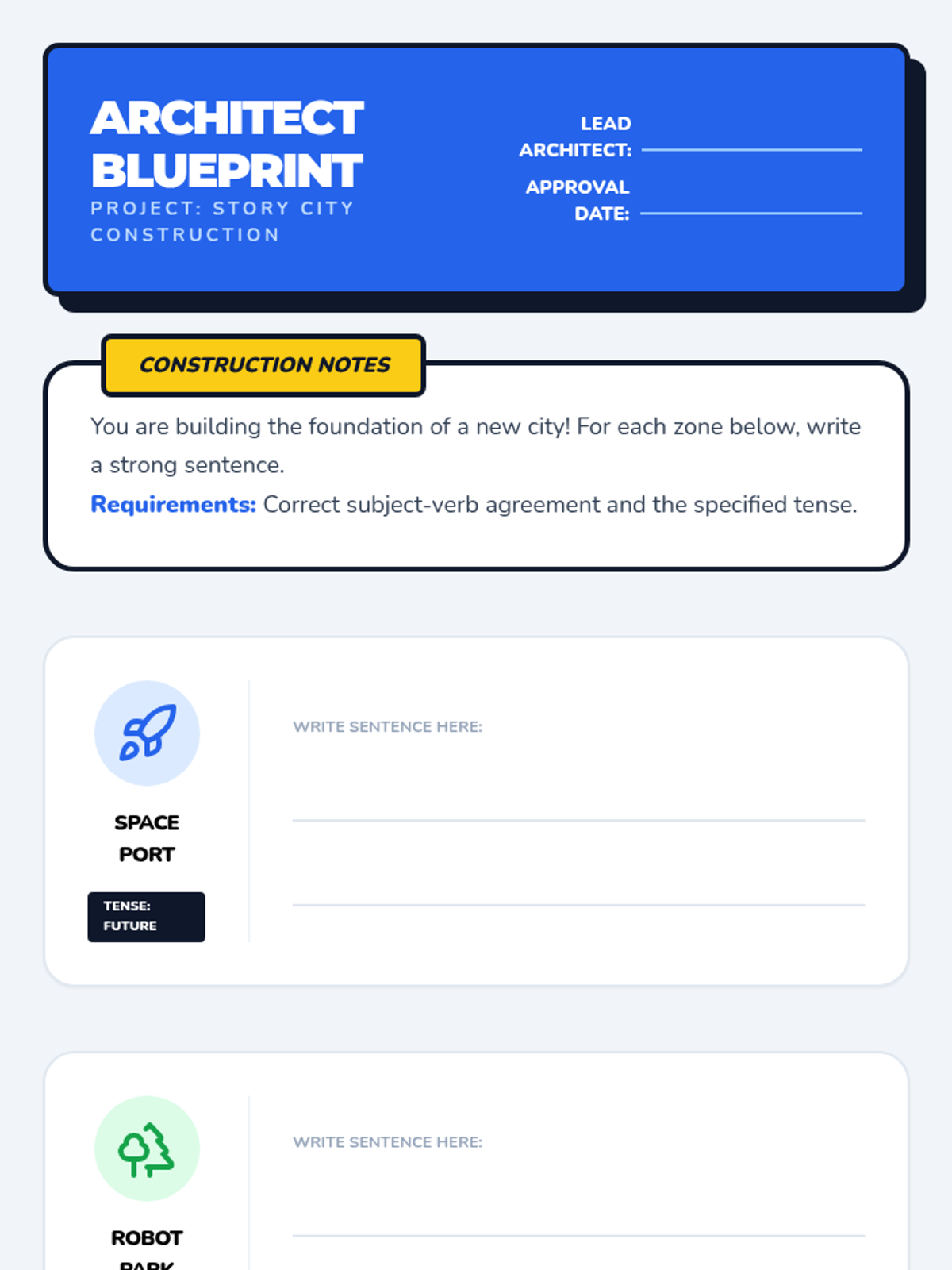 In this culminating lesson, students apply all learned concepts by constructing complex sentences based on image prompts. They must identify the subject, choose a strong action word, ensure agreement, and select the correct tense. Peers review the sentences using a checklist to verify grammatical accuracy.