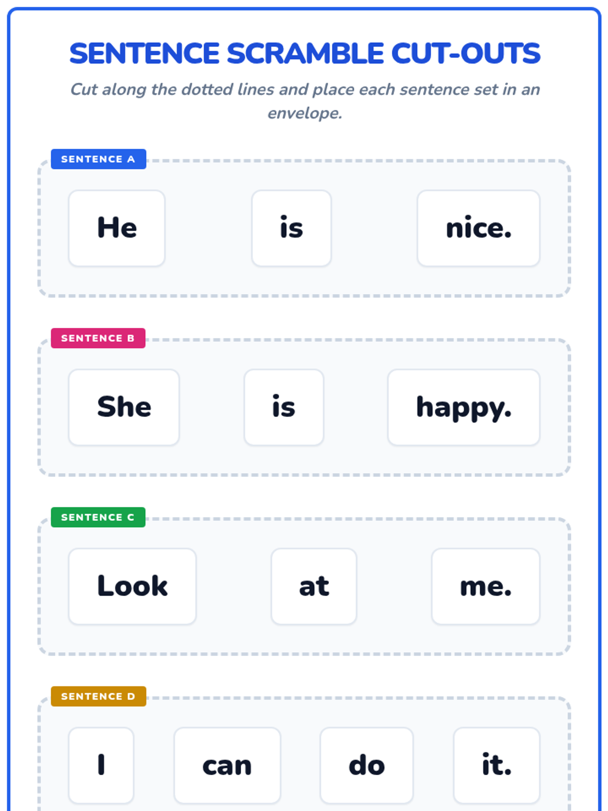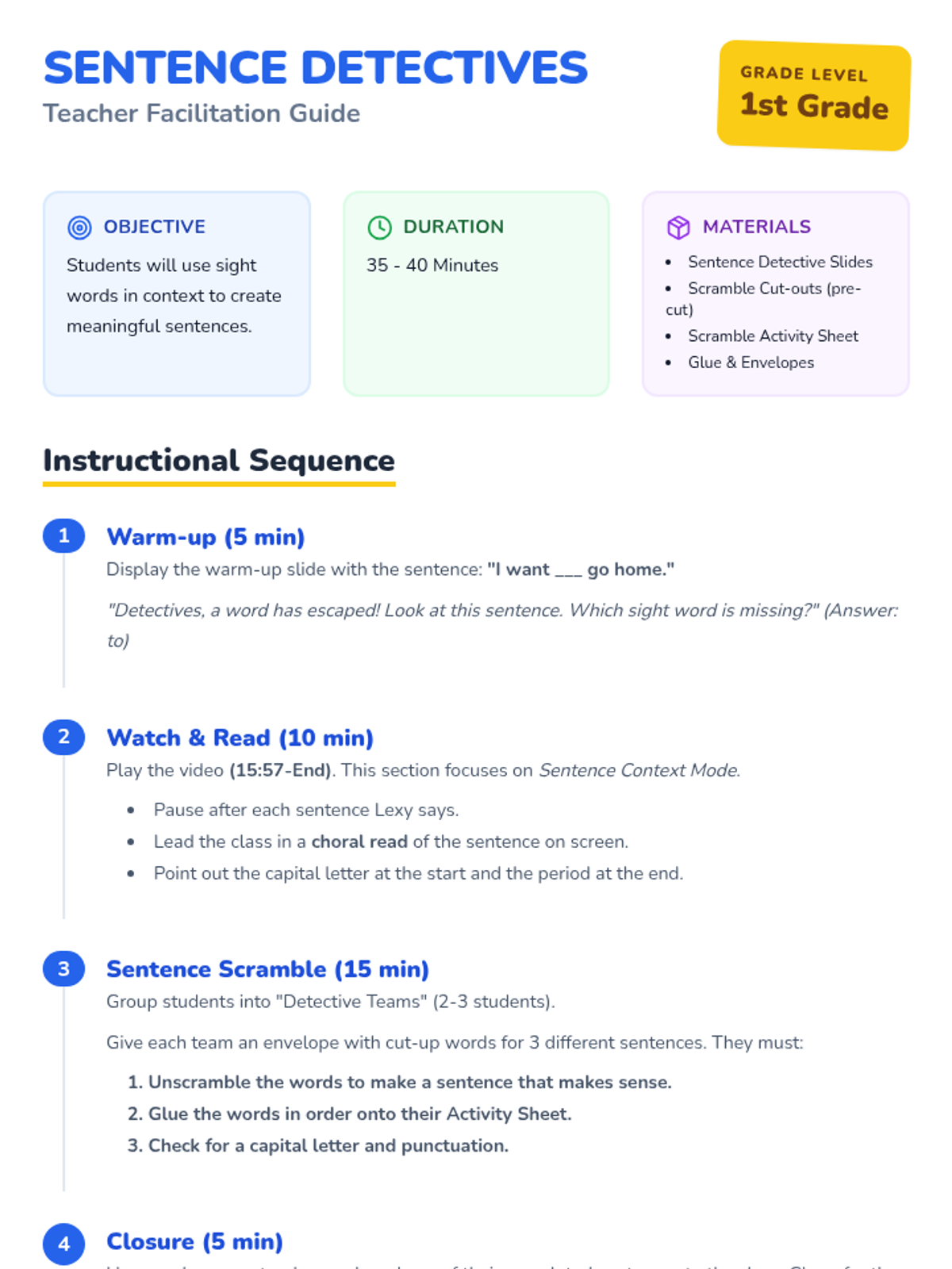 A 1st-grade literacy lesson focusing on using sight words in context. Students watch a video on sentence formation and participate in a hands-on 'Sentence Scramble' activity to build their own sentences.