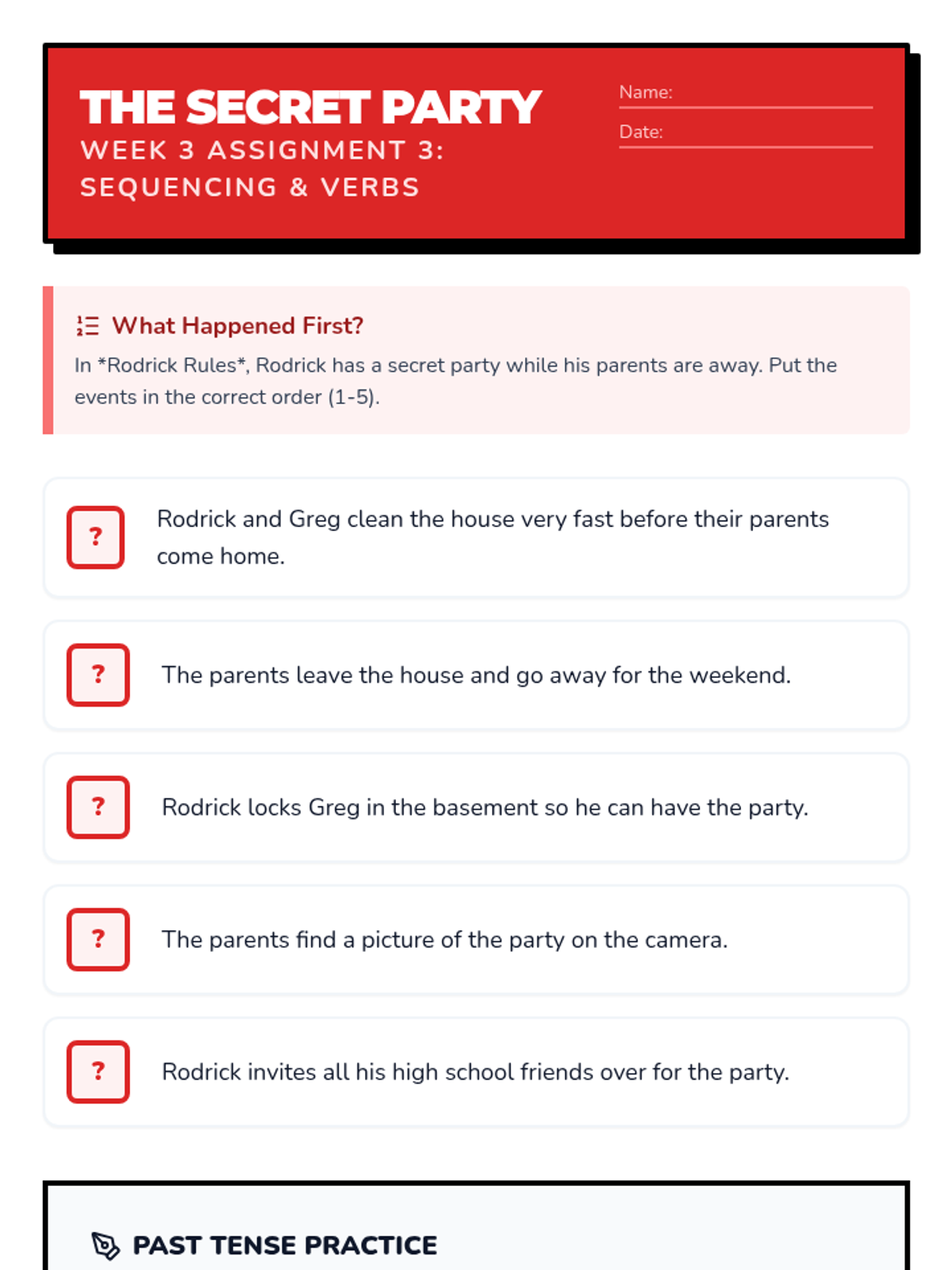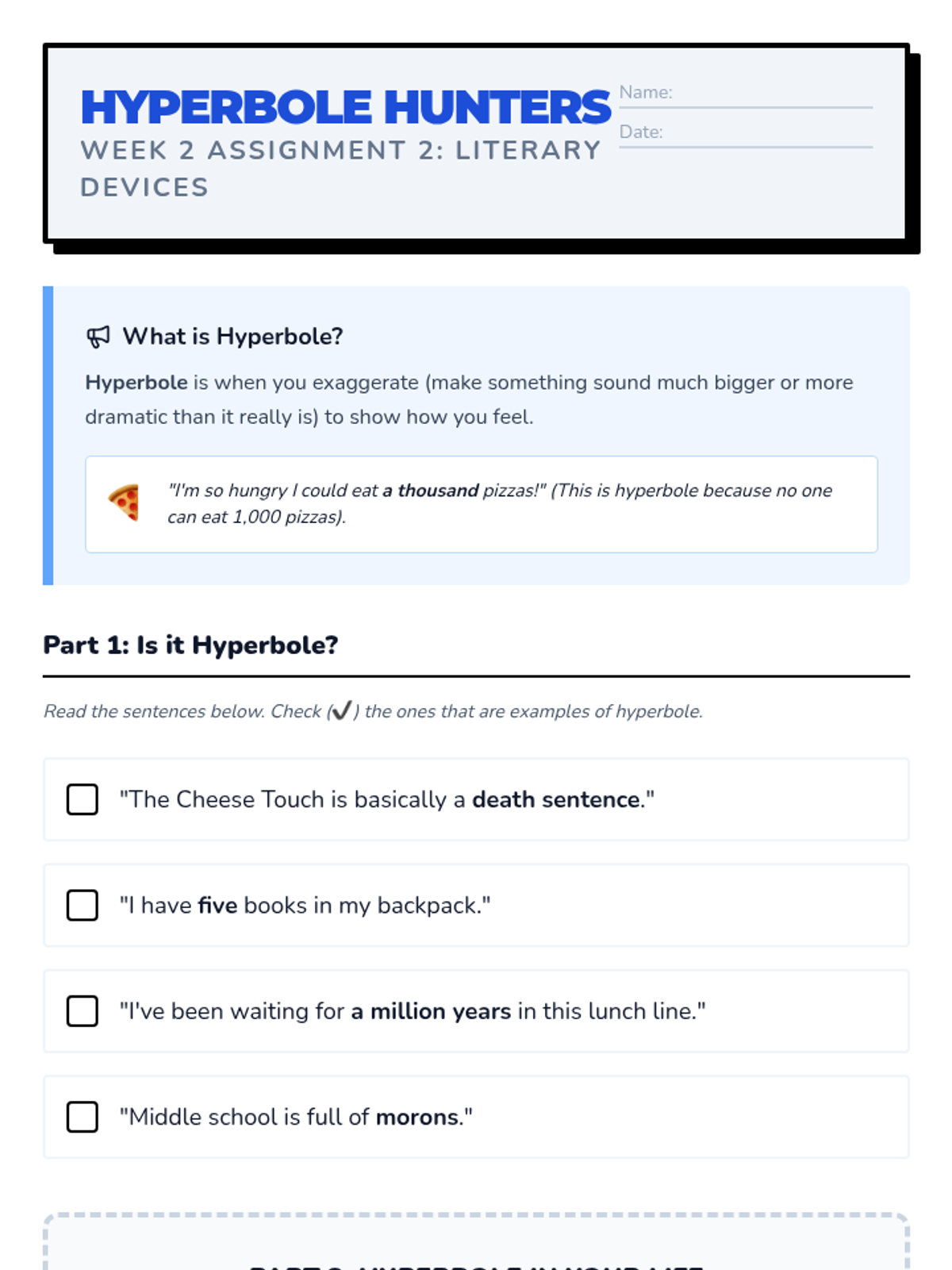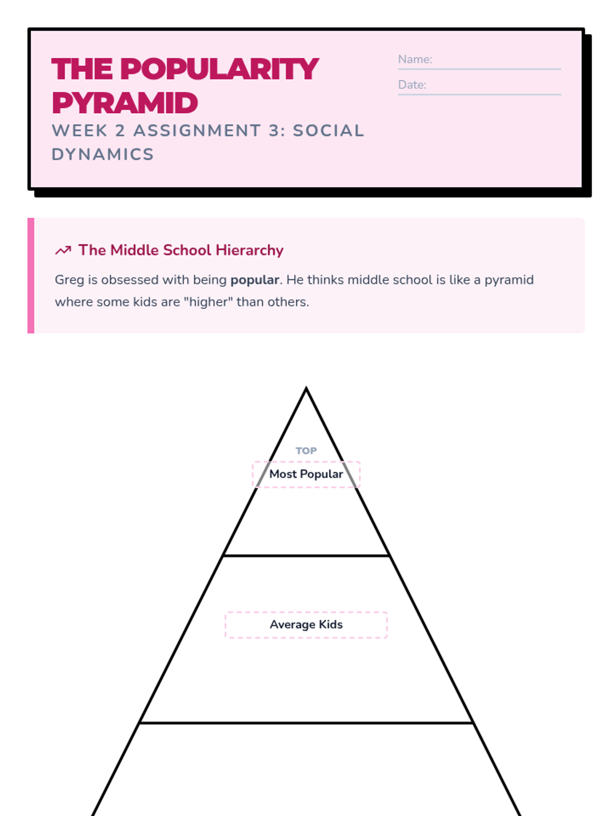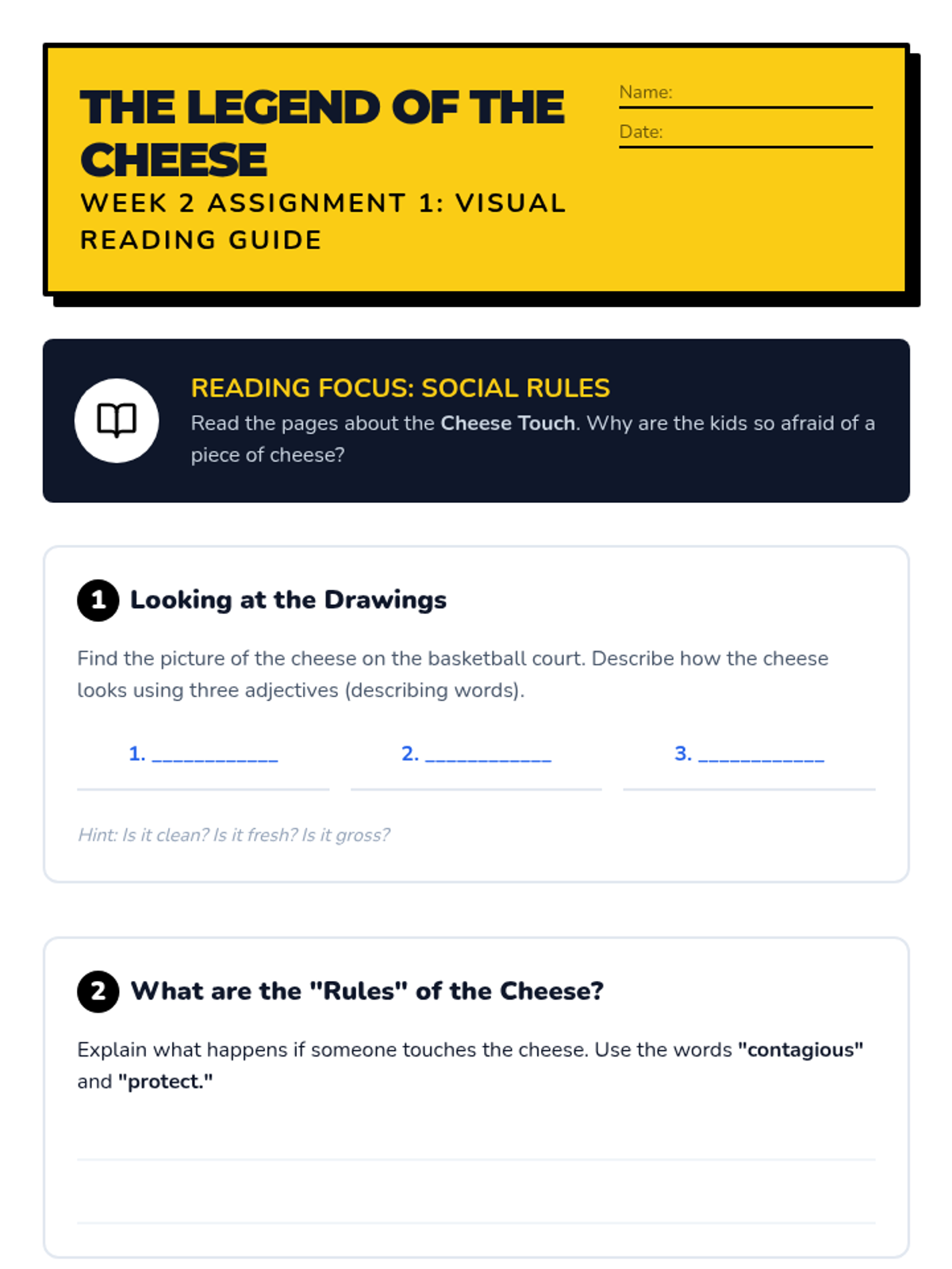 Exploring social dynamics and popularity. Students analyze the 'Cheese Touch' as an allegory for social exclusion and learn about hyperbole.