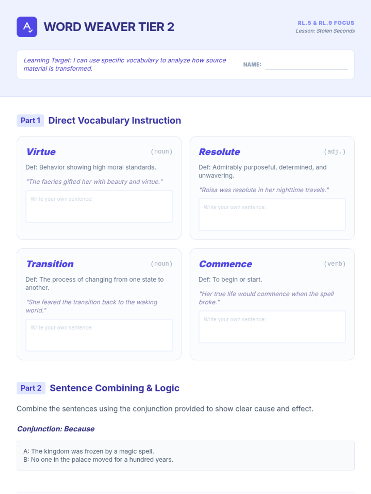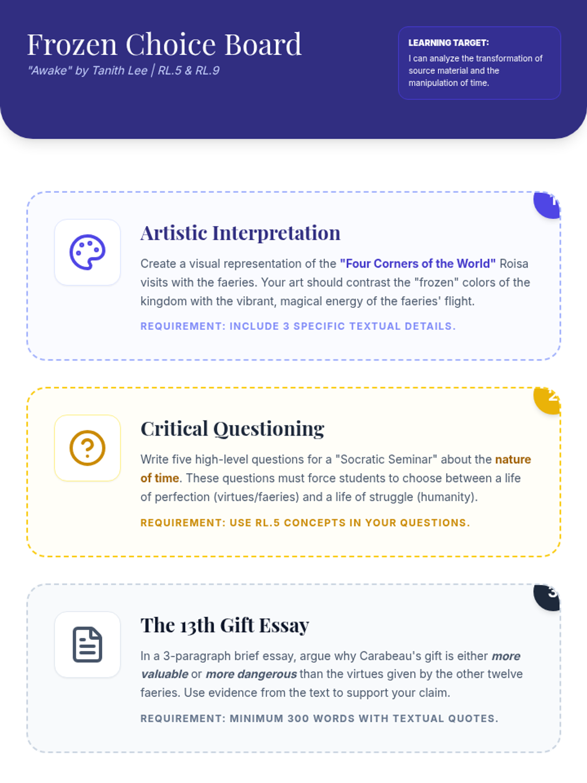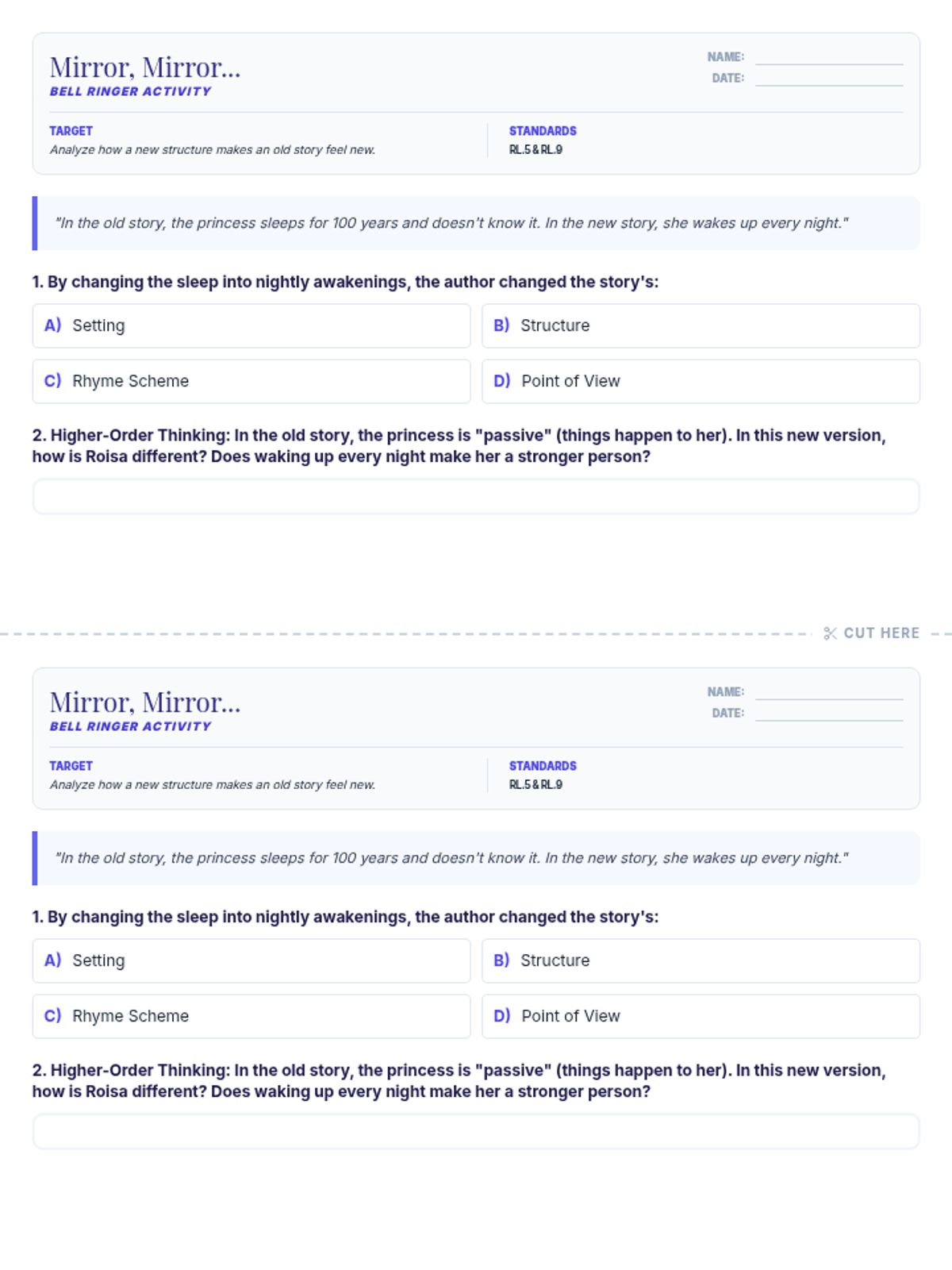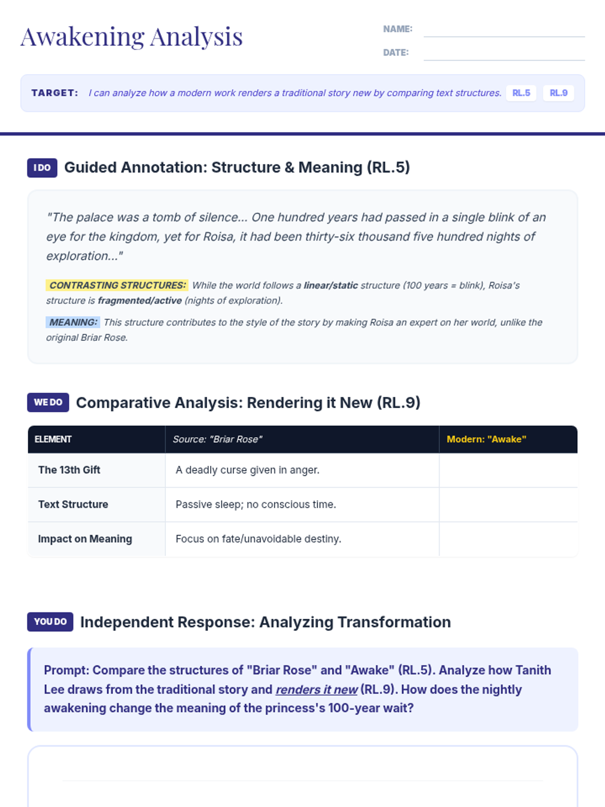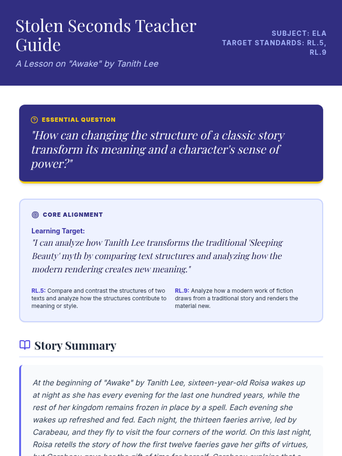 A comprehensive lesson exploring Tanith Lee's 'Awake,' a subversion of Sleeping Beauty, focusing on structural choices and source material transformation (RL.5 and RL.9). Students will analyze character conflict and the concept of 'the gift of time.'