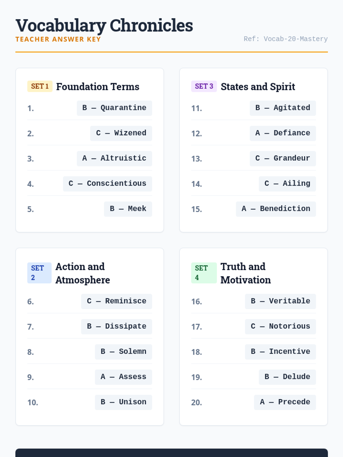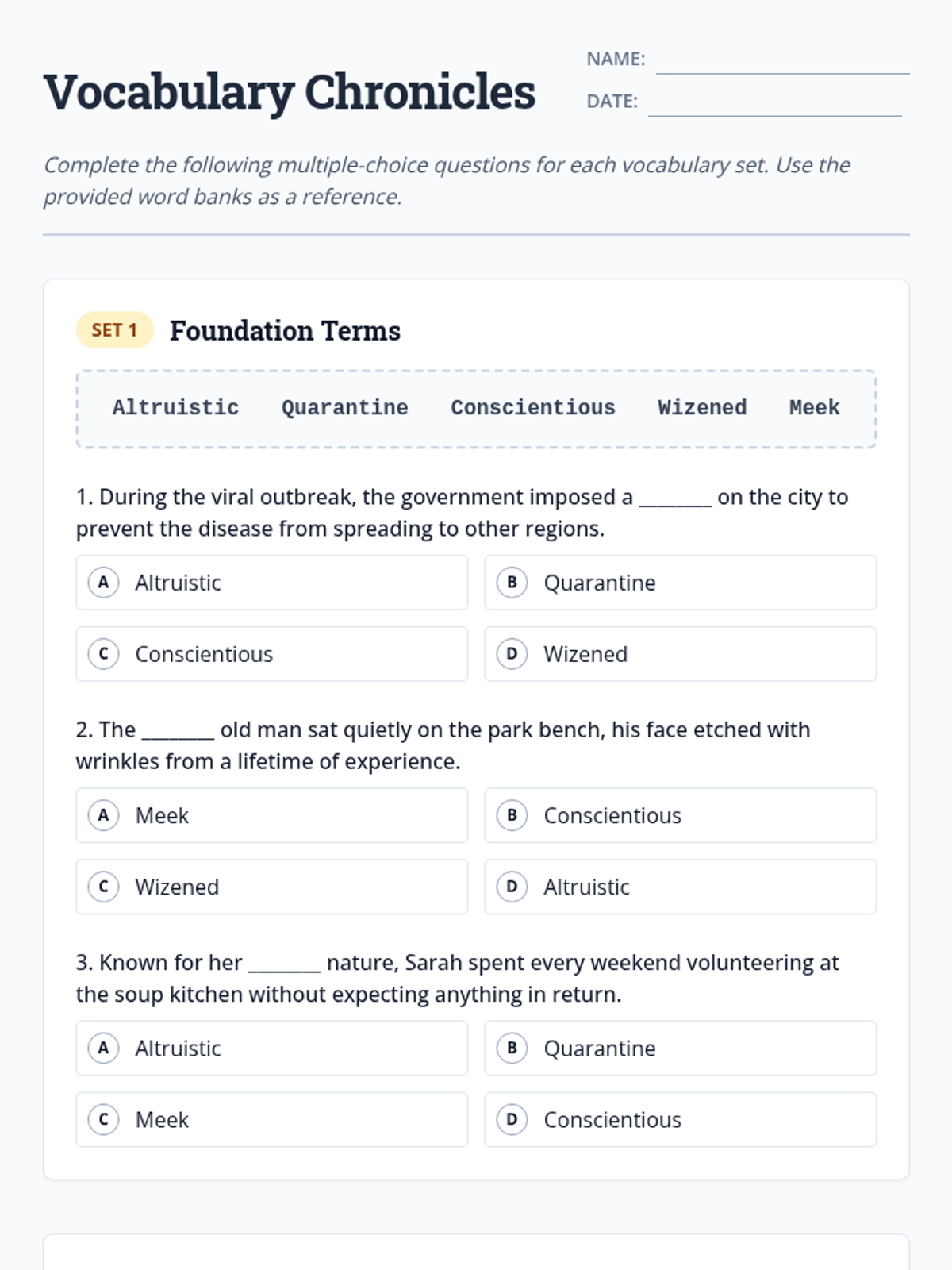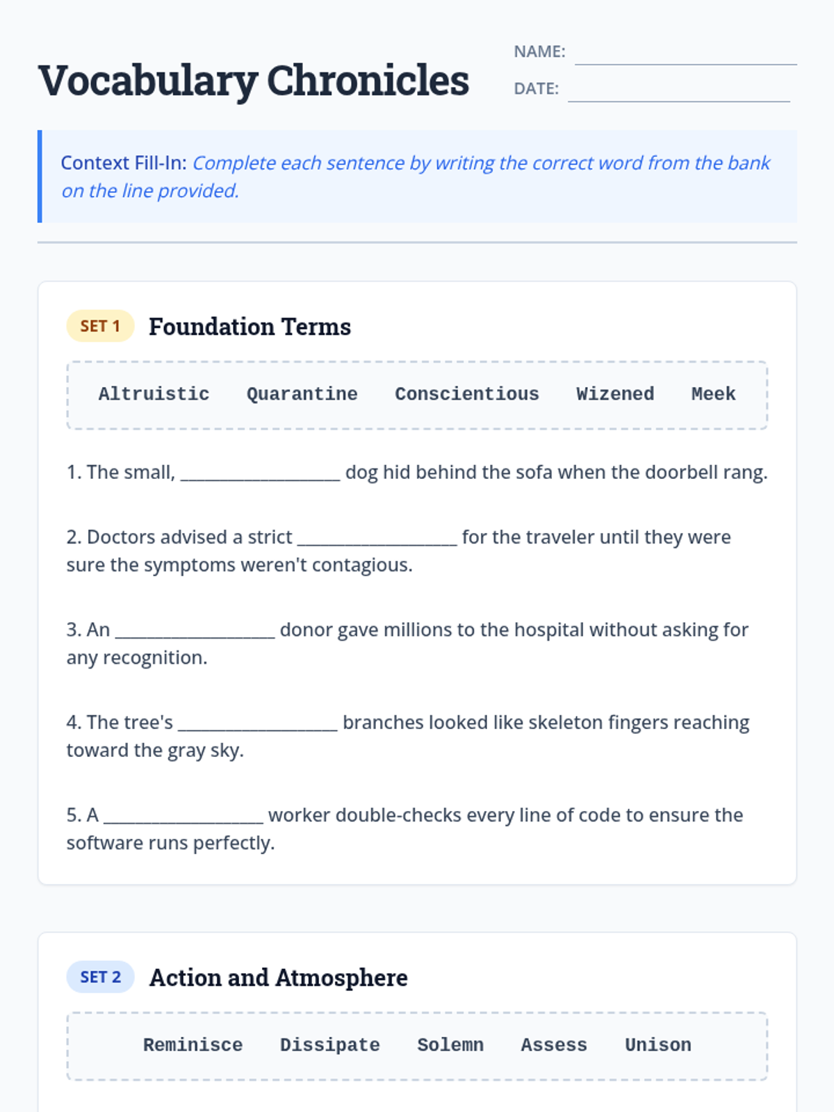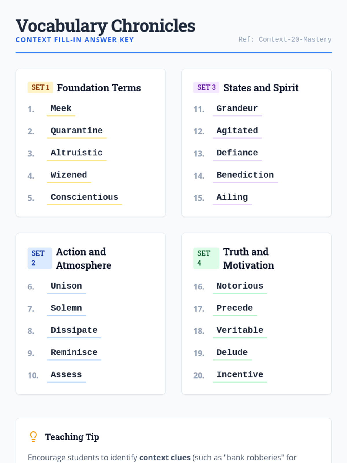 A comprehensive vocabulary study focusing on 20 key terms from historical and literary contexts, featuring word bank exercises and multiple-choice assessments.