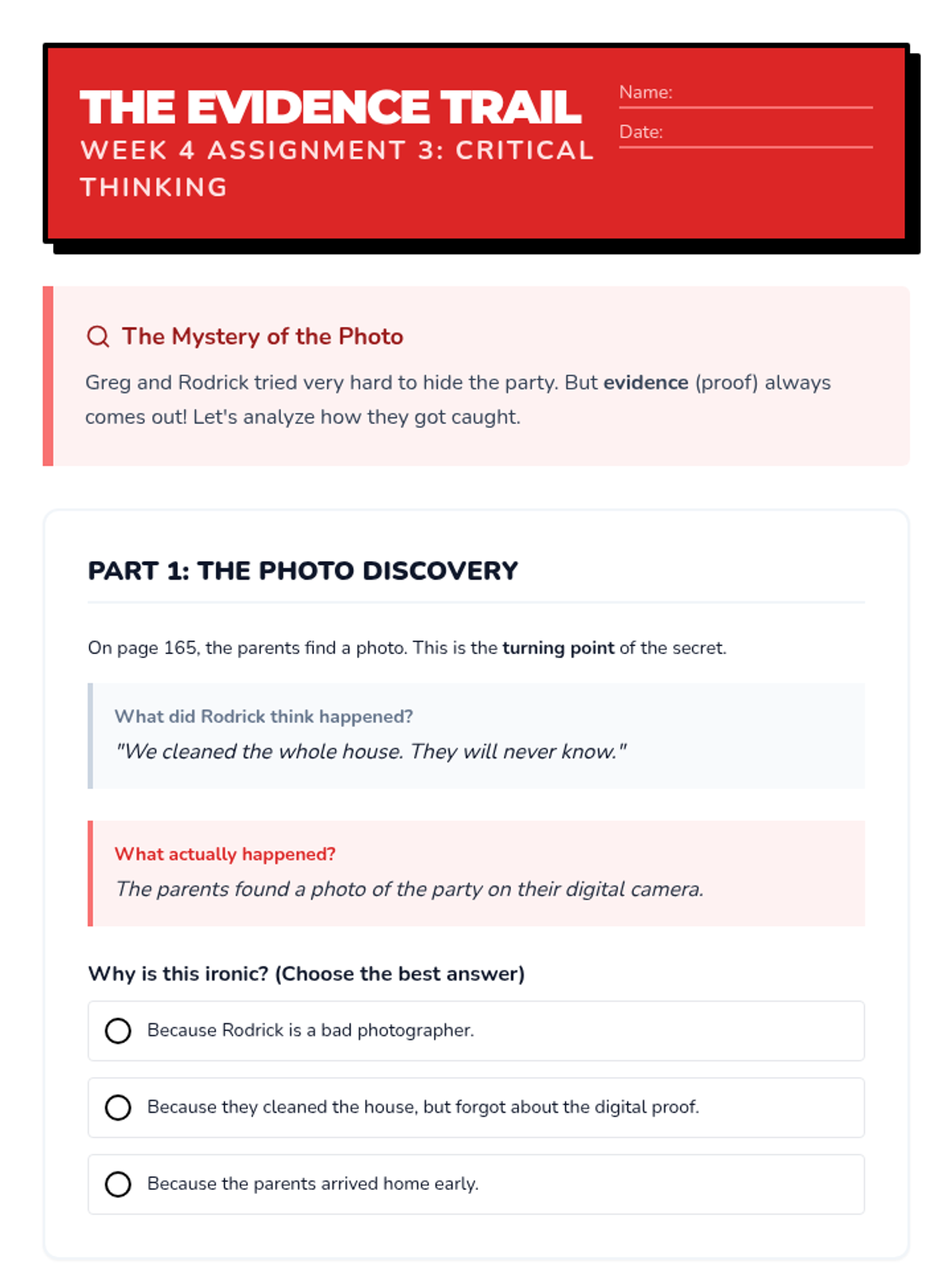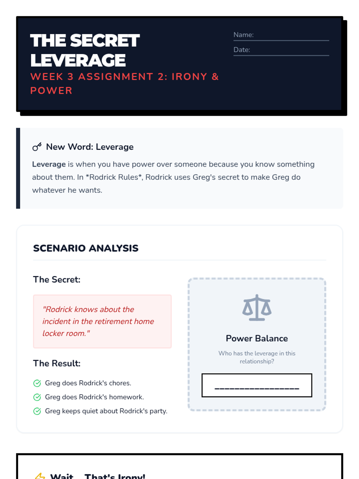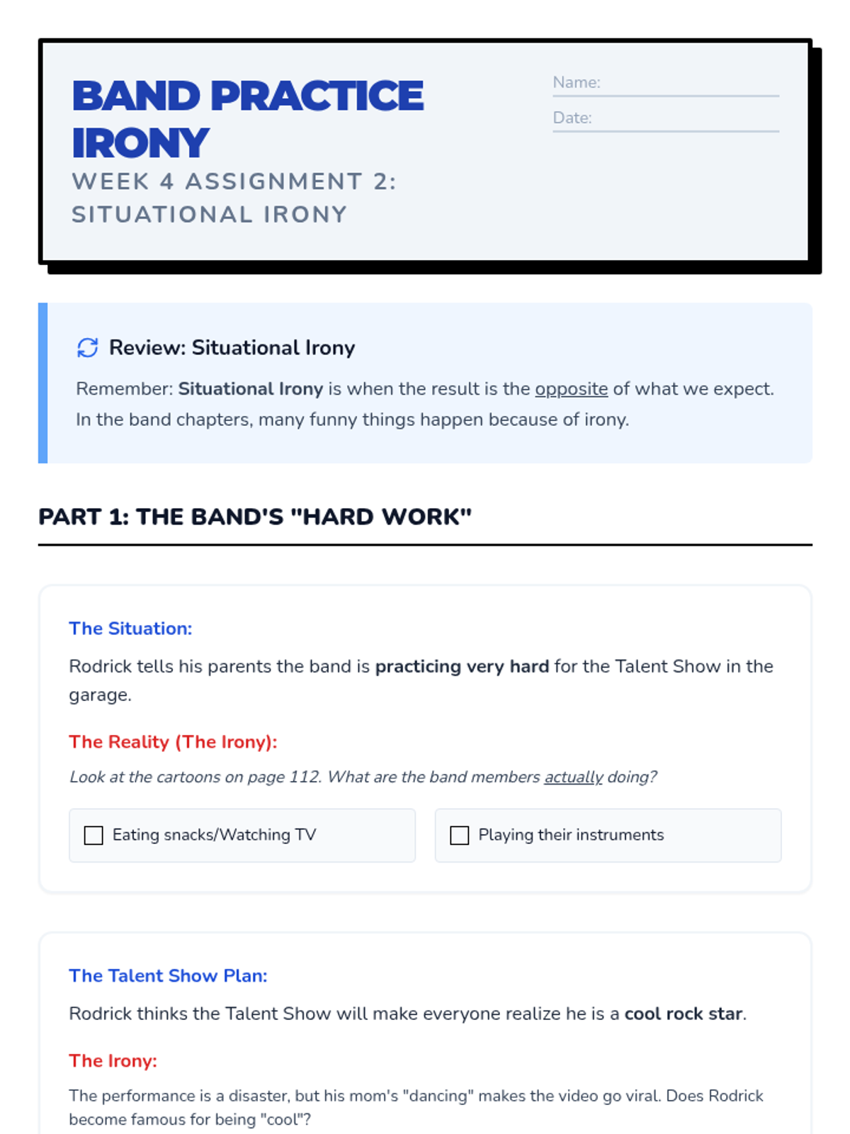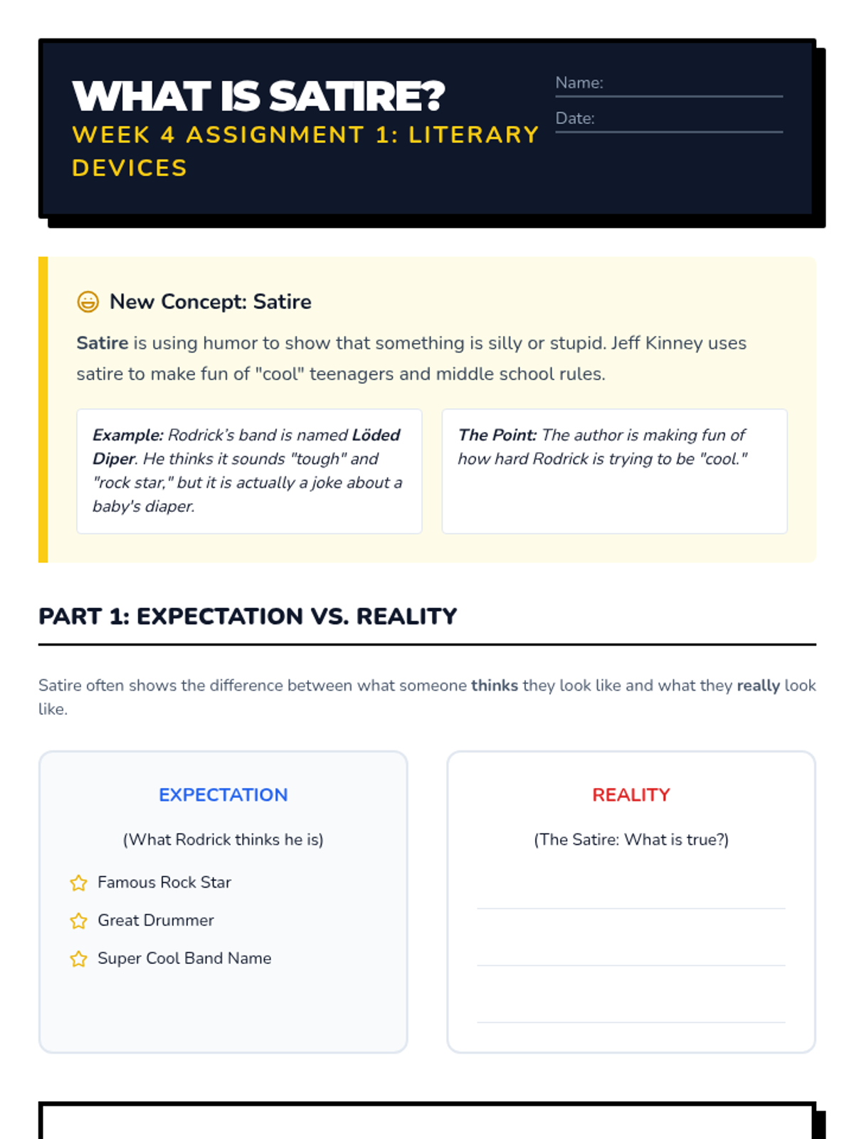 Analysis of Rodrick's band 'Löded Diper' and the concept of satire. Students explore how Greg's attempts to keep secrets often lead to ironic results.