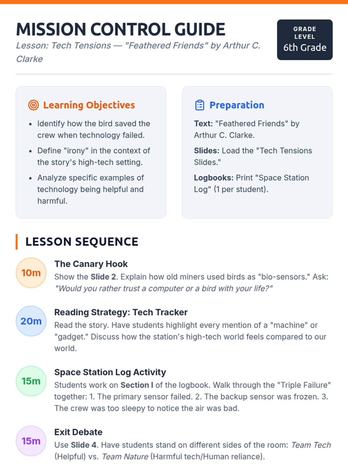 An introductory exploration of Arthur C. Clarke's 'Feathered Friends,' focusing on the dual nature of technology and the vital role of biological indicators in high-tech environments. Students will debate whether technology is ultimately a savior or a source of complacency.