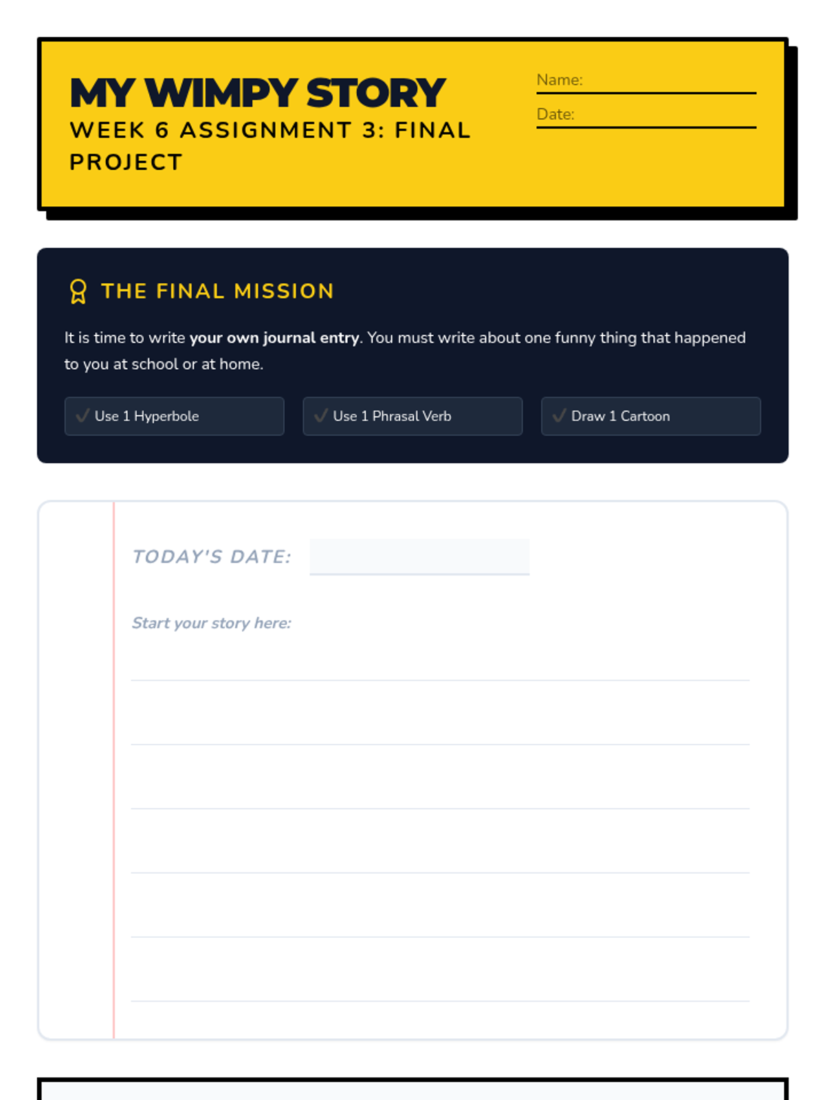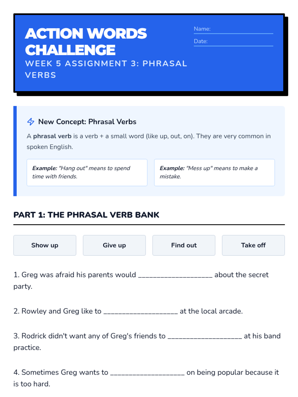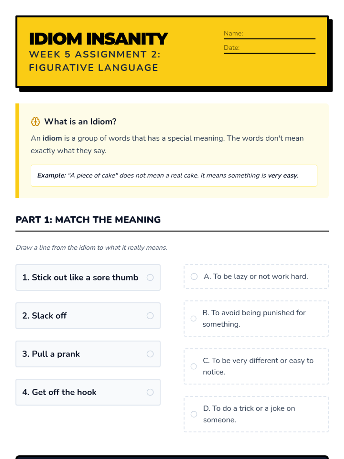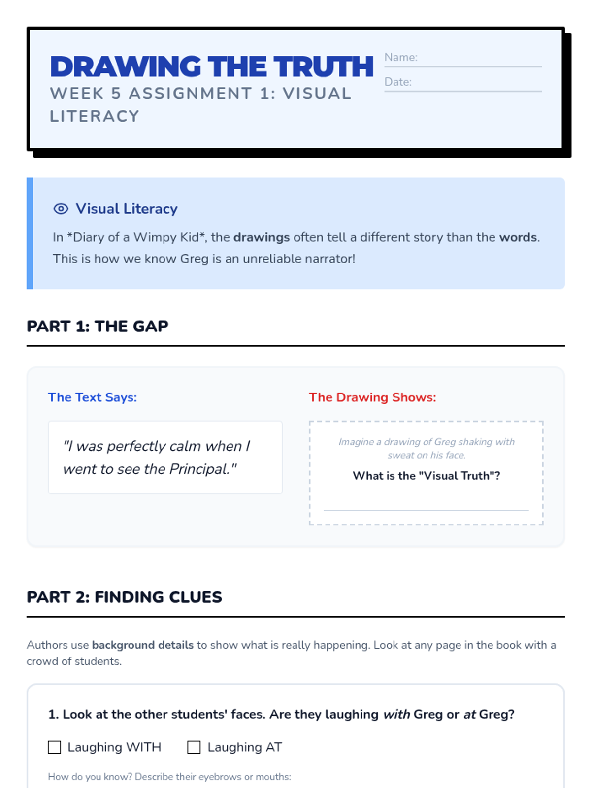 Focus on visual literacy, context clues in illustrations, and idioms/phrasal verbs common in American middle school culture.