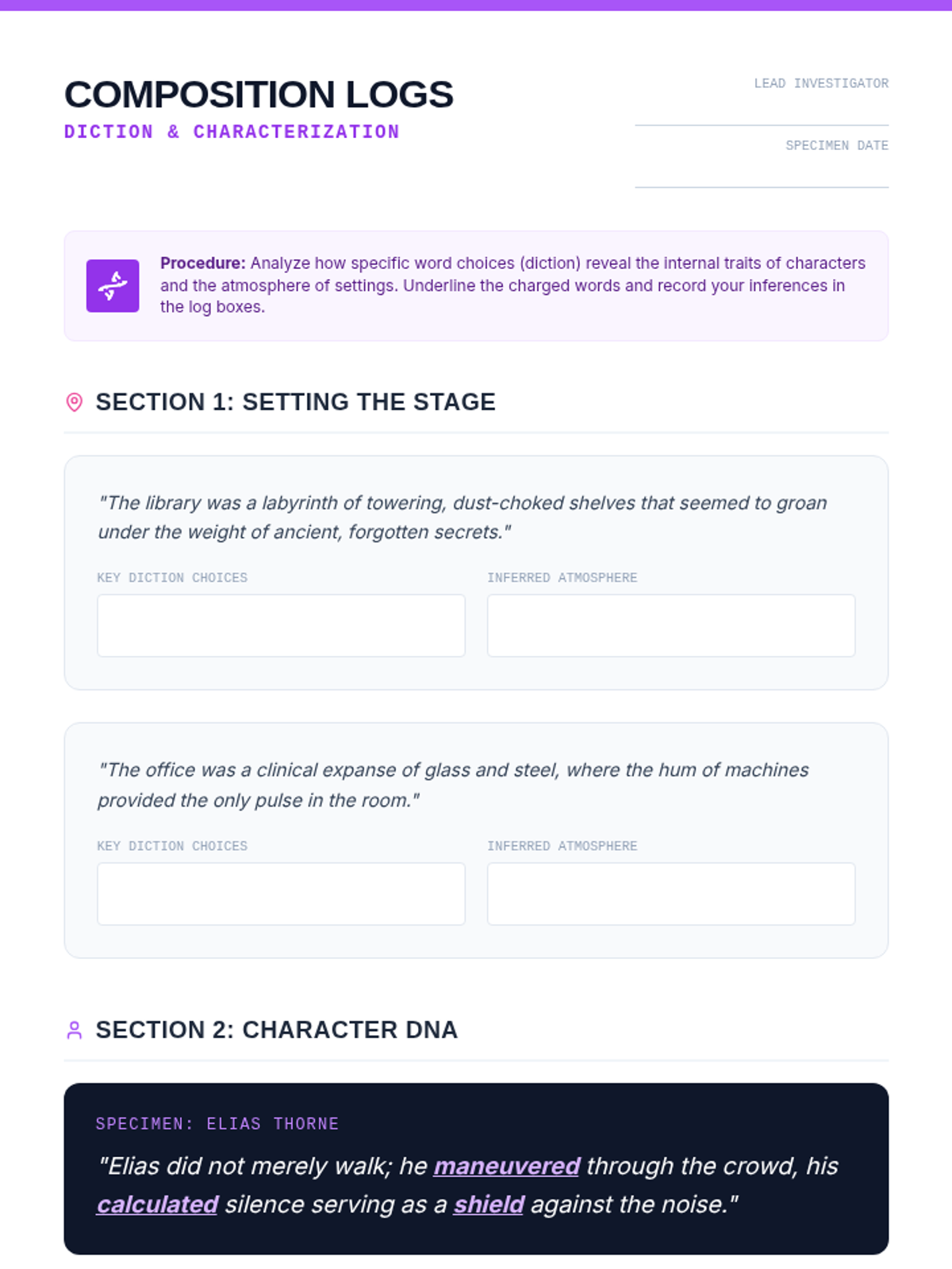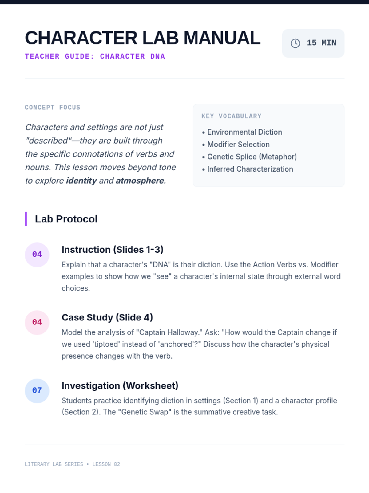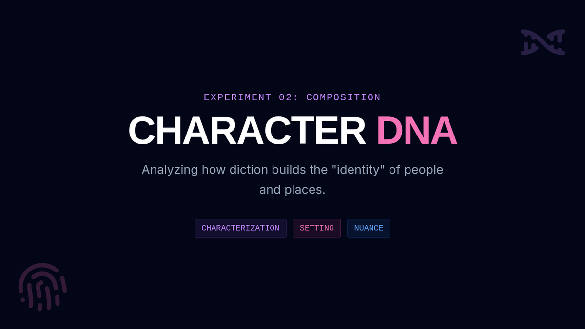 A 15-minute mini-lesson exploring how diction acts as the 'genetic material' of a story, building vivid settings and complex characters through precise word choice.
