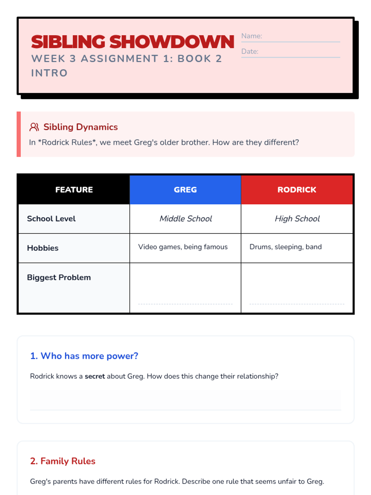 Transition to the second book. Focus on sibling relationships and the introduction of situational irony regarding Rodrick's 'leverage' over Greg.