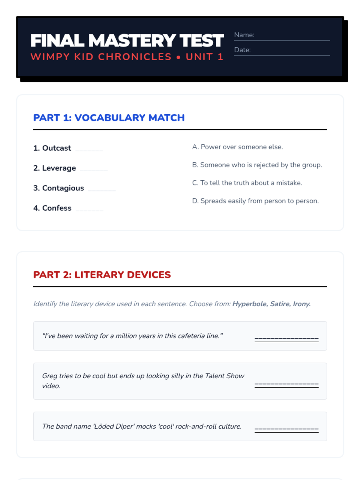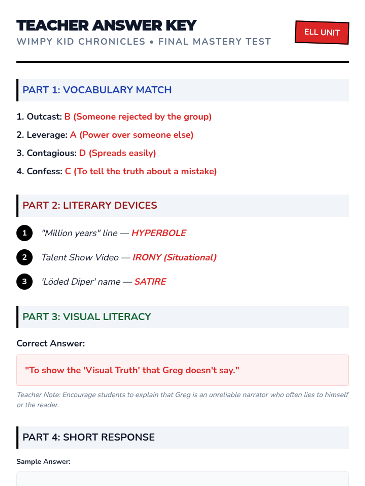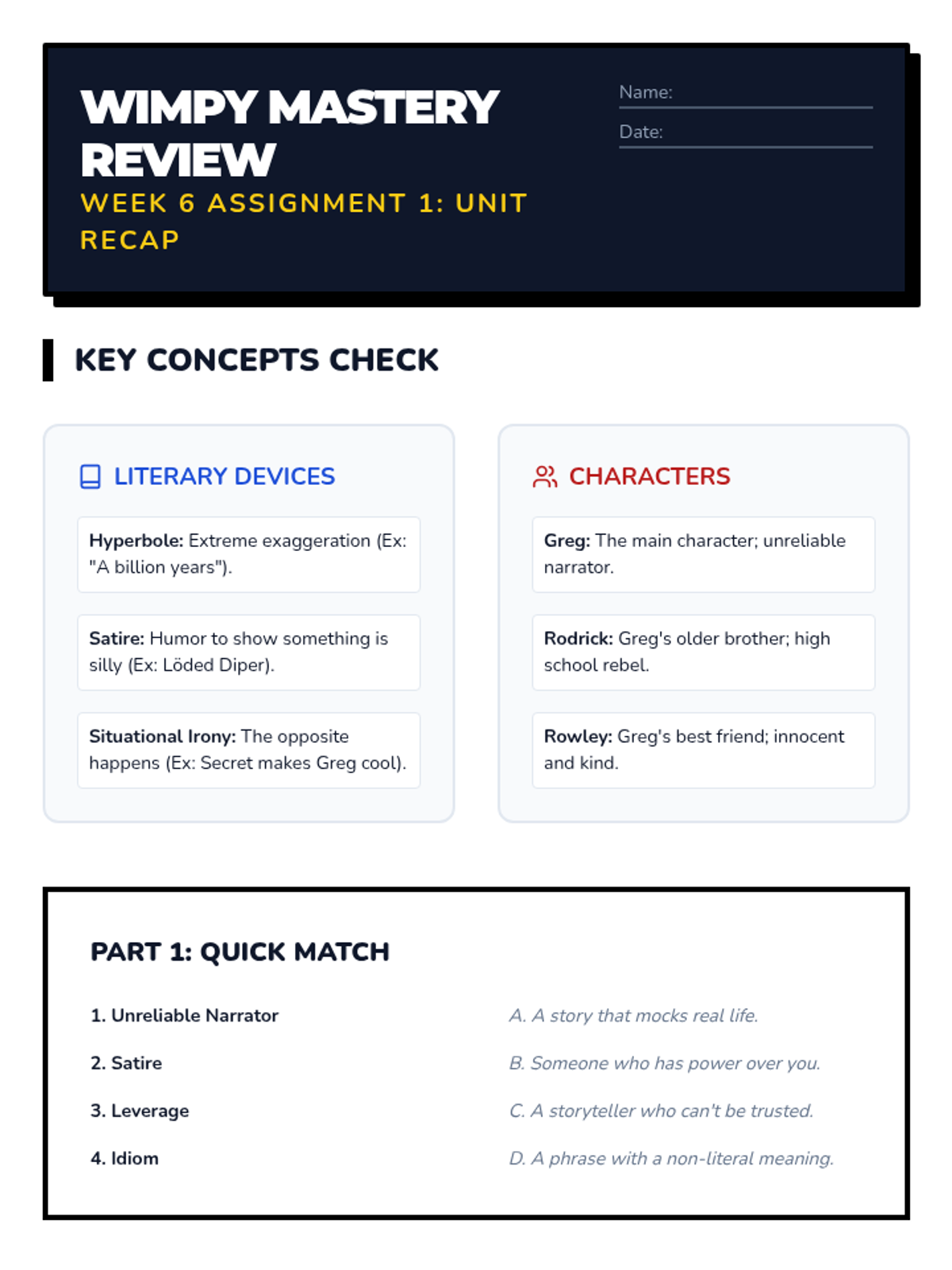 Review of key literary devices and characters. Final unit assessment focusing on vocabulary and theme identification.