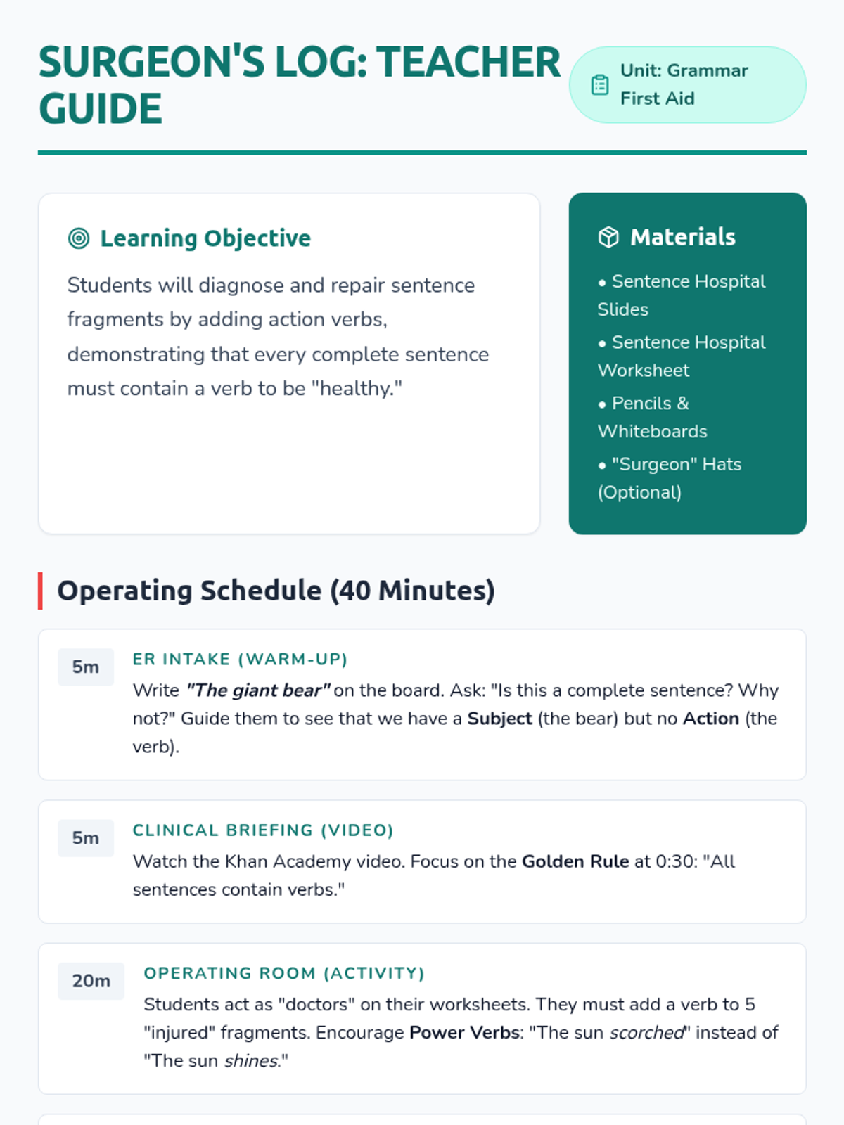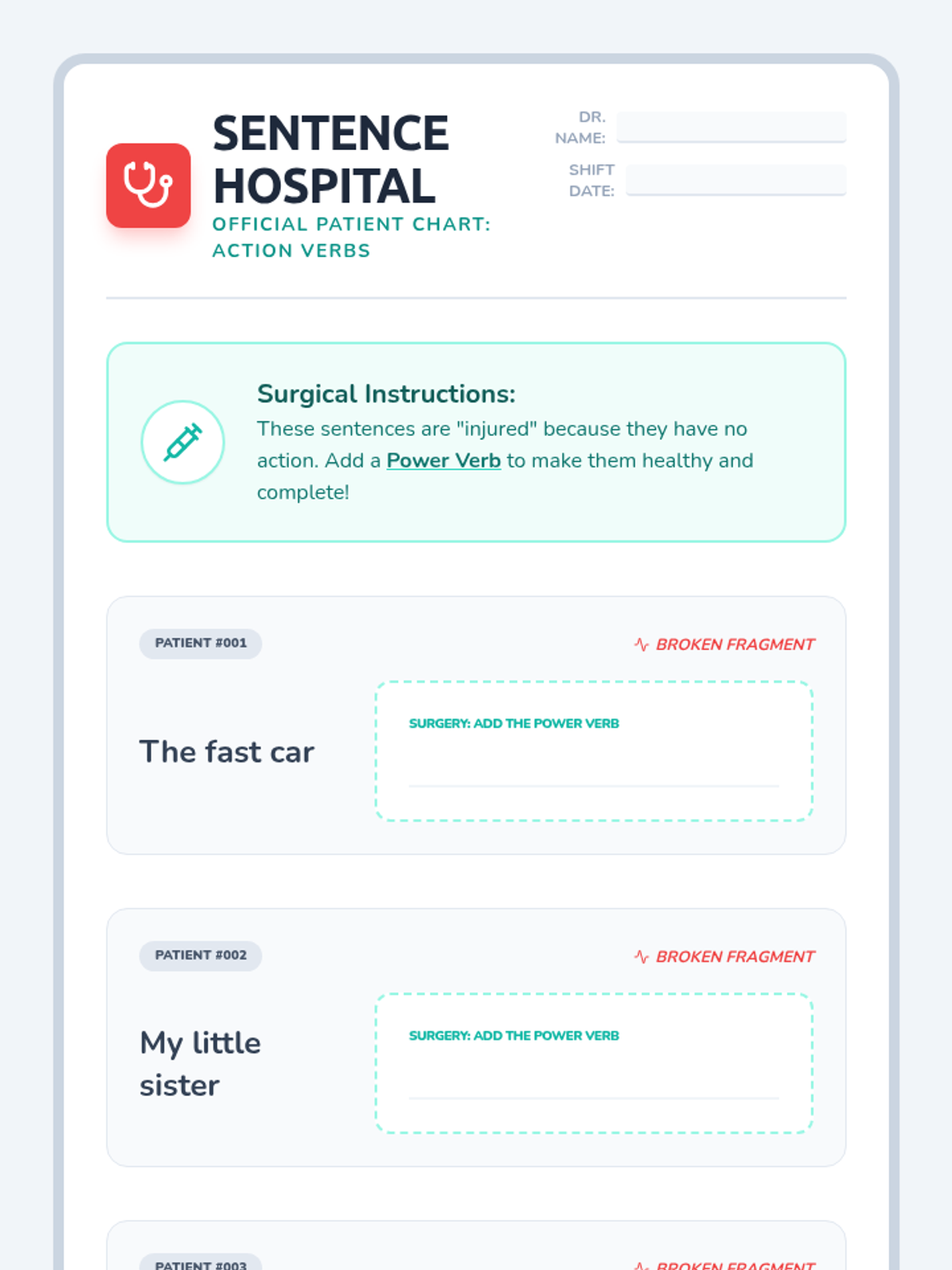Students act as "sentence doctors" to diagnose and repair fragments by adding action verbs, exploring how verbs bring sentences to life.