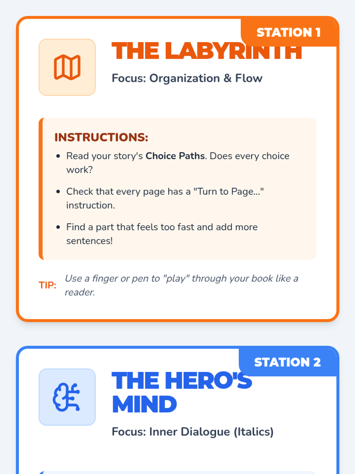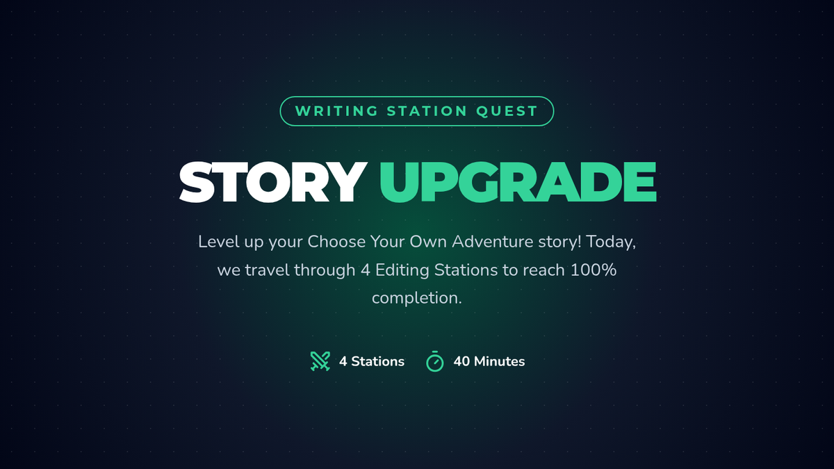 A series of interactive editing stations designed for fourth graders to polish their Choose Your Own Adventure stories, focusing on organization, inner dialogue, sensory details, and punctuation.