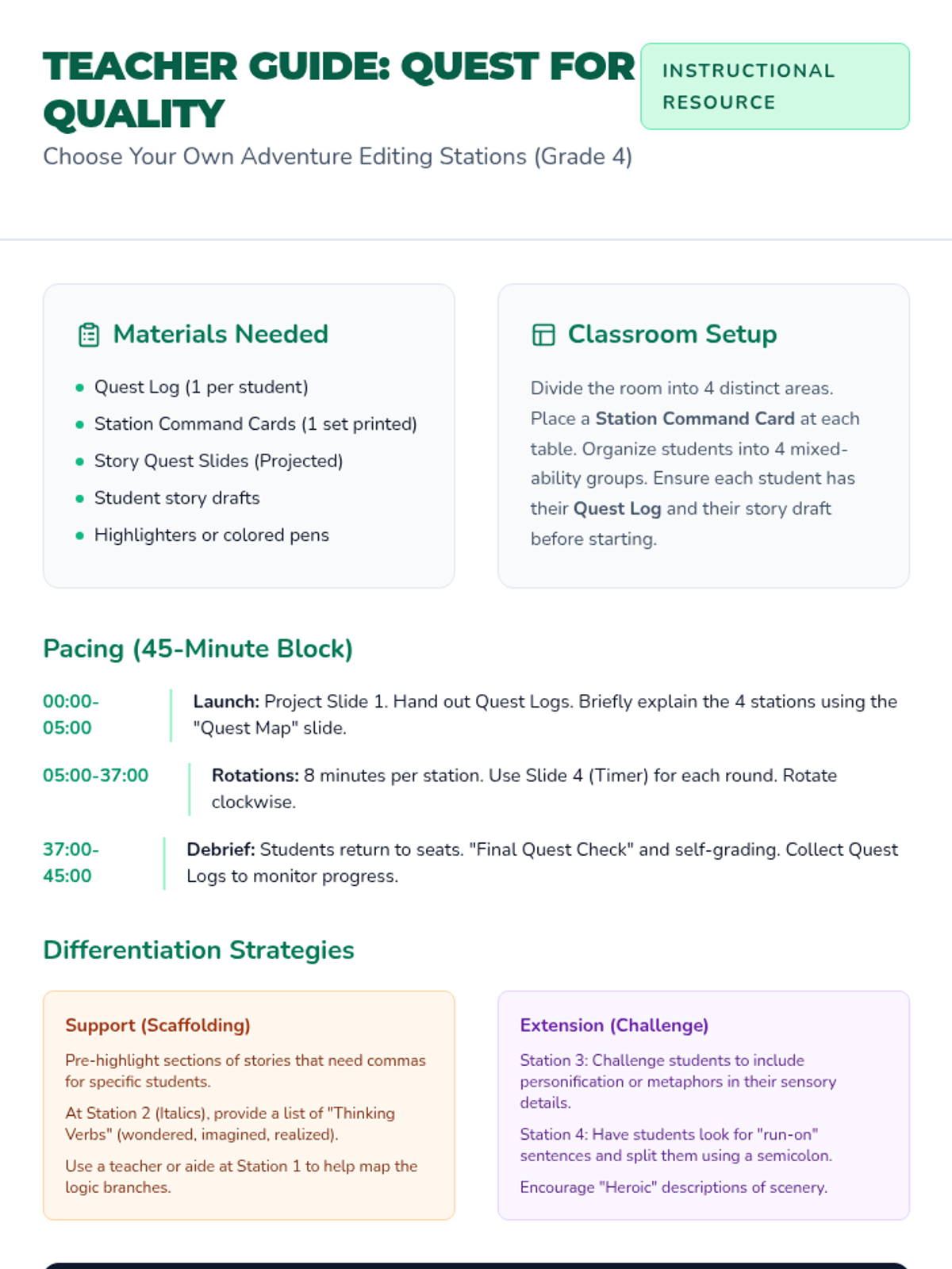 A comprehensive lesson designed to help 3rd-5th grade students master the art of paragraph construction through a fun, retro video game theme. Students will learn about sentence variety, topic sentences, and supporting details through interactive slides, a card-based game, and scaffolded practice.