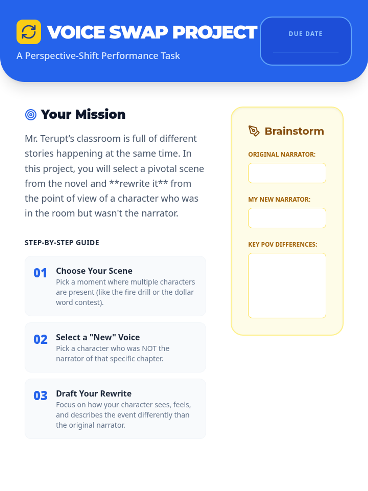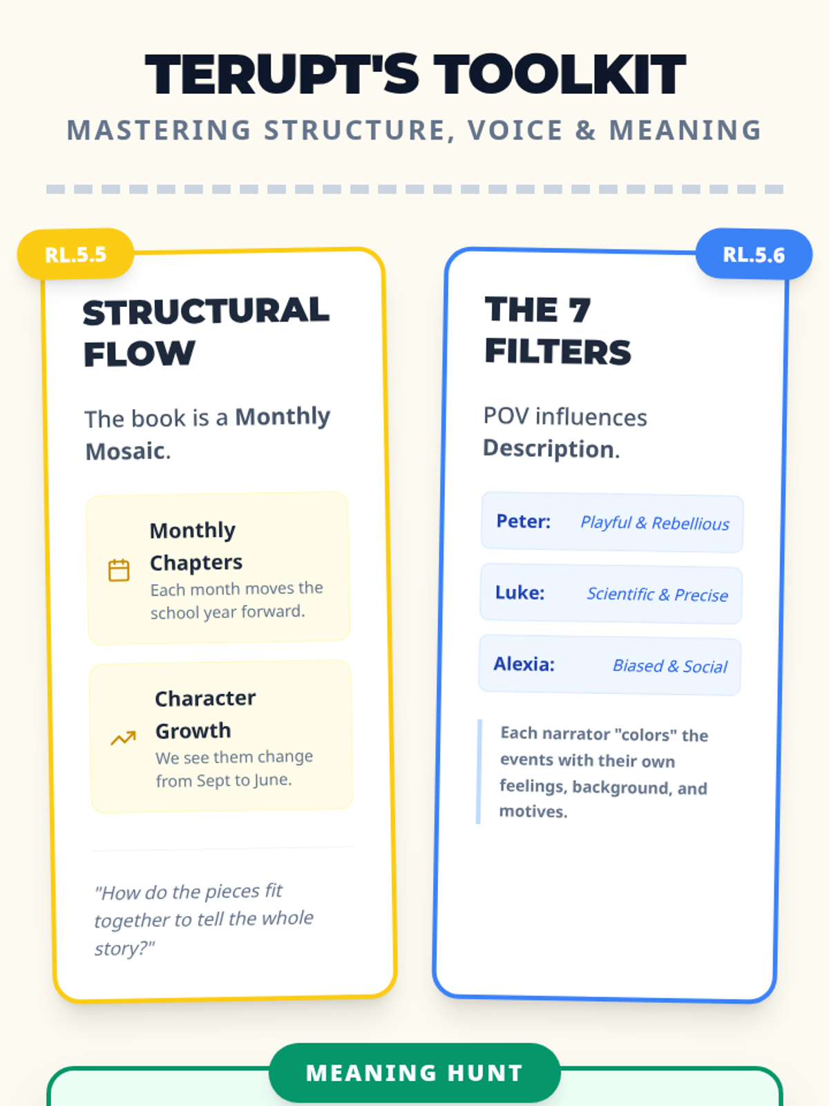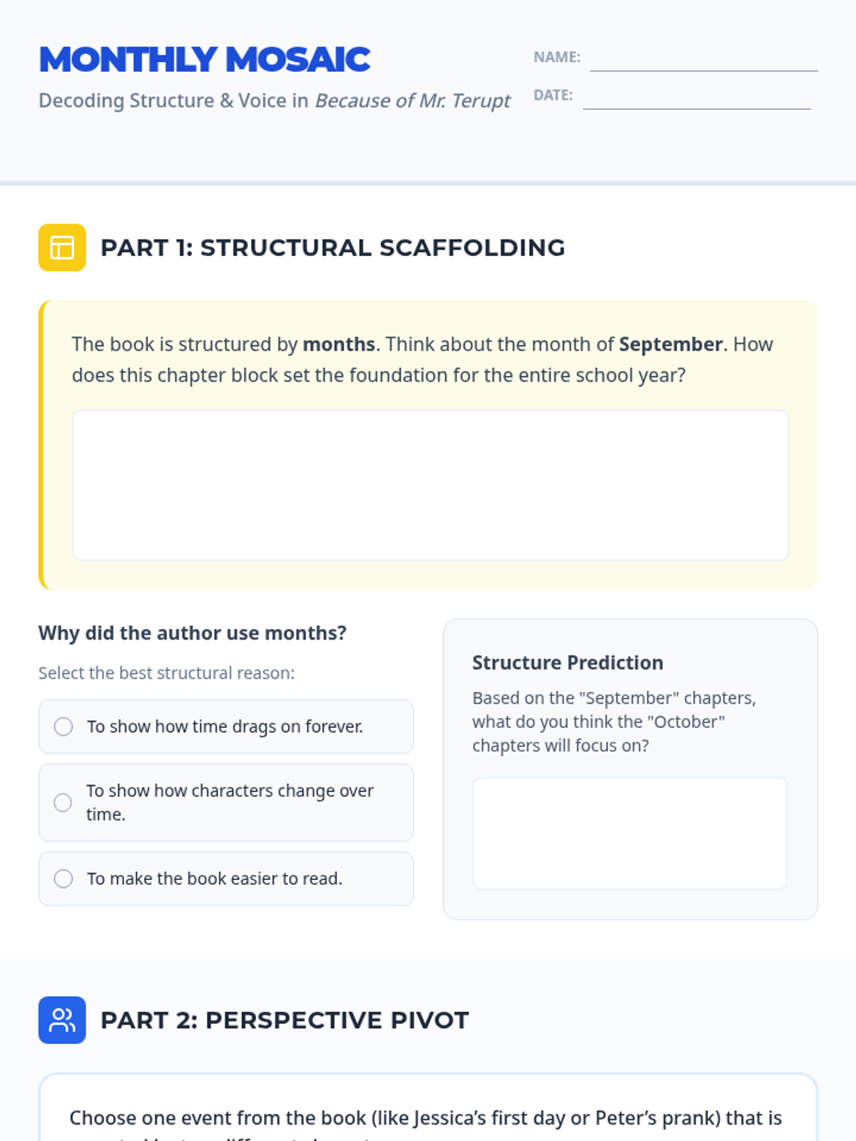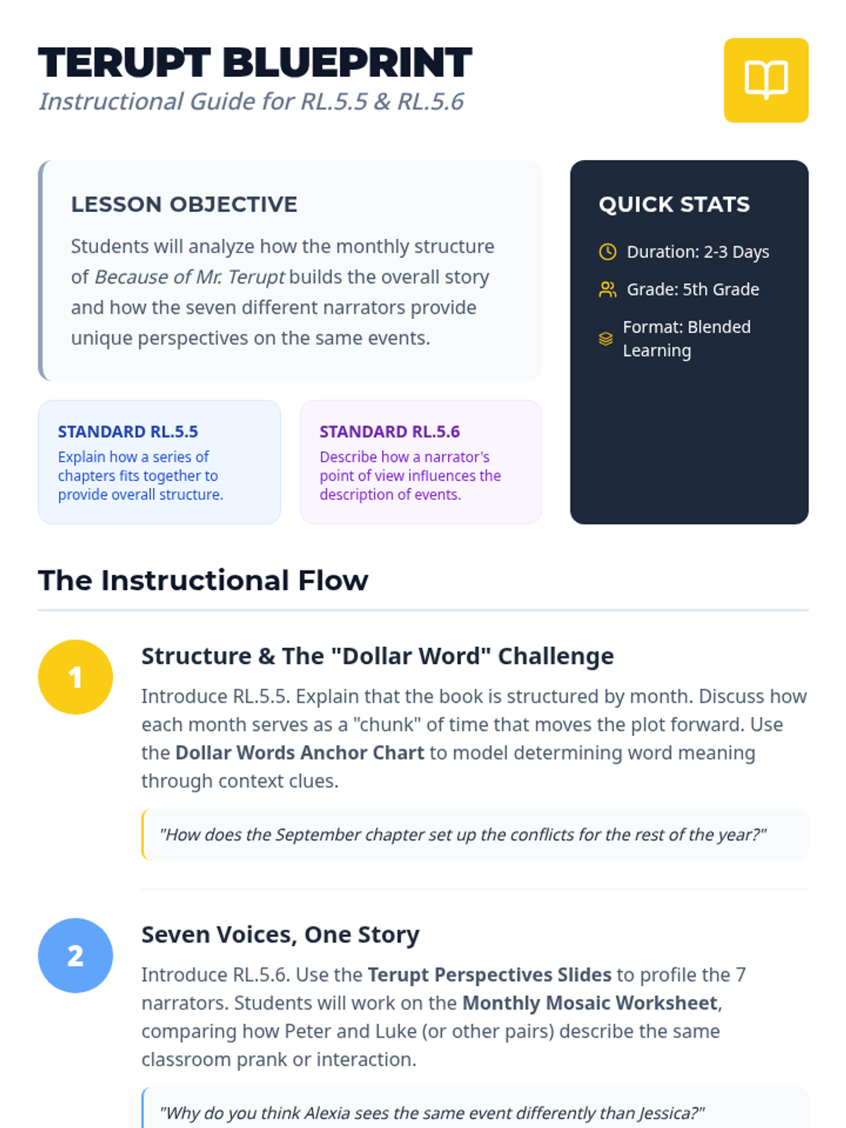 A comprehensive lesson on RL.5.5 and RL.5.6 focusing on how structure and multiple narrators influence the storytelling in 'Because of Mr. Terupt'. Students explore how the monthly chapter structure and seven distinct character perspectives create a cohesive narrative.