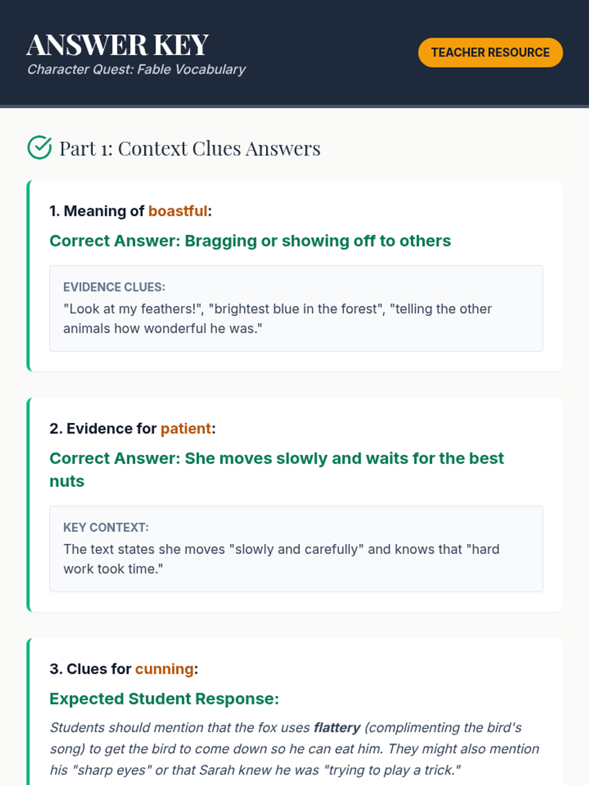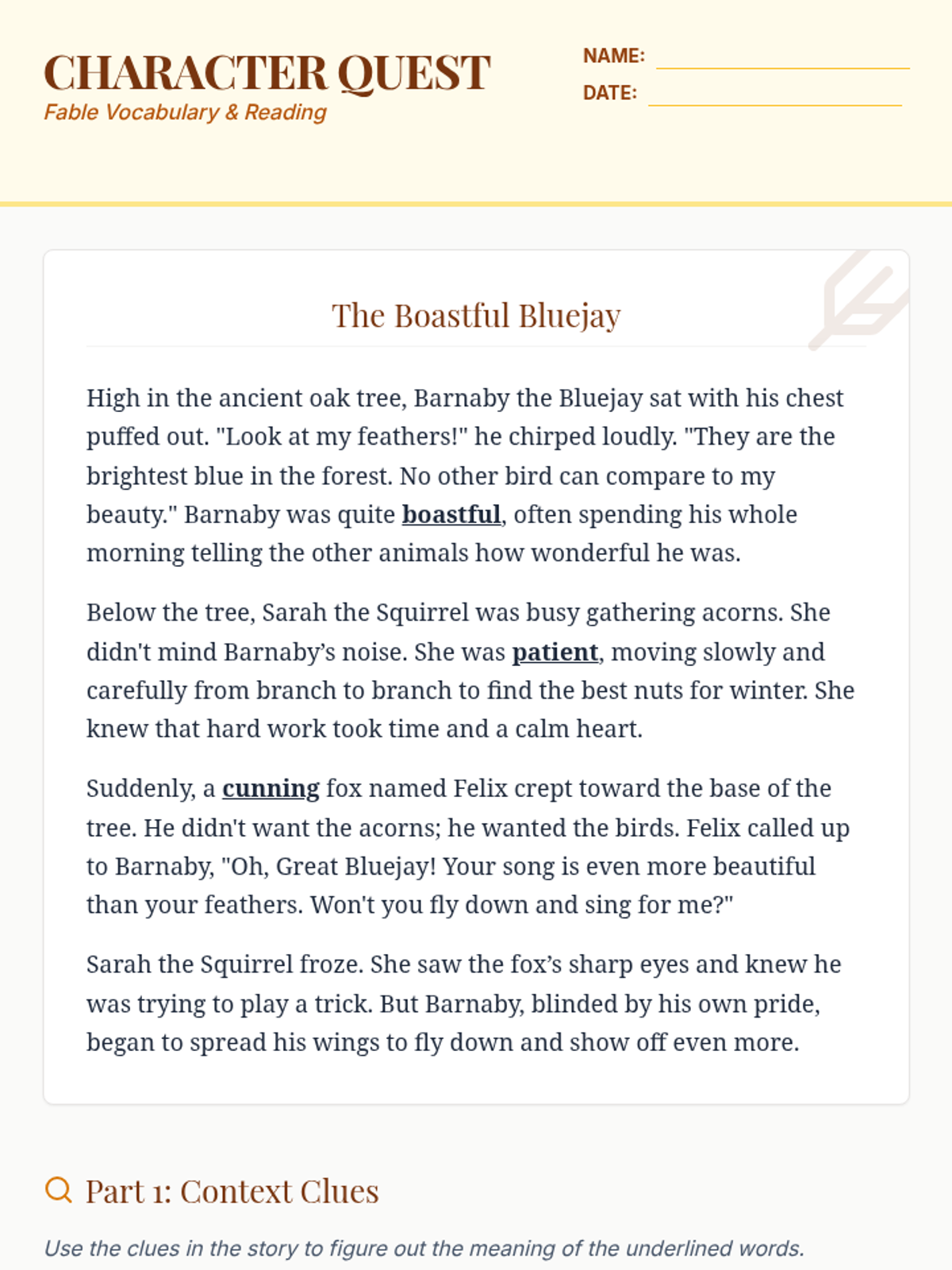 A lesson focused on identifying character traits and using context clues within the genre of fables for 3rd-grade students.