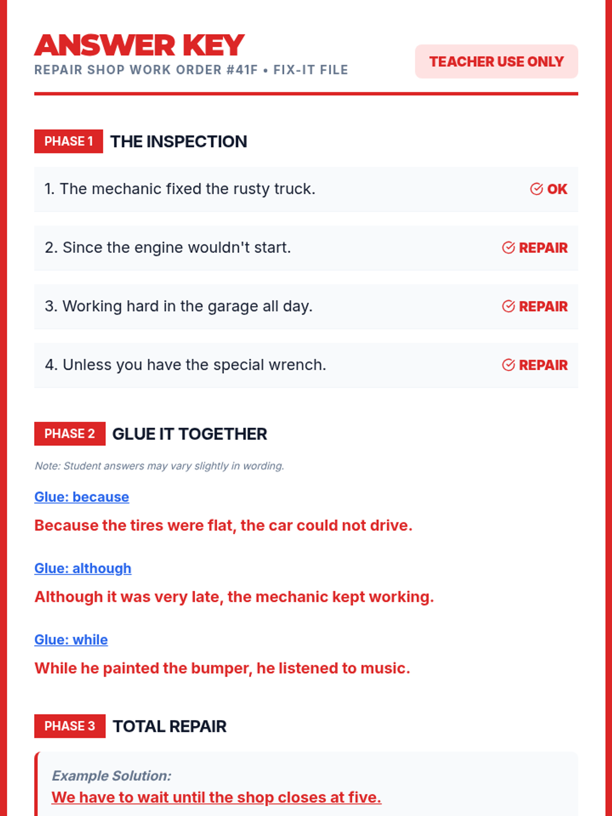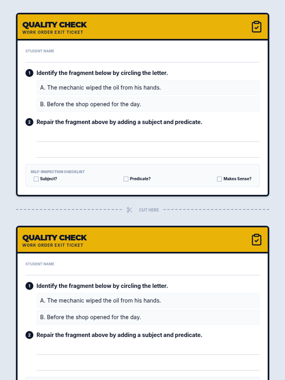 A quick-fire warm-up activity where students visit the 'Sentence Repair Shop' to identify and fix broken sentence fragments. Students use task cards and a job log to demonstrate their mastery of complete sentences.