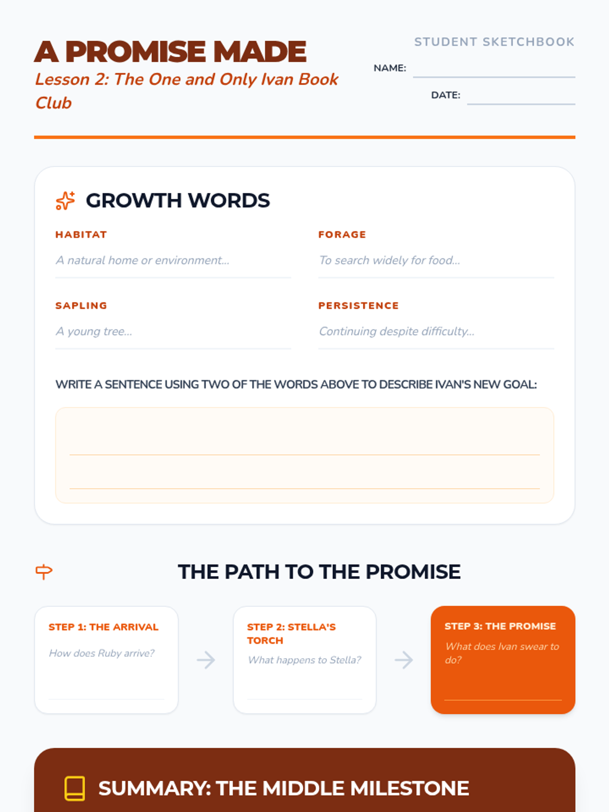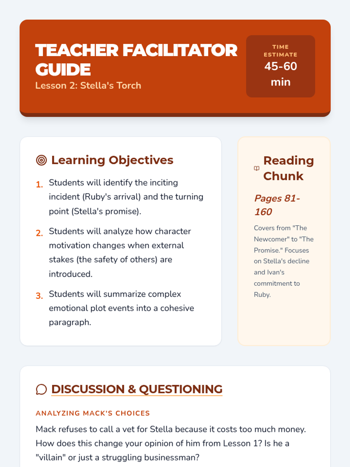 Explores the arrival of Ruby and the passing of Stella, focusing on the turning point where Ivan makes a life-changing promise. Students analyze how character motivations shift in response to new plot events.