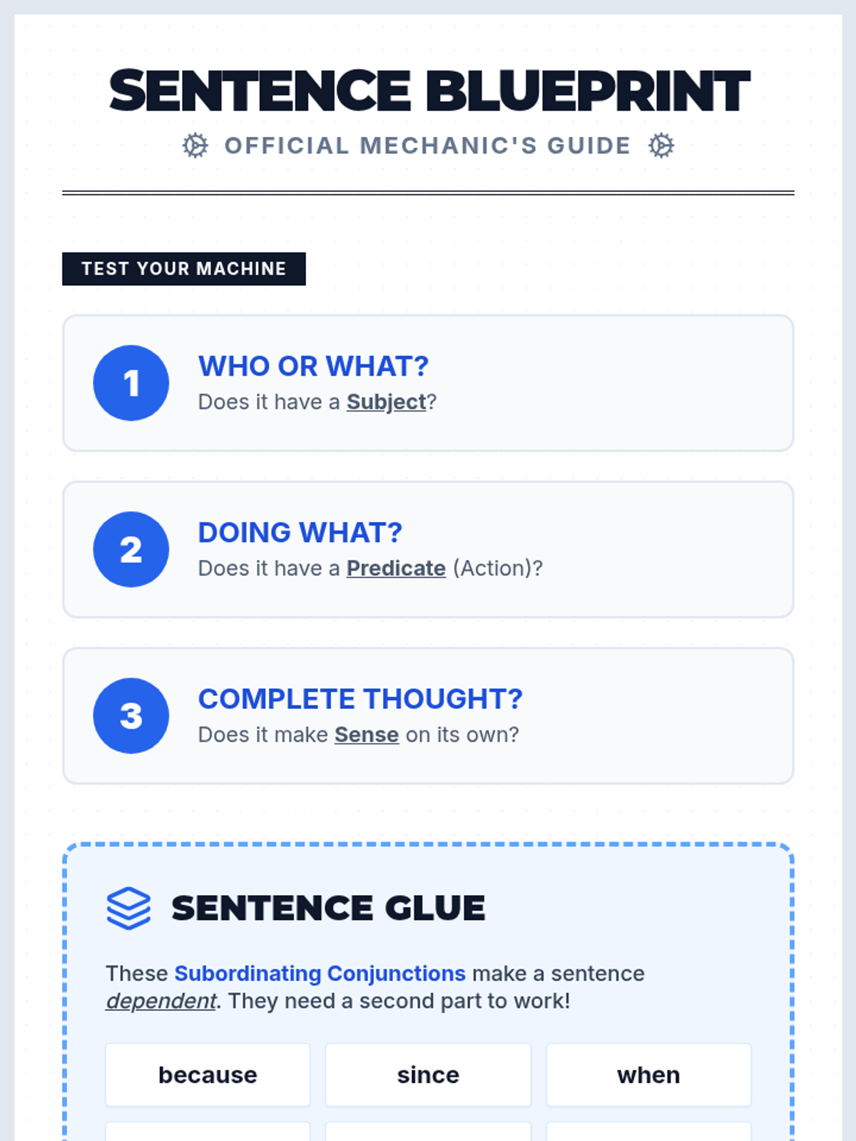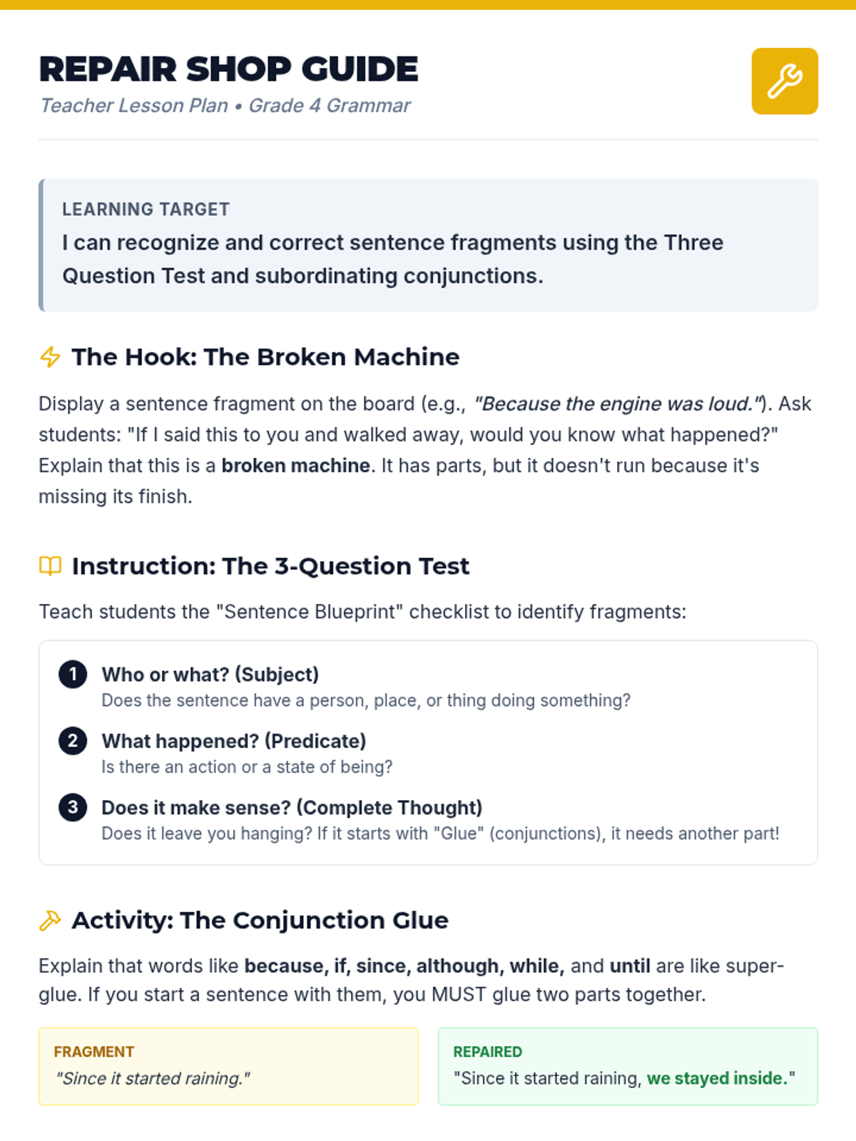 A comprehensive lesson focused on identifying and correcting sentence fragments using the 'Three Question Test' and subordinating conjunctions. Students act as 'Sentence Mechanics' to repair incomplete thoughts.