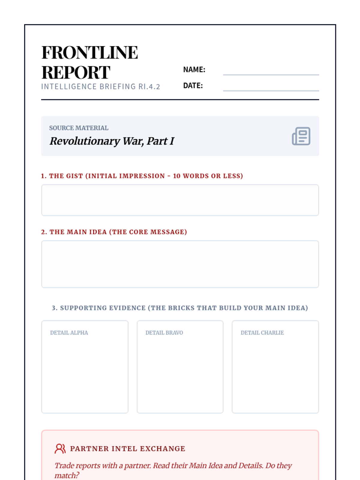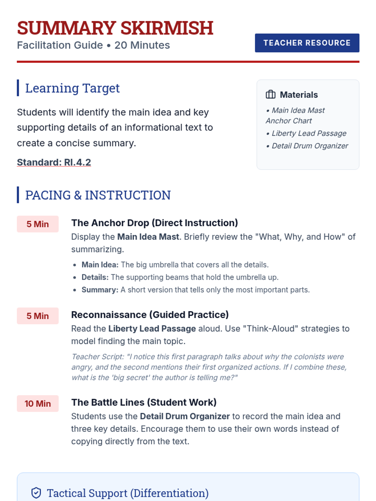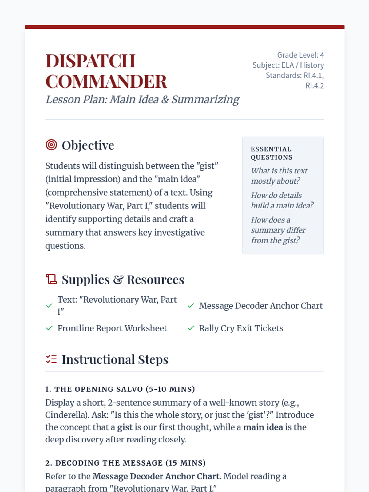 A lesson focusing on identifying the main idea and supporting details in the context of the American Revolutionary War. Students will distinguish between the 'gist' and 'main idea' while practicing summary skills.