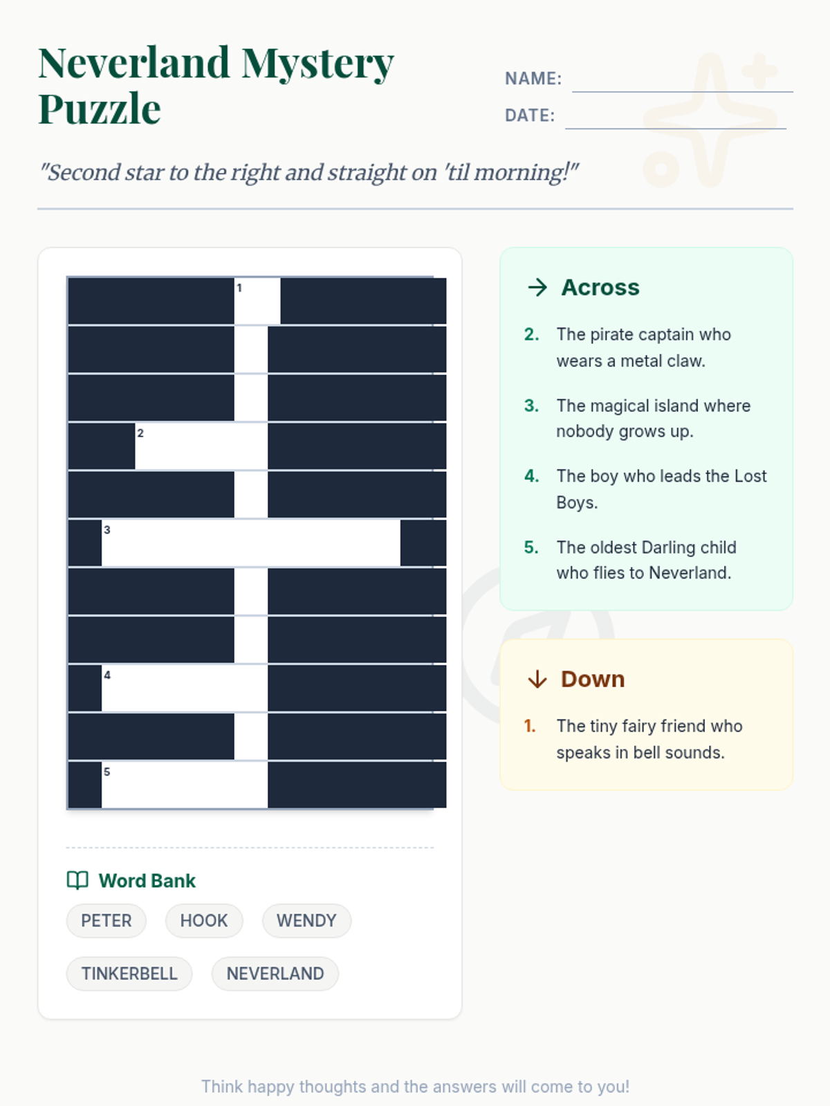 A whimsical lesson exploring the characters, setting, and key themes of J.M. Barrie's classic story, Peter Pan. Students will engage with the narrative through a crossword puzzle and vocabulary building.
