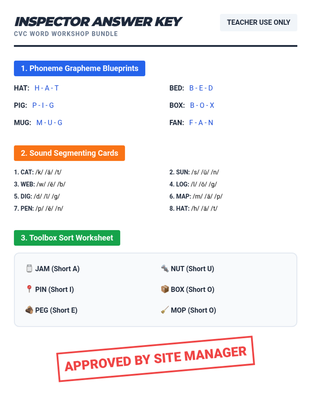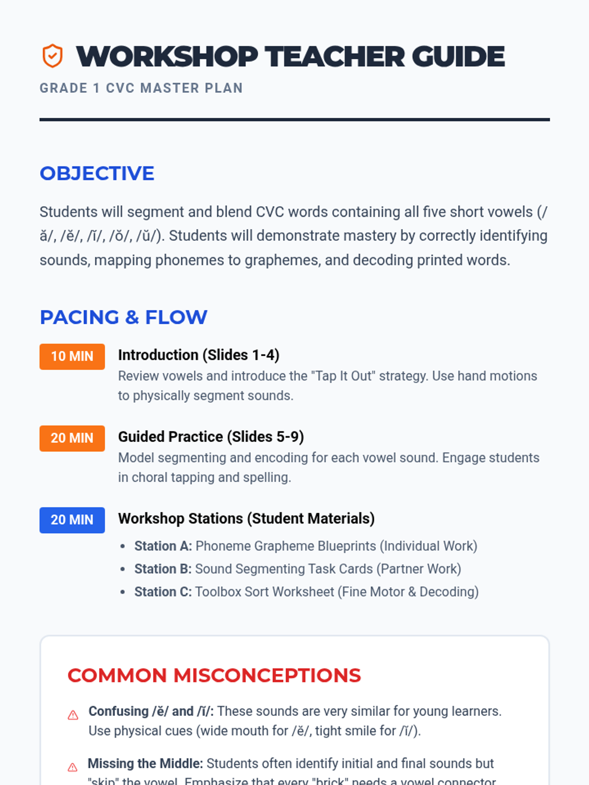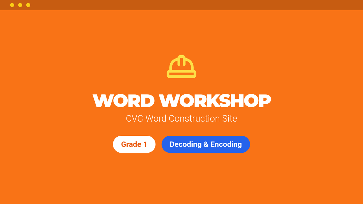 A Grade 1 foundational literacy lesson focused on decoding and encoding CVC words with all five short vowel sounds using a construction-themed 'Word Workshop' approach.