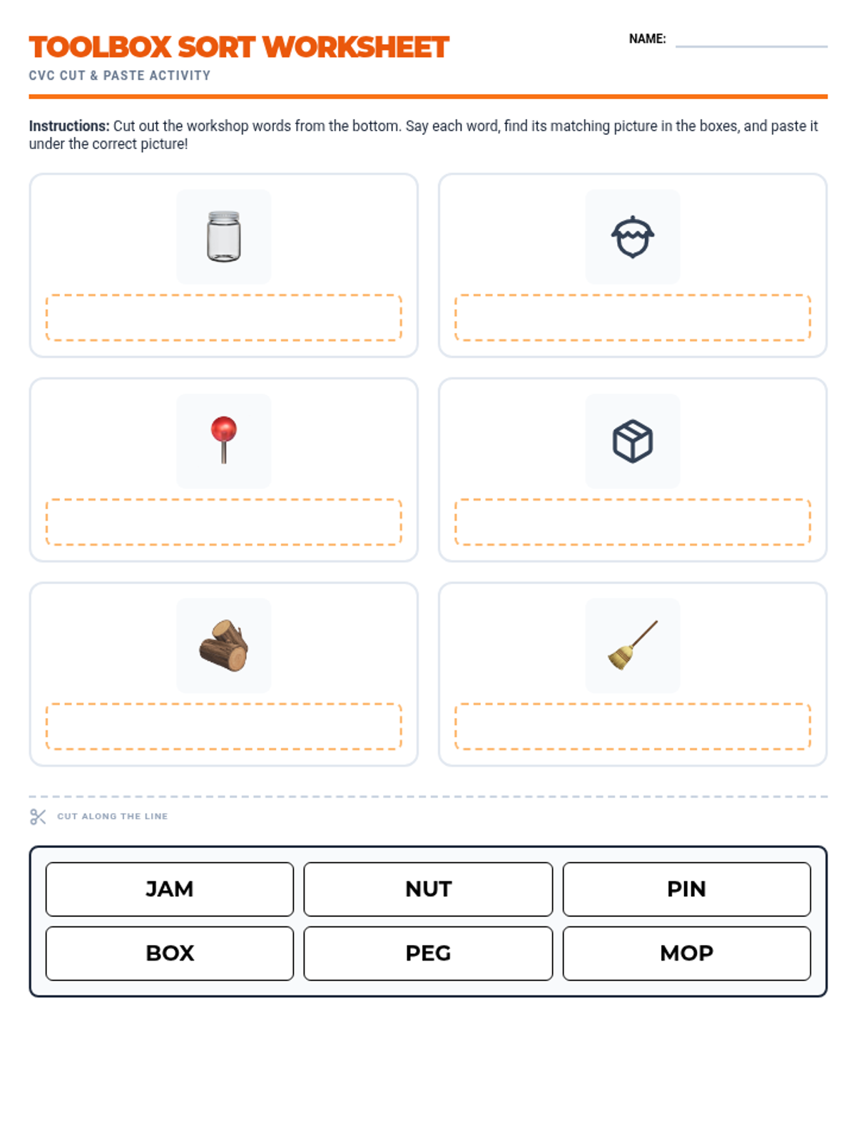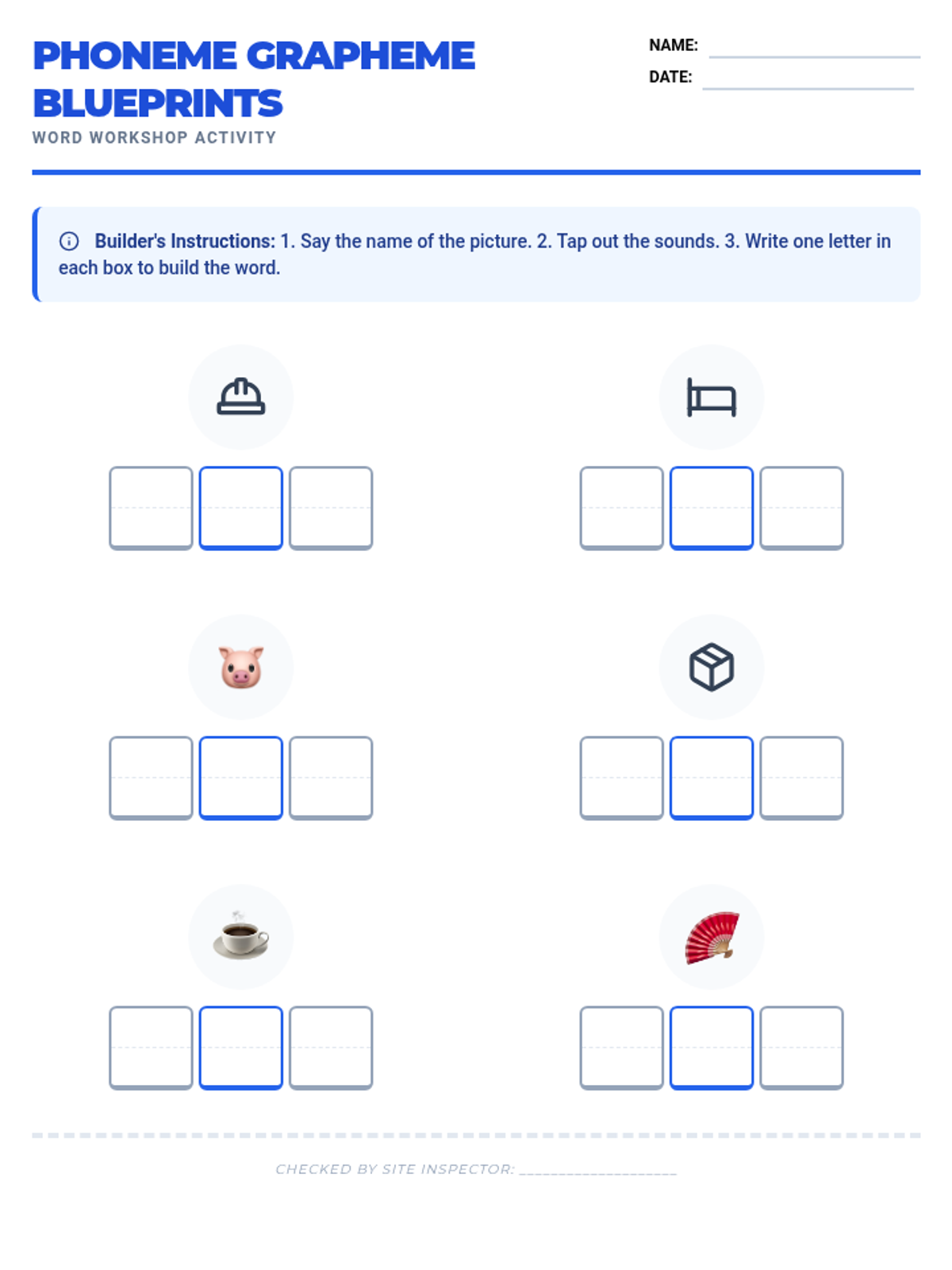 Focuses on reading and spelling CVC words by segmenting sounds and blending them together using visual and kinesthetic cues.