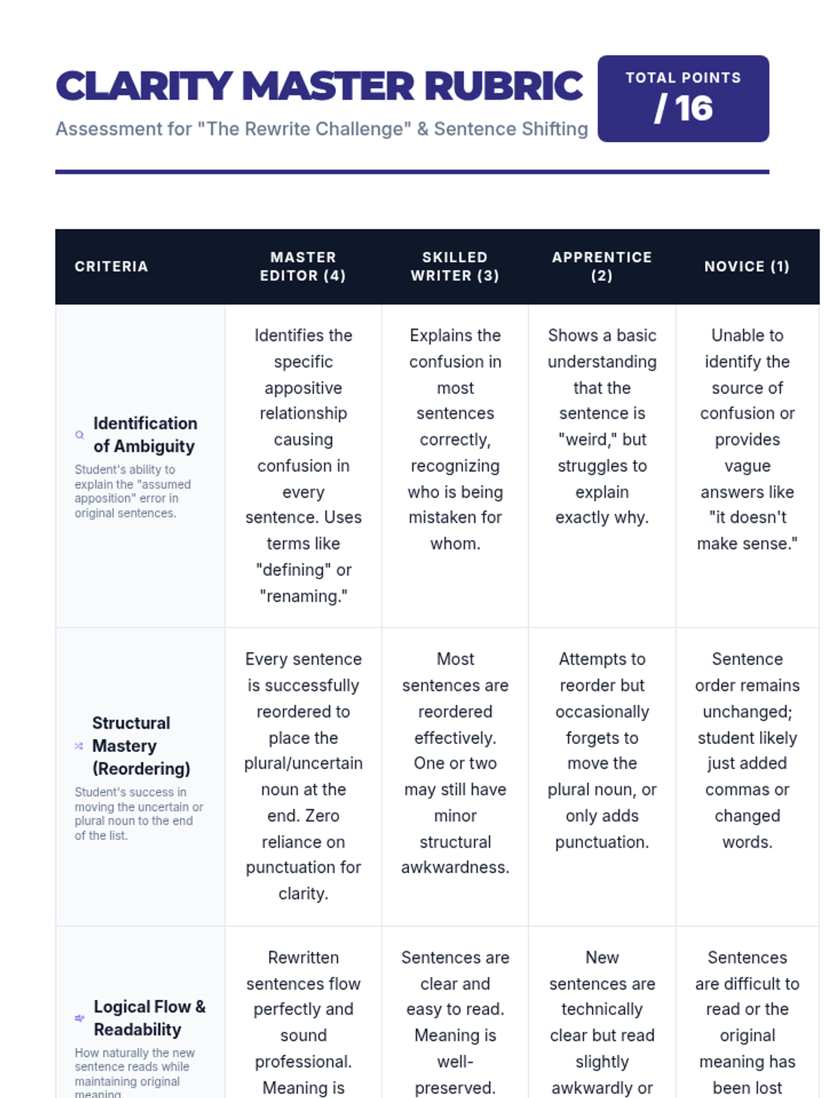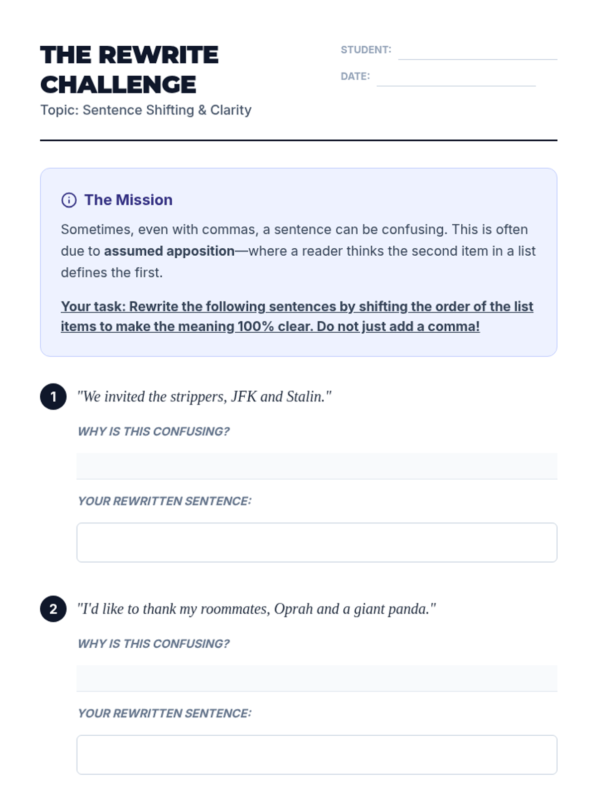 A lesson focusing on avoiding ambiguity in lists through sentence restructuring and reordering, rather than relying solely on the Oxford comma. Students will learn about assumed apposition and practice shifting sentence components for clarity.