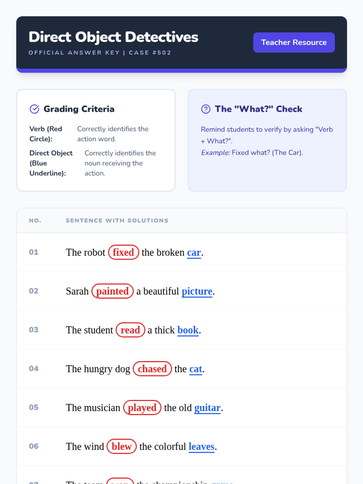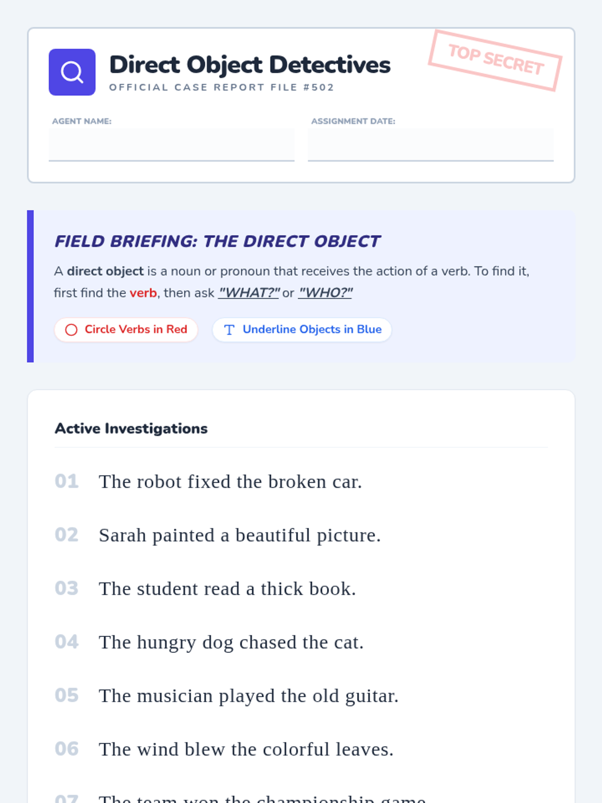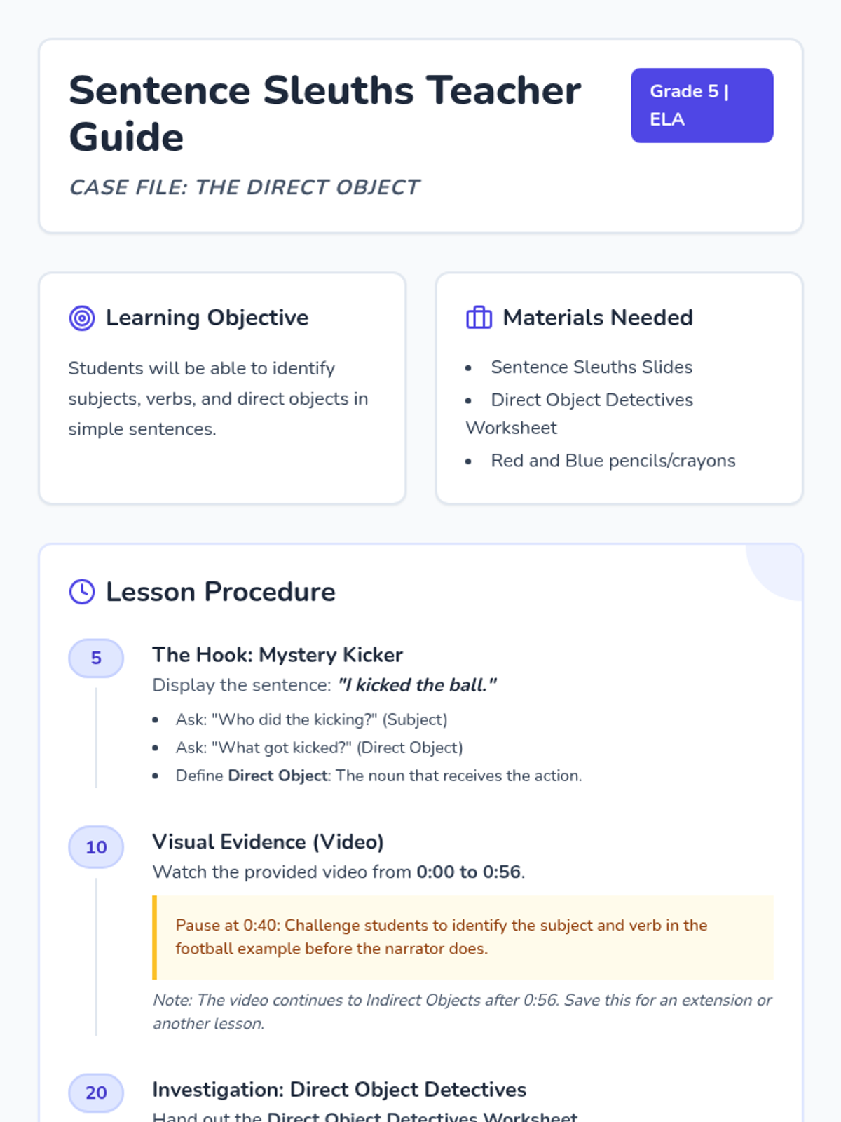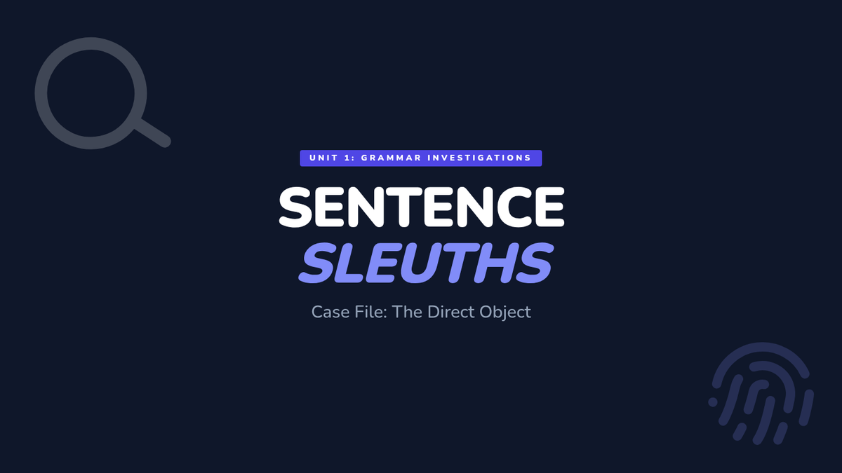 A 5th-grade grammar lesson focusing on identifying subjects, verbs, and direct objects. Students use detective-themed activities to master sentence structure through visual analysis and creative writing.