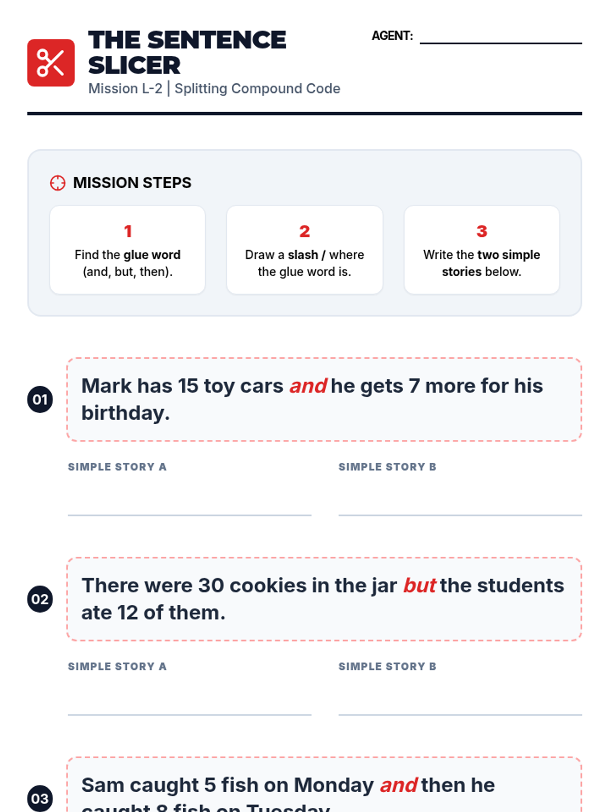 Students learn to break compound sentences into simple, manageable pieces to identify individual mathematical facts within a word problem.