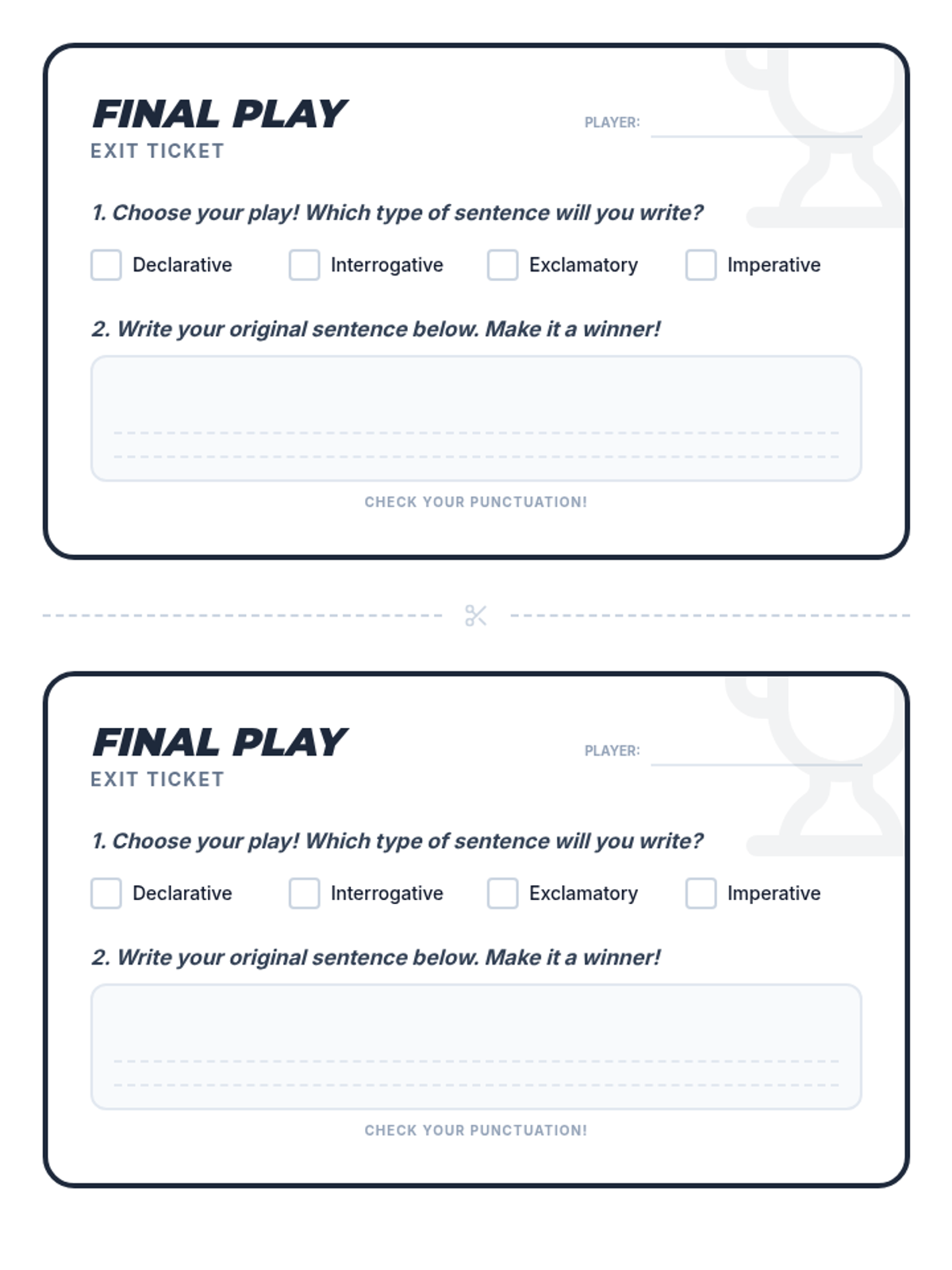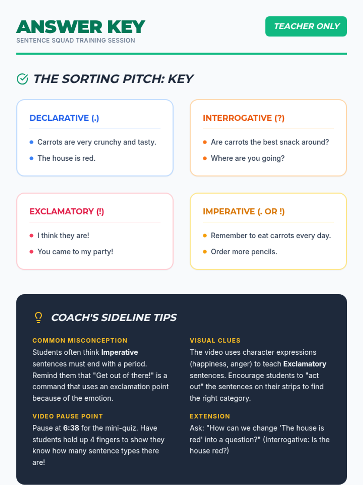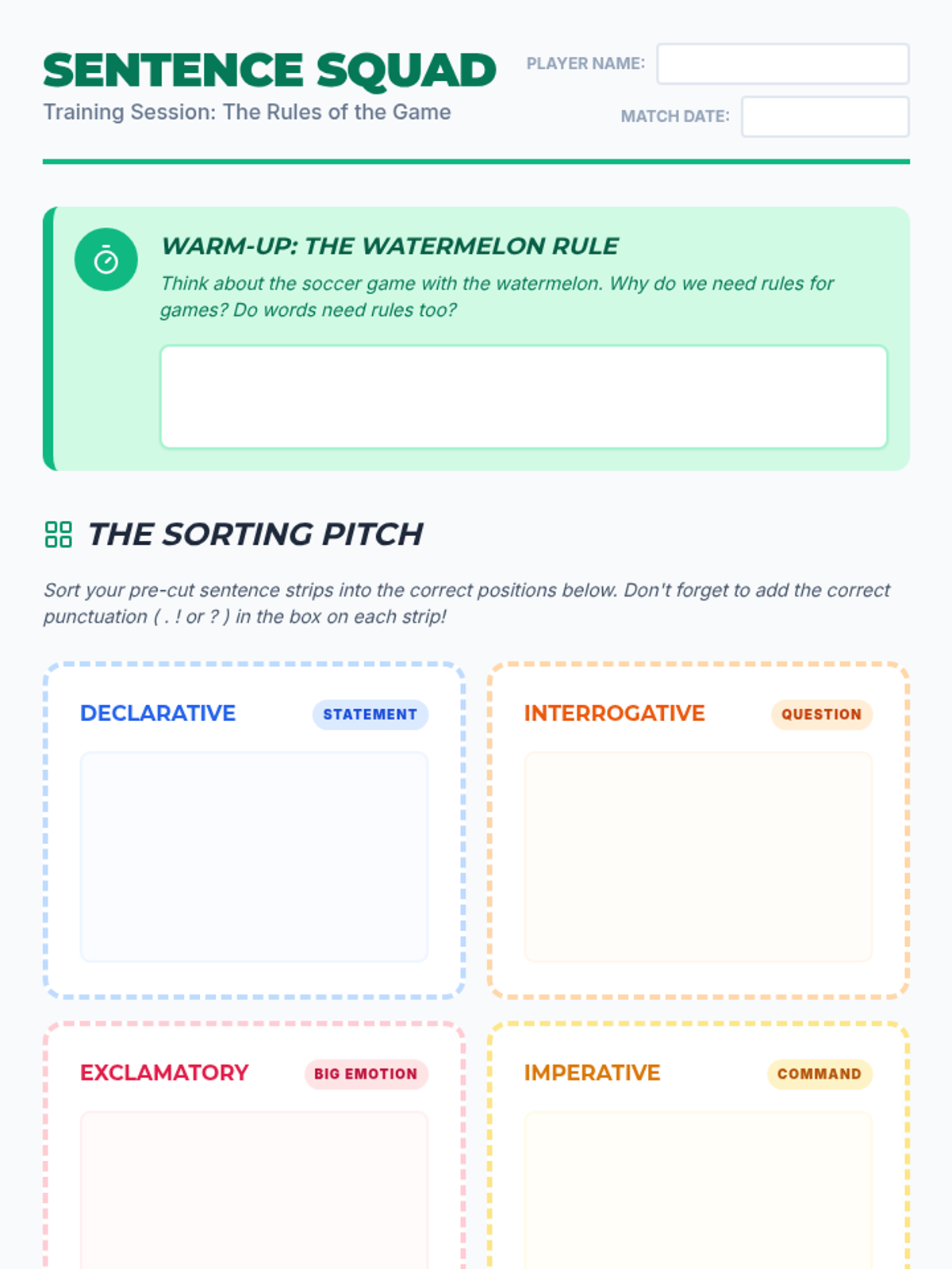 Students will learn the four types of sentences (declarative, interrogative, imperative, and exclamatory) using sports-themed analogies from a grammar video. They will classify sentences and practice adding correct punctuation based on sentence purpose and emotion.