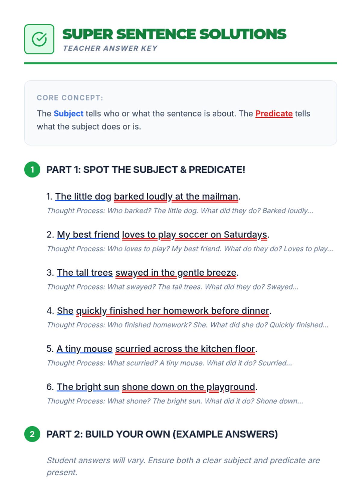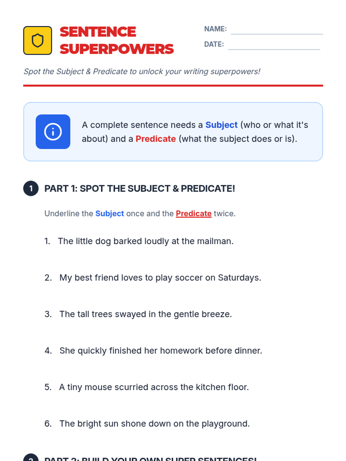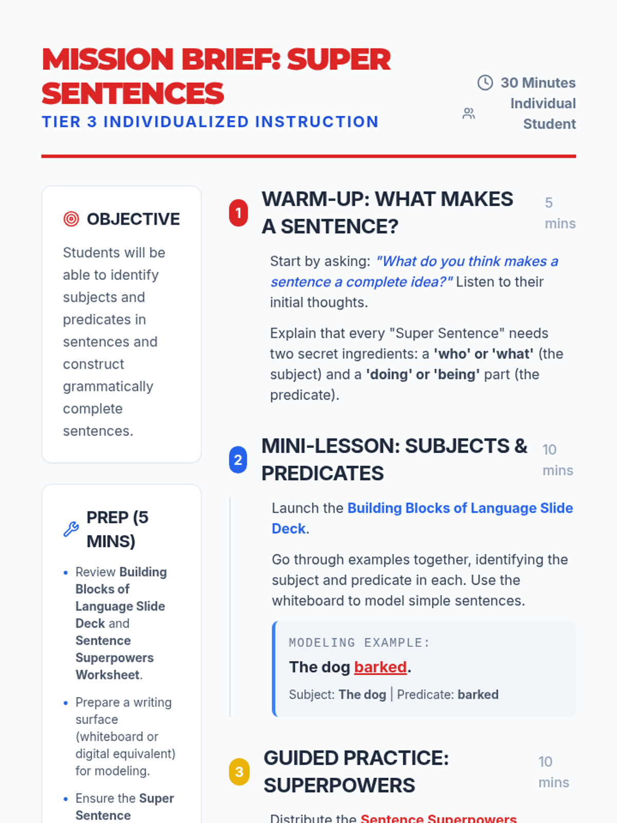 A Tier 3 individualized lesson focused on helping students identify and construct complete sentences using subjects and predicates through a superhero-themed approach.