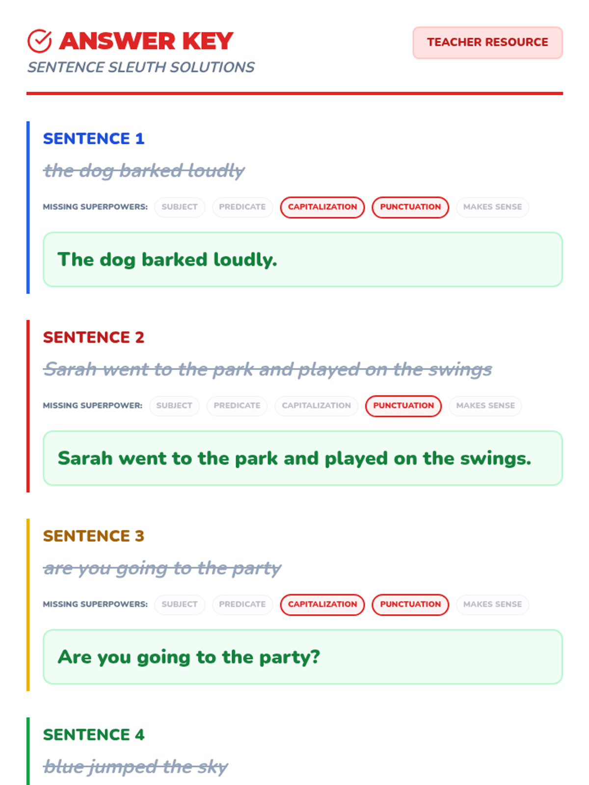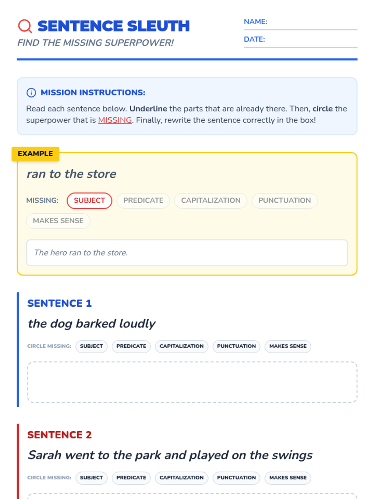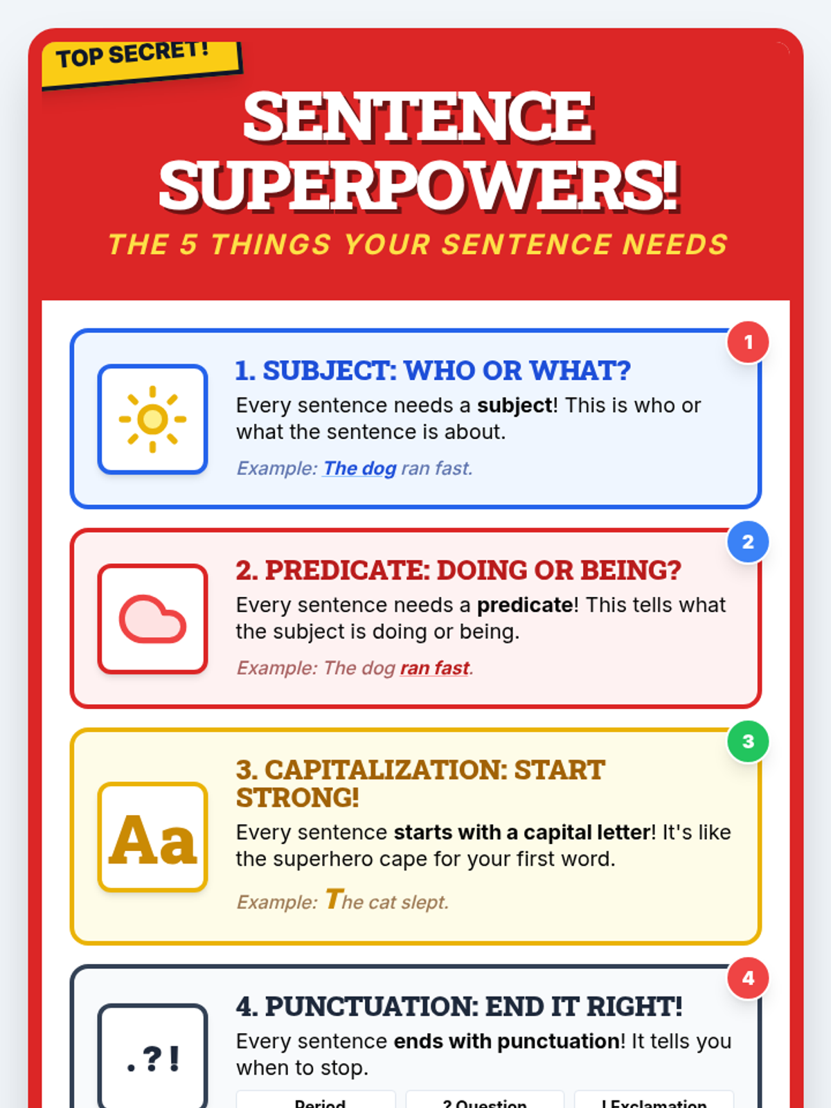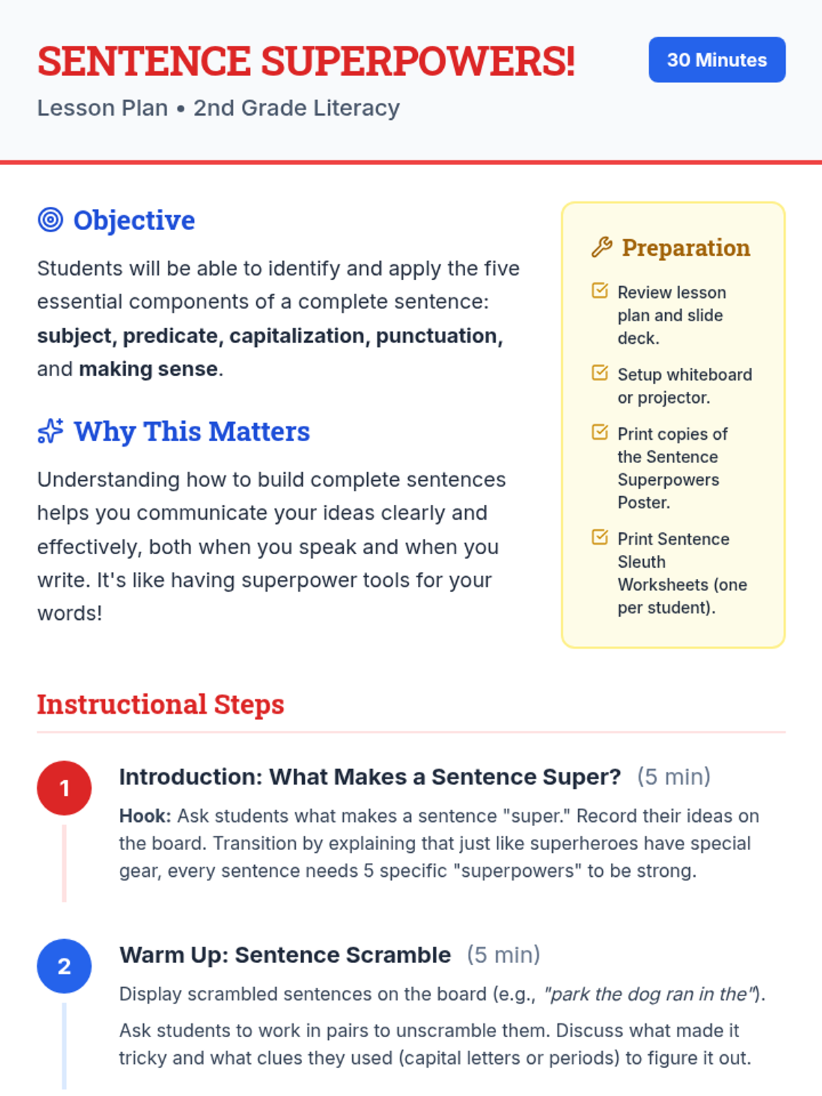 A 30-minute lesson for 2nd graders to master the five essential components of a complete sentence using a fun superhero theme.