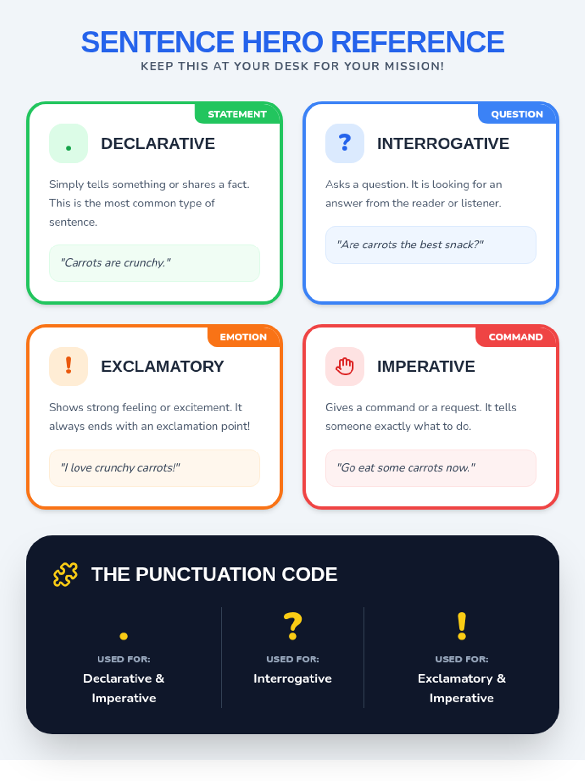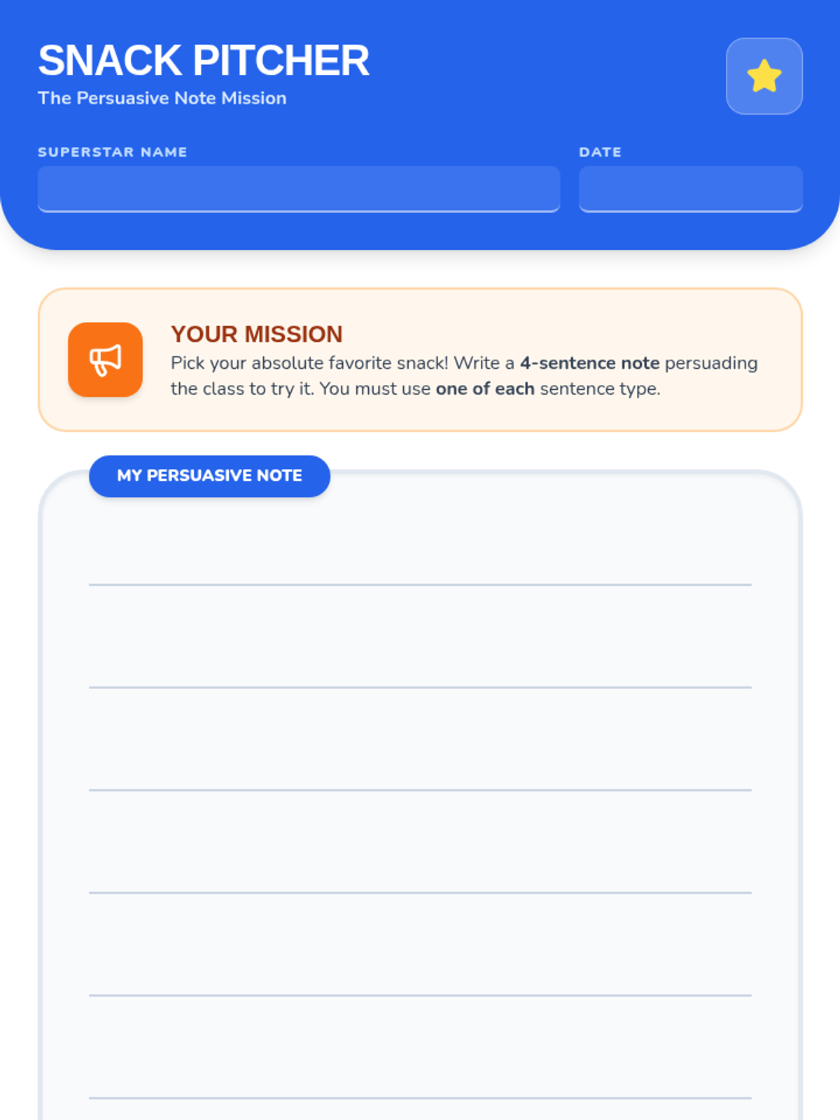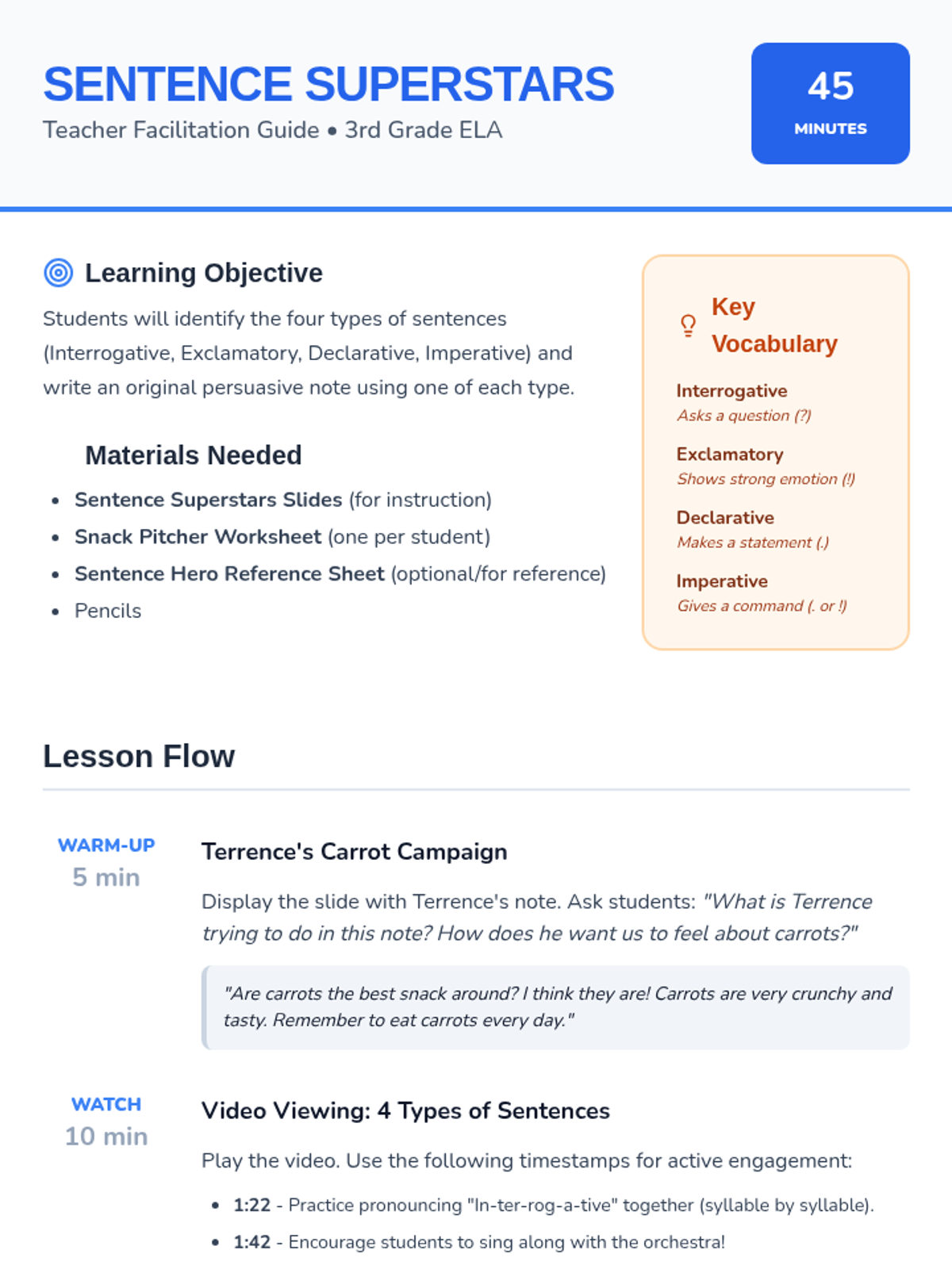 A high-energy lesson where 3rd graders master the four sentence types (Interrogative, Exclamatory, Declarative, and Imperative) by writing a persuasive note about their favorite snack, inspired by the video '4 Types of Sentences for Kids'.