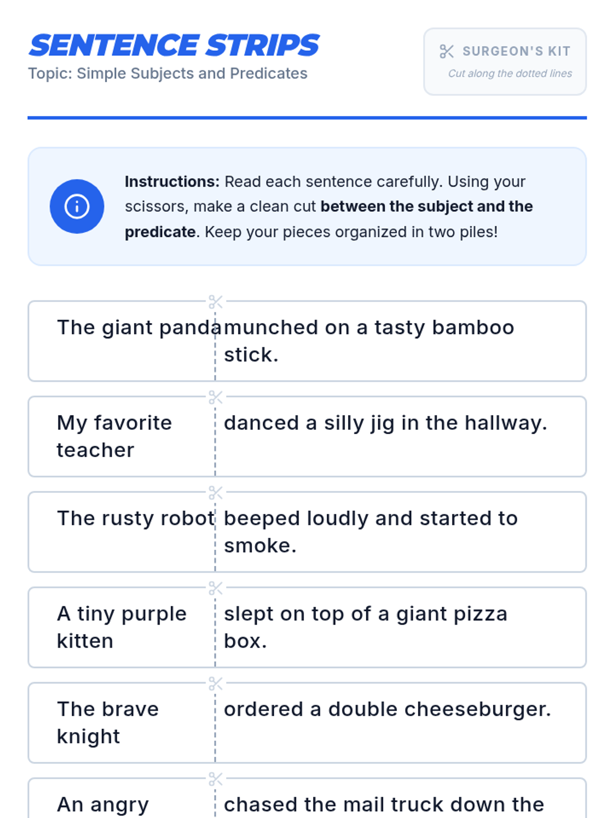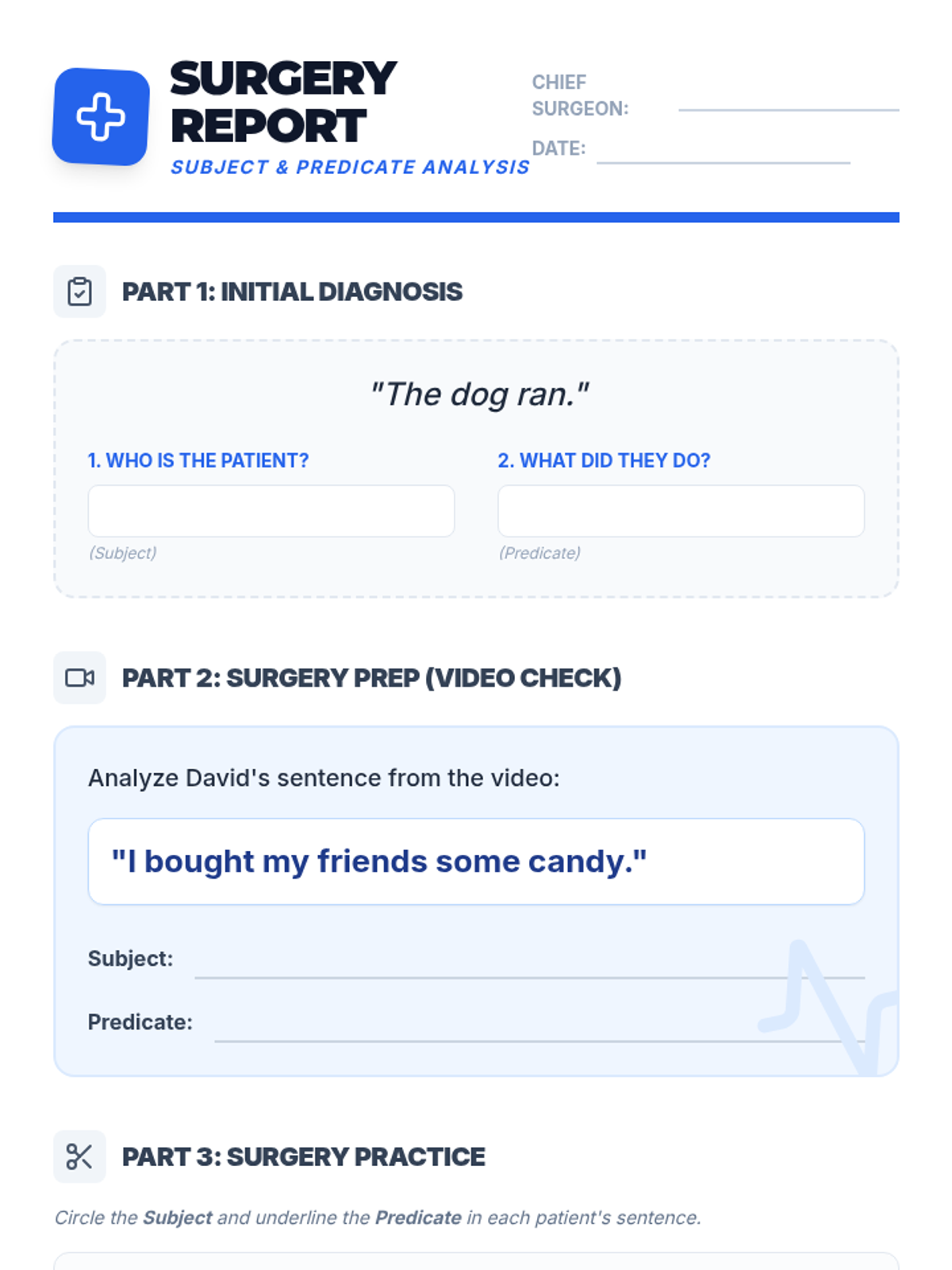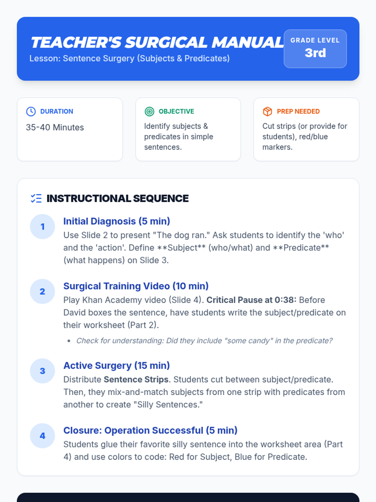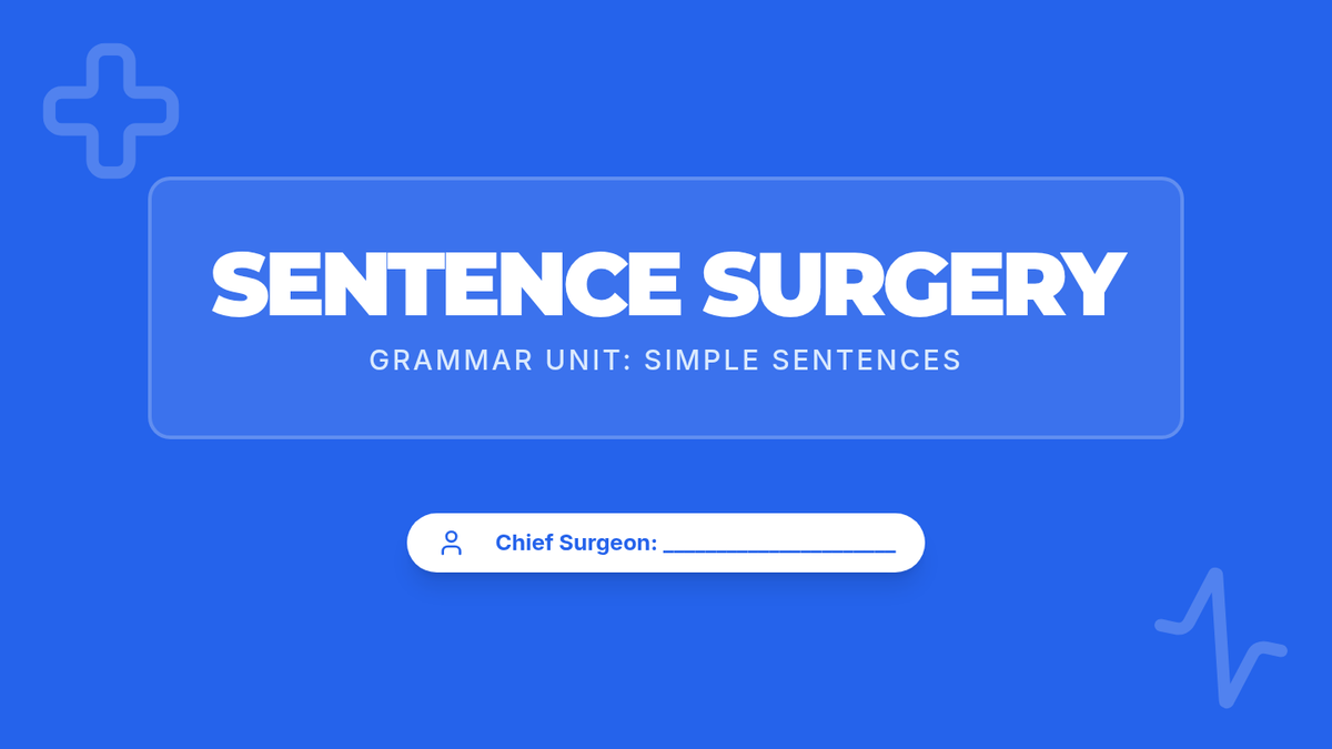 A medical-themed grammar lesson where 3rd graders become 'Sentence Surgeons' to identify and manipulate subjects and predicates in simple sentences. Includes a video analysis and a hands-on mixing activity to create silly sentences.