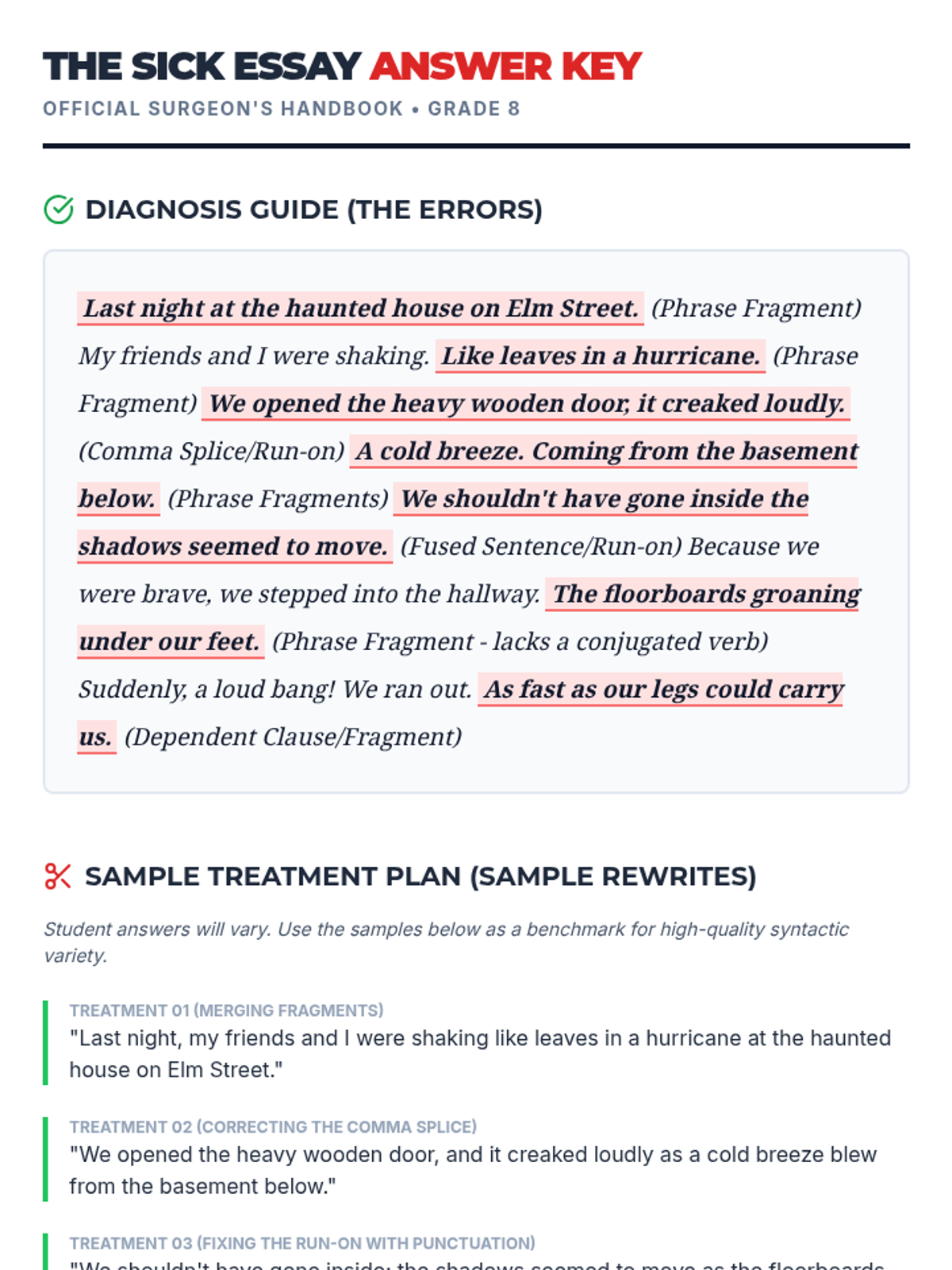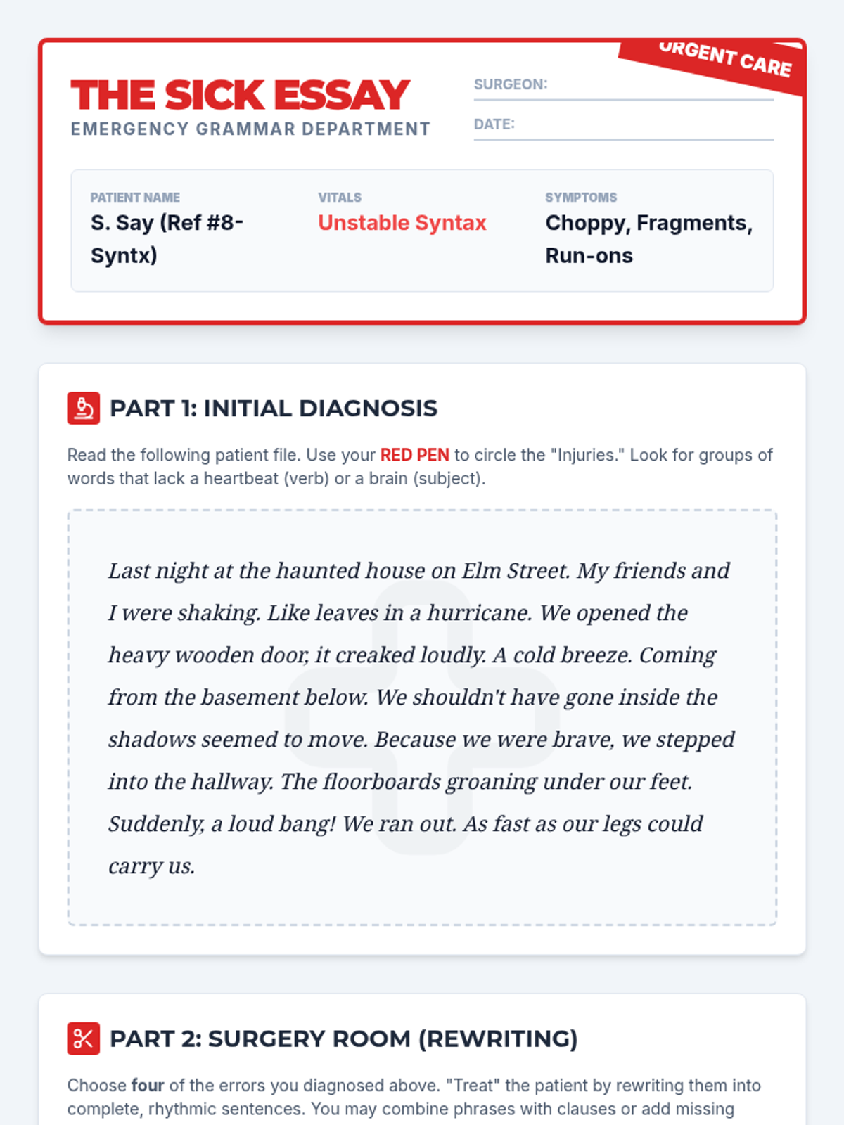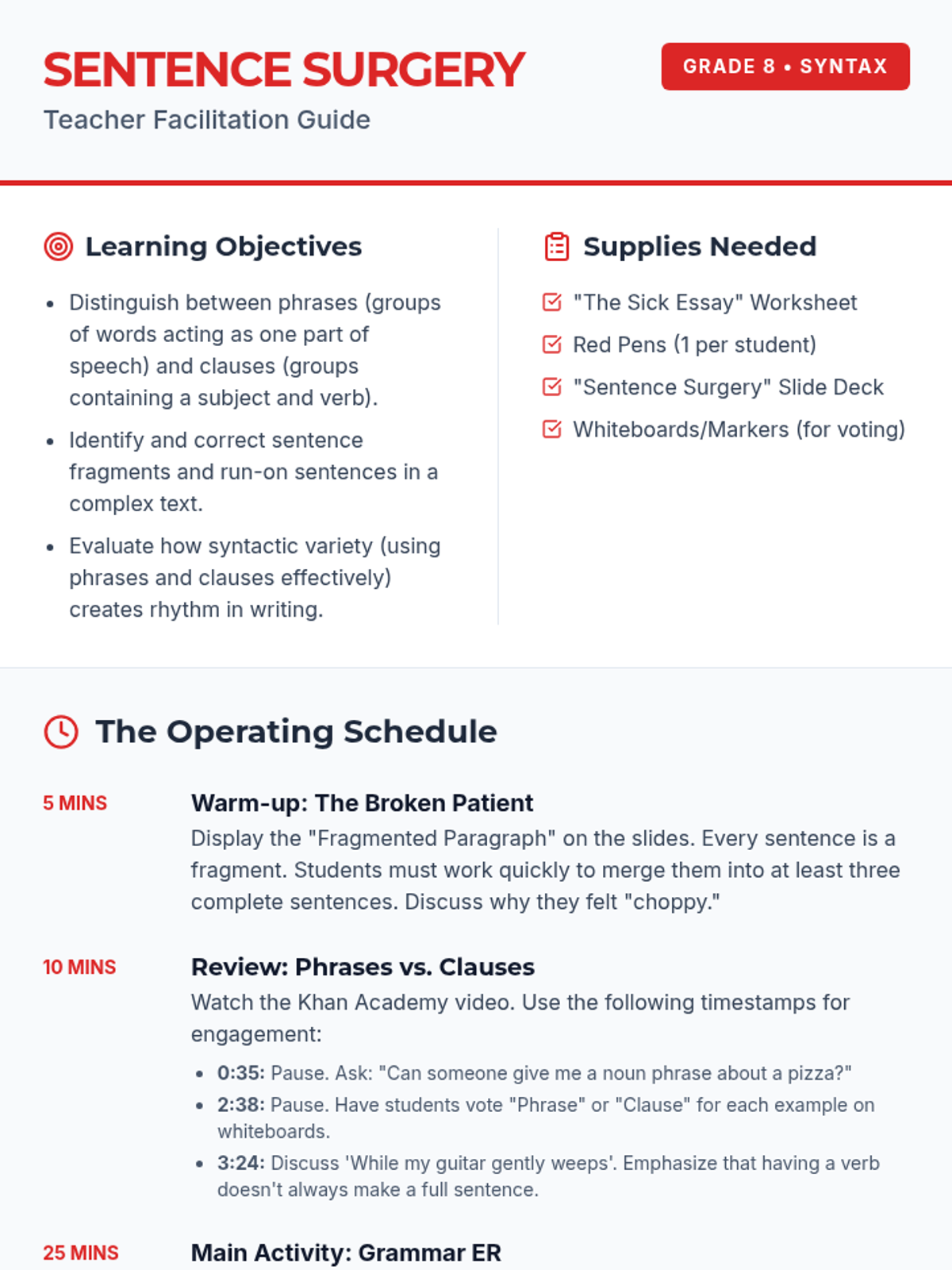 A high-energy lesson where students become 'Grammar Doctors' to diagnose and treat sick sentences, focusing on the distinction between phrases and clauses to improve syntactic variety.