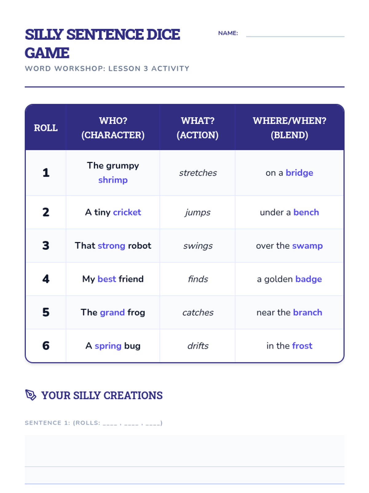 Students transition from isolated words to full sentences using a 'Silly Sentence' dice game to practice spelling in context.