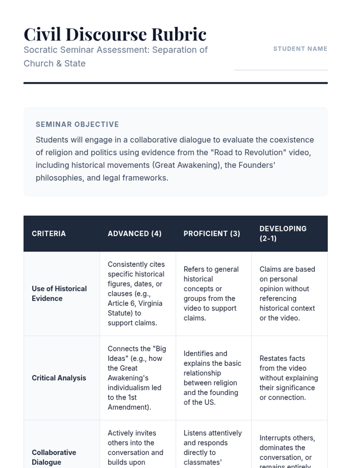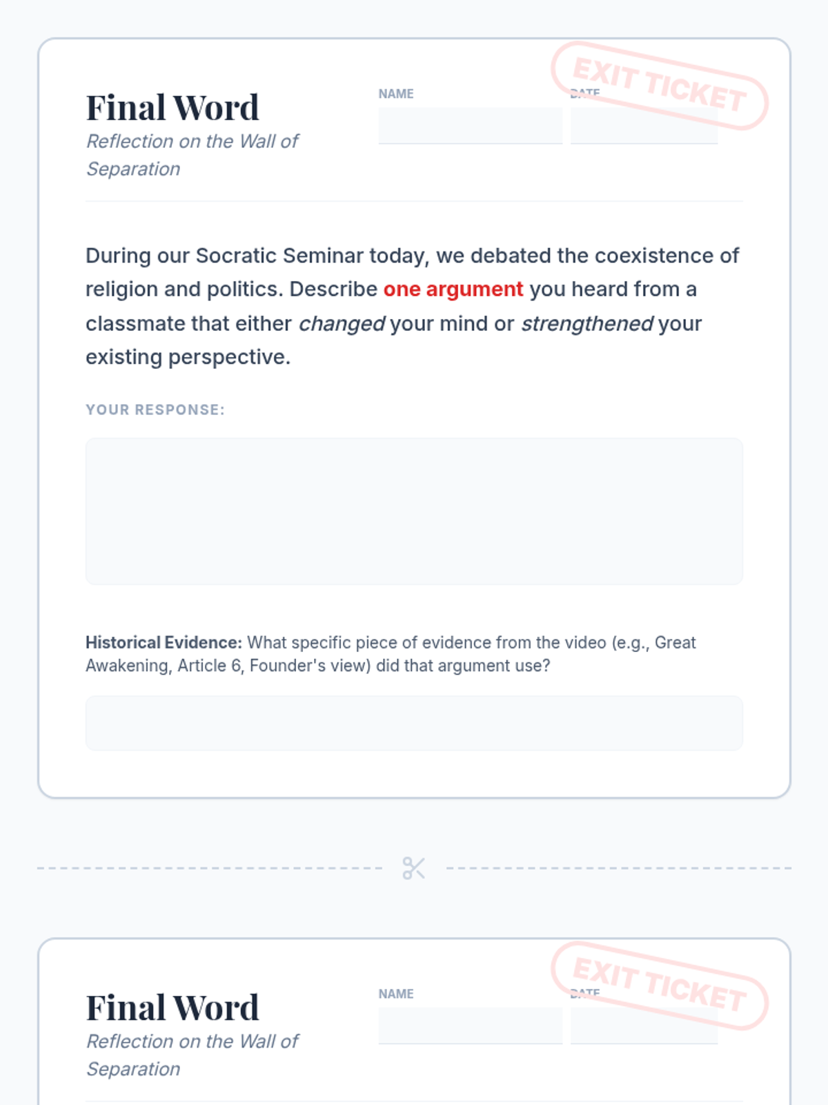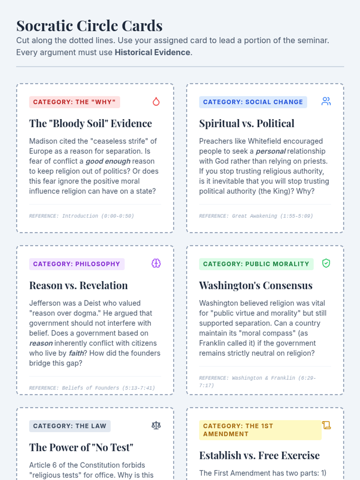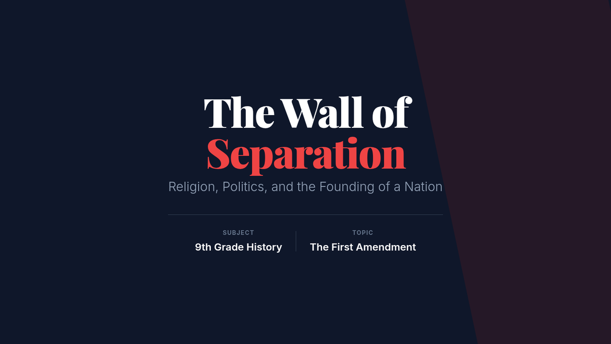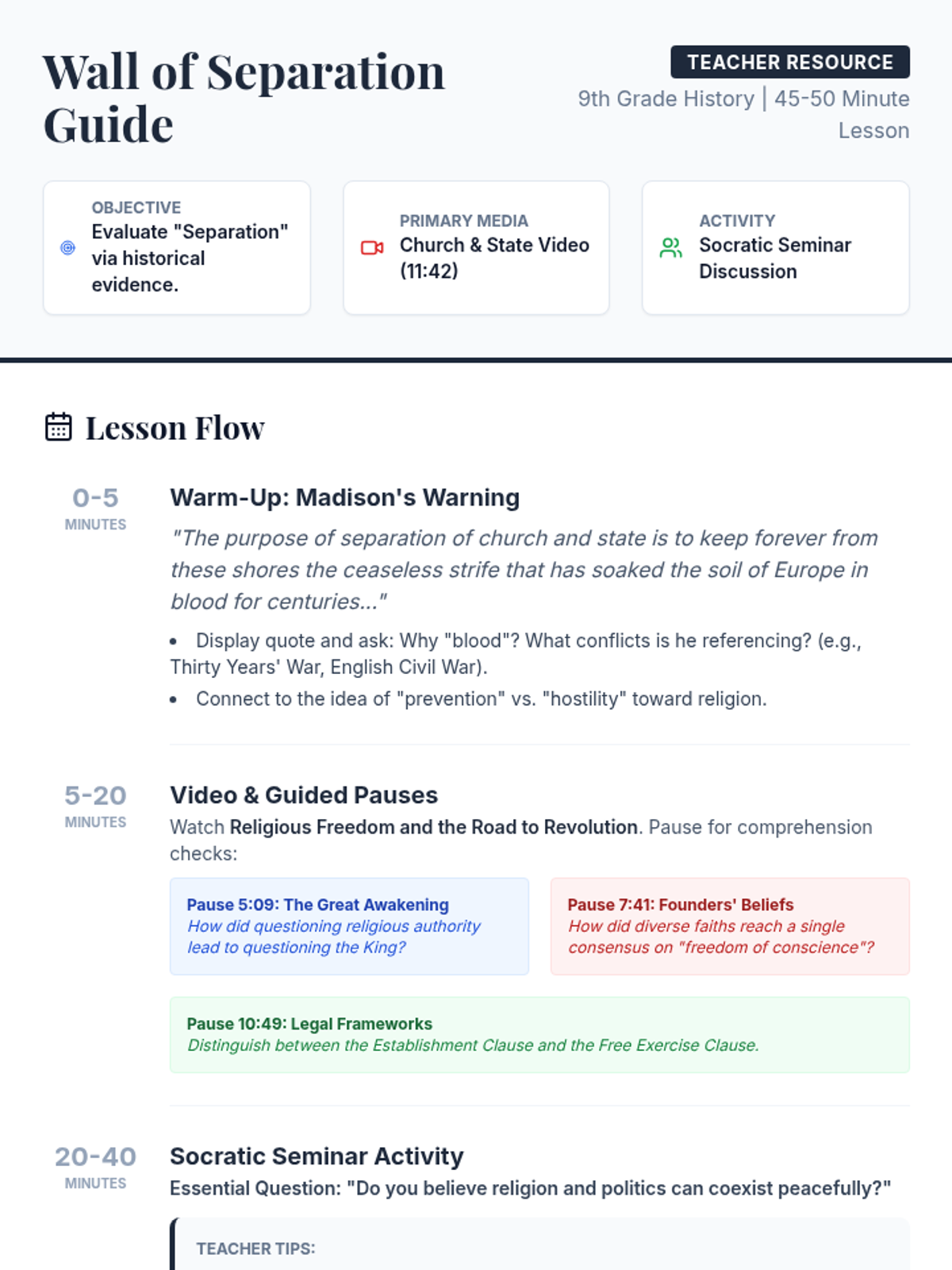 A 9th-grade history lesson exploring the historical roots and legal frameworks of the separation of church and state in America, centered on a Socratic Seminar and video analysis.
