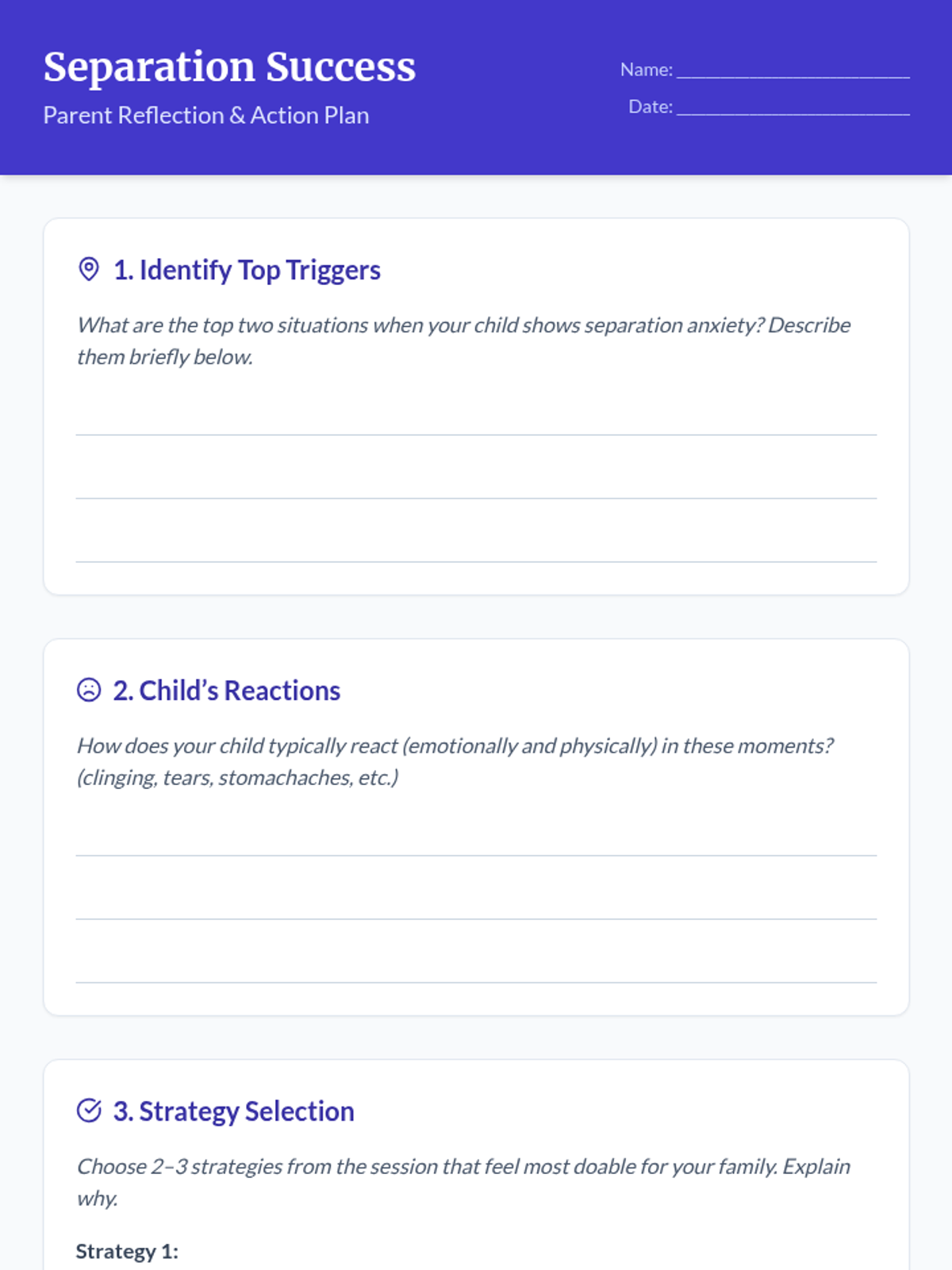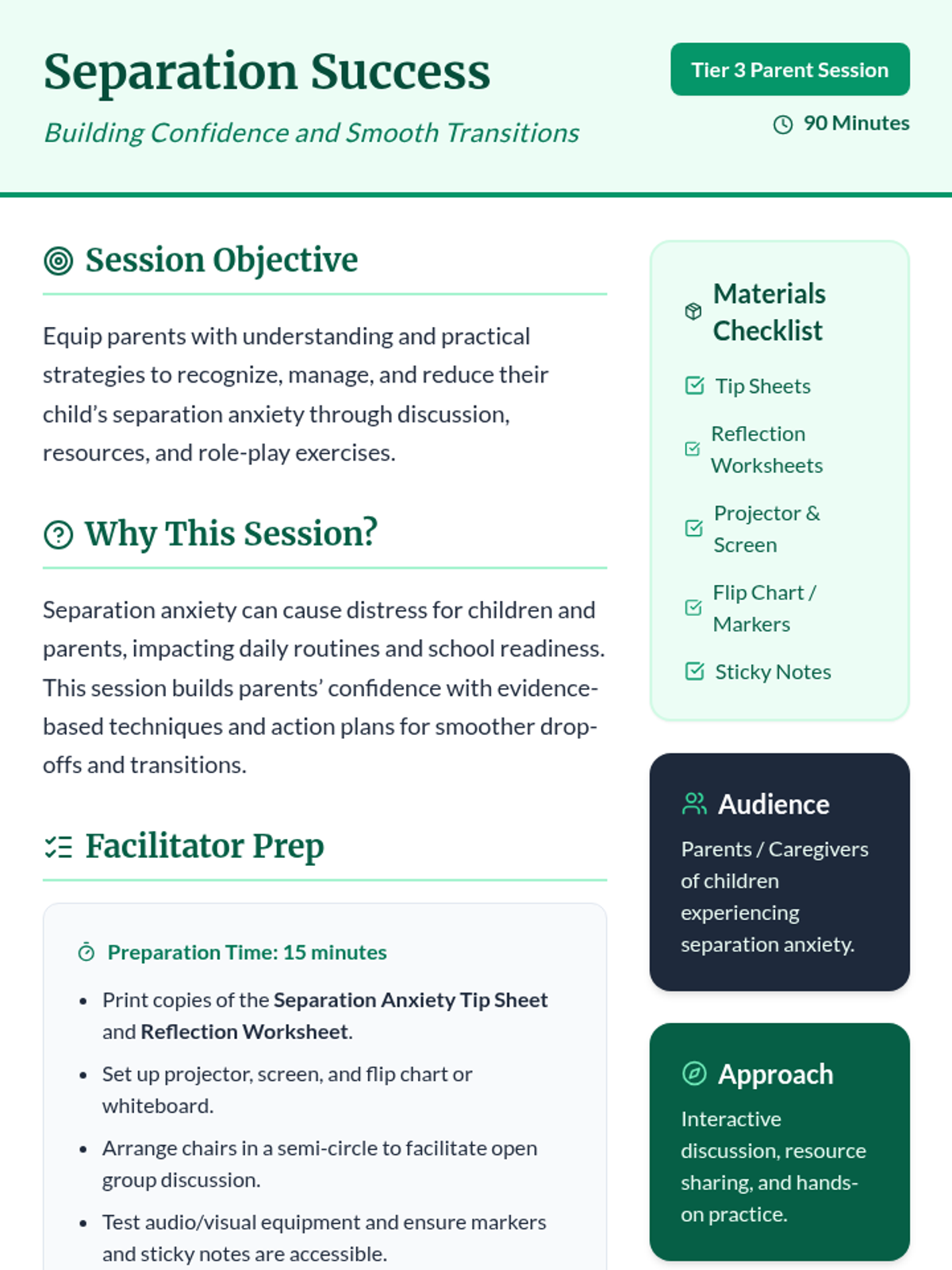 A 90-minute Tier 3 session for parents focused on evidence-based strategies to manage and reduce children's separation anxiety, featuring interactive discussions and role-play.