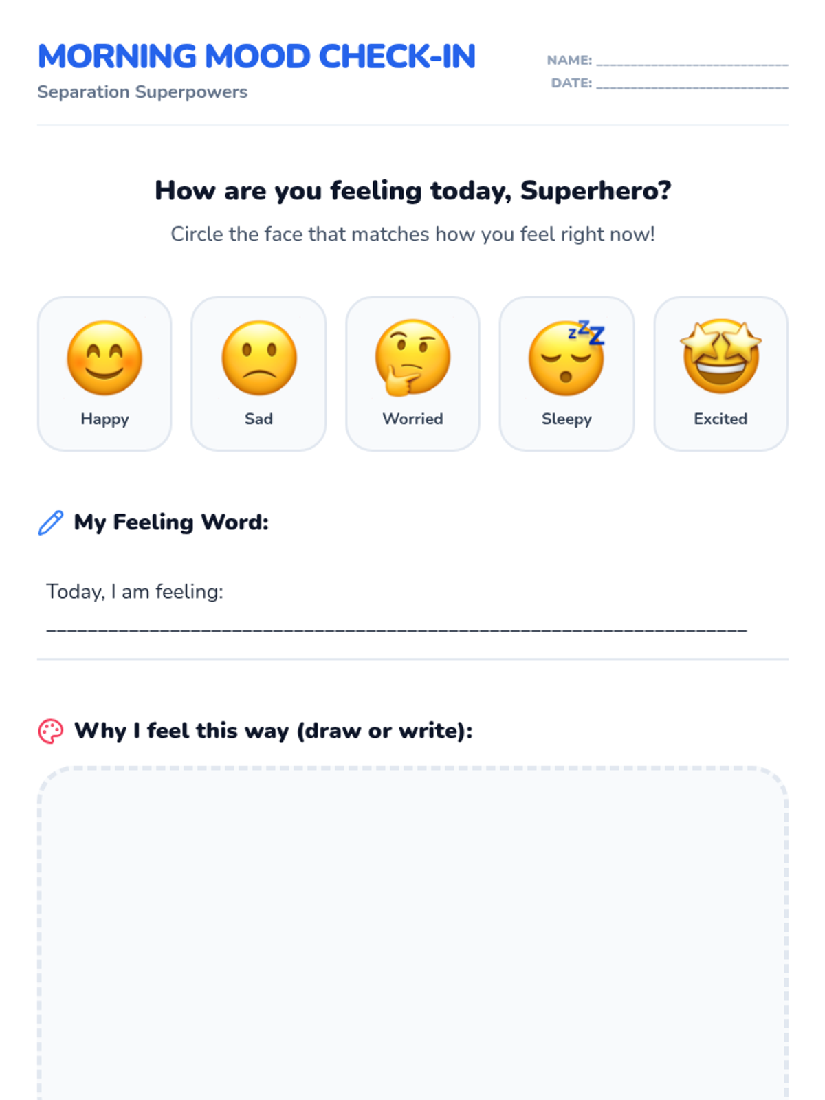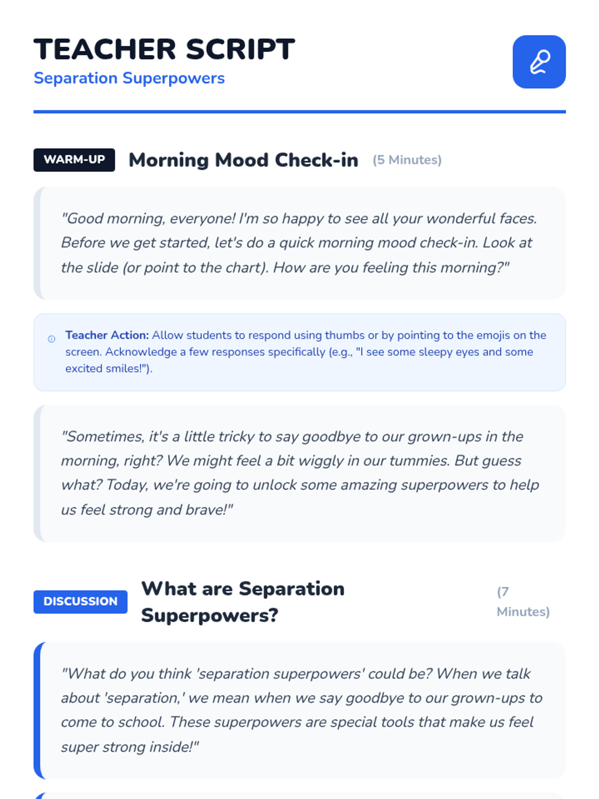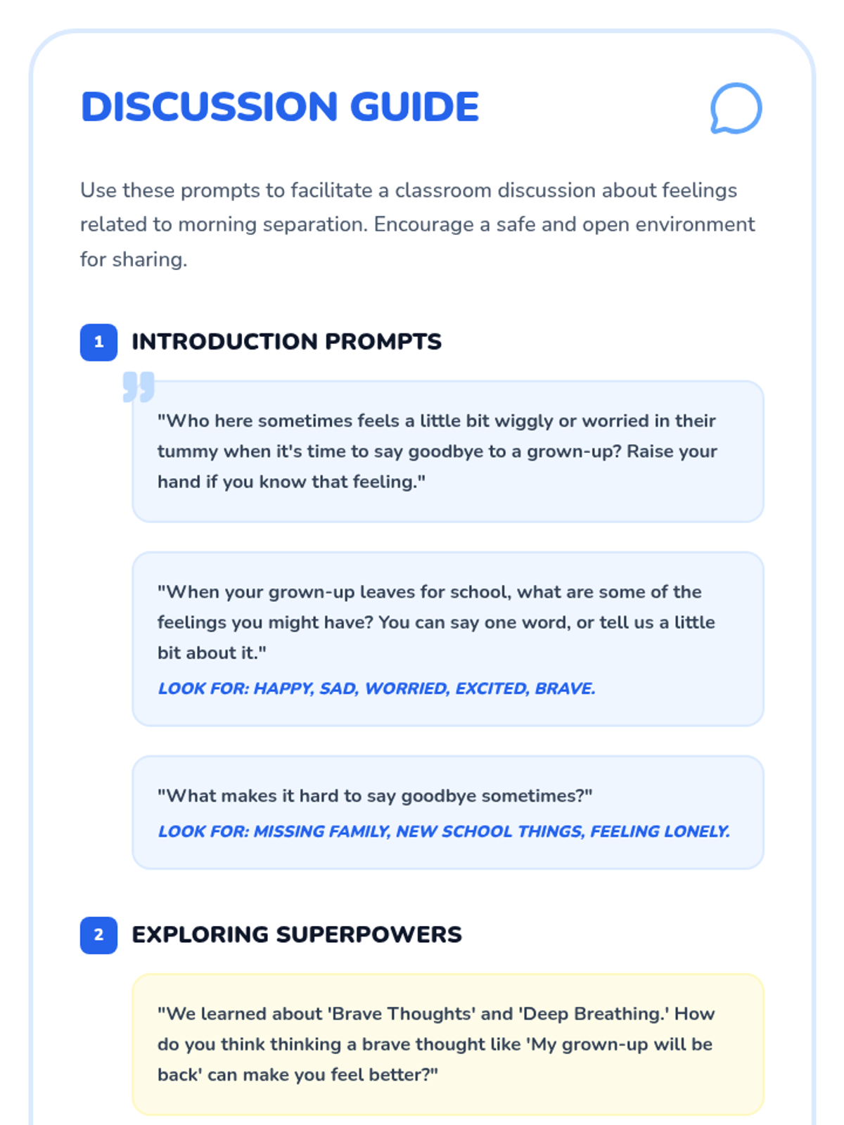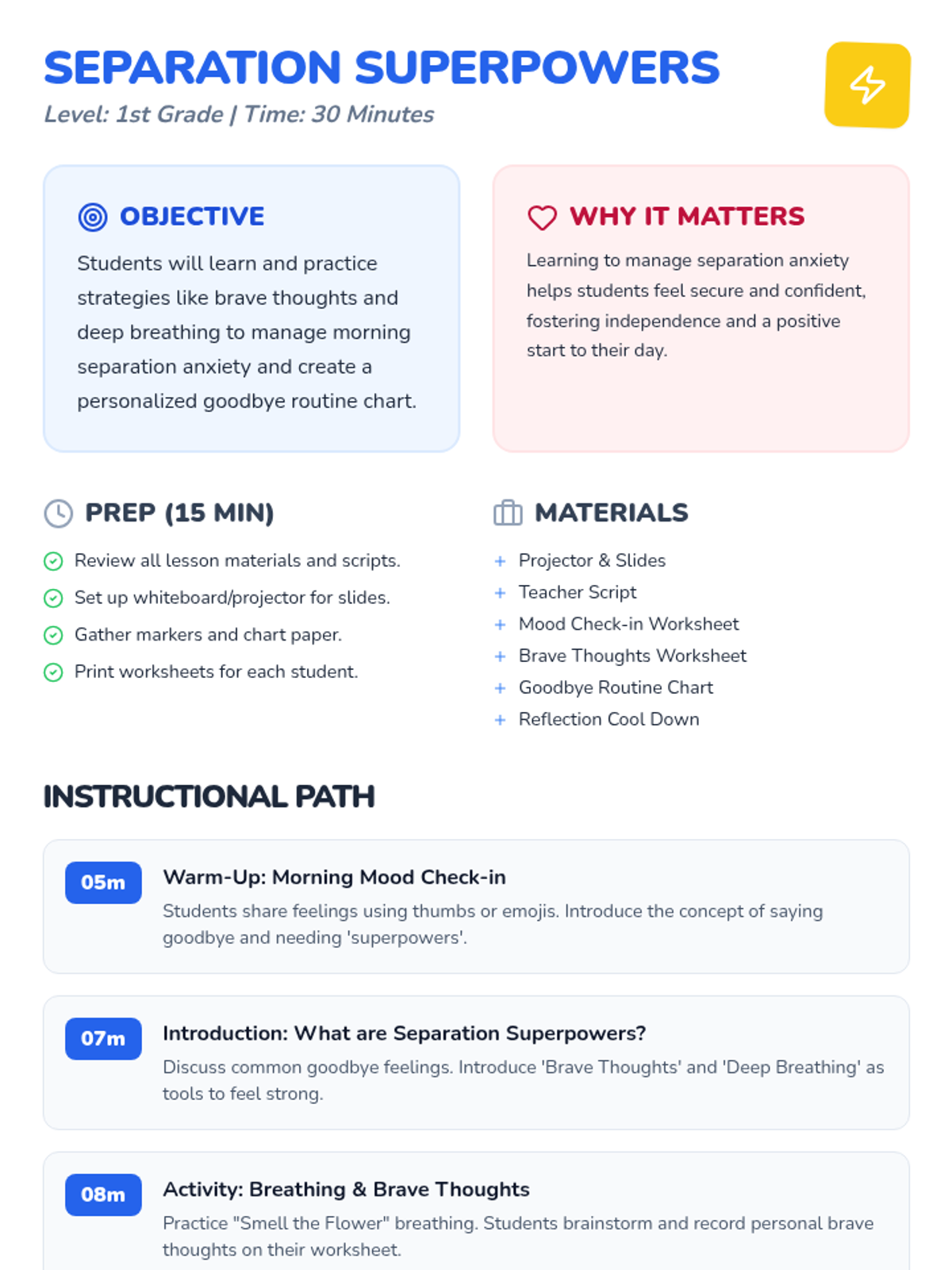 A 30-minute lesson for 1st graders to help them manage morning separation anxiety using 'superpowers' like brave thoughts, deep breathing, and goodbye routines.
