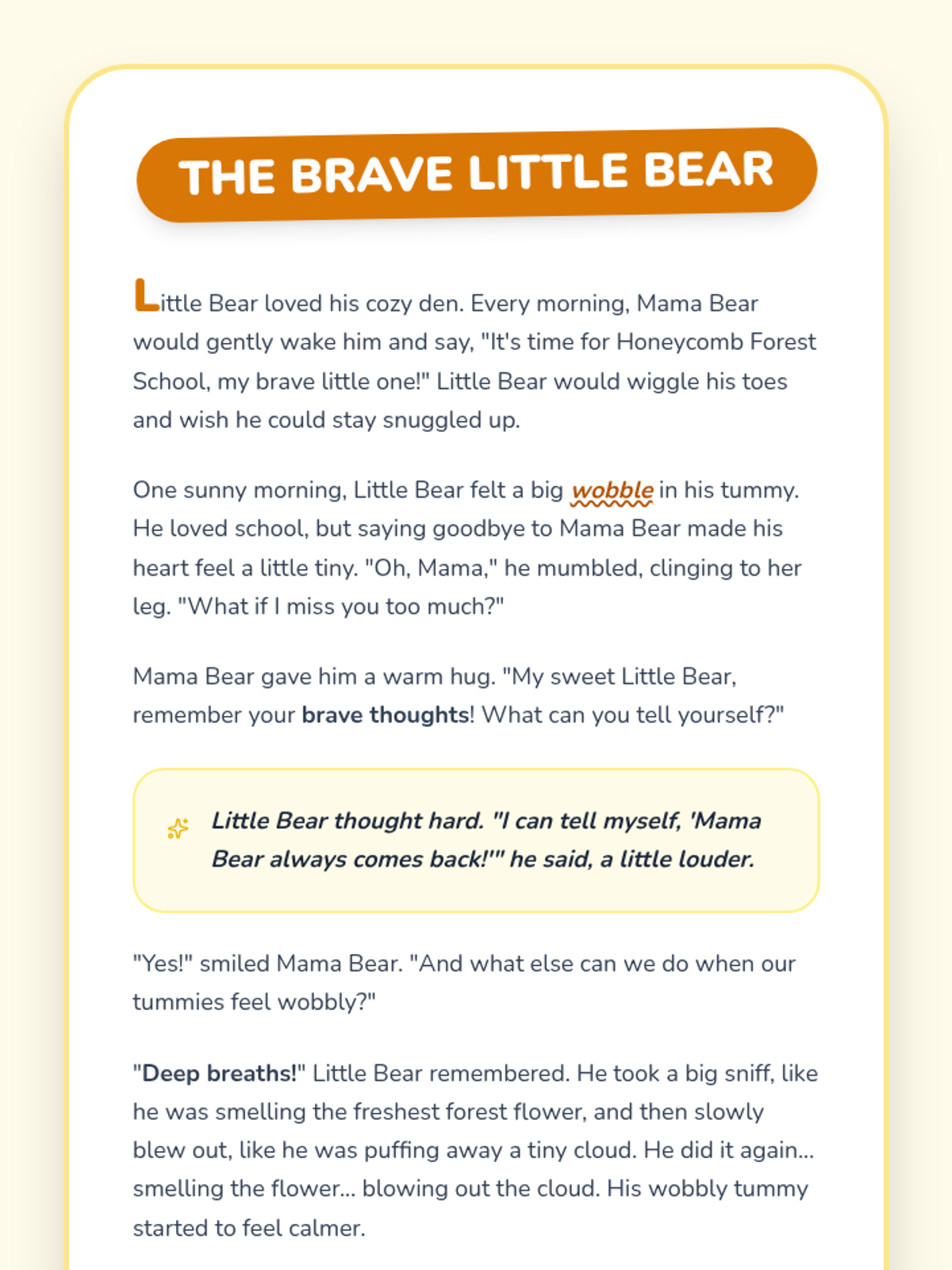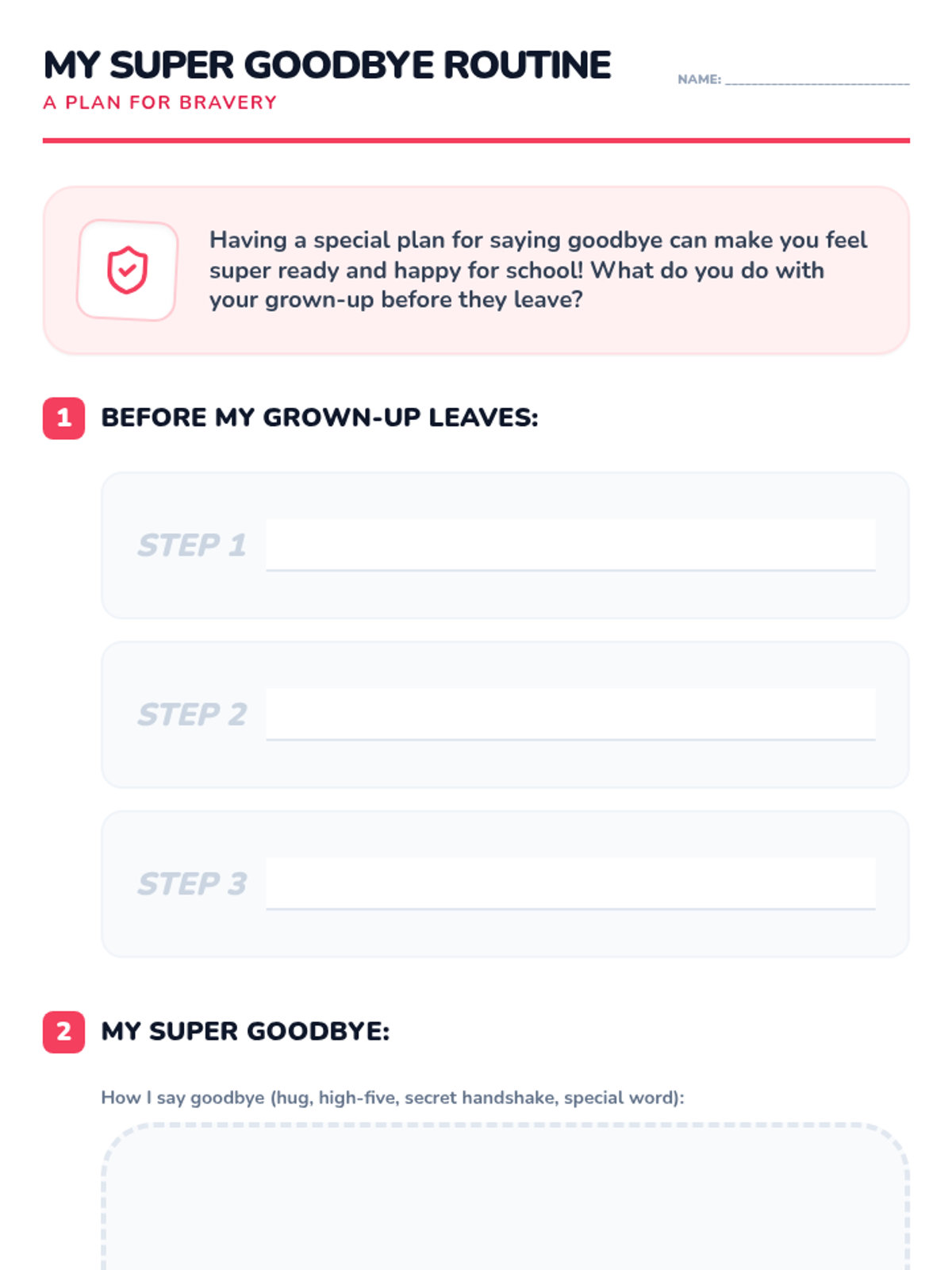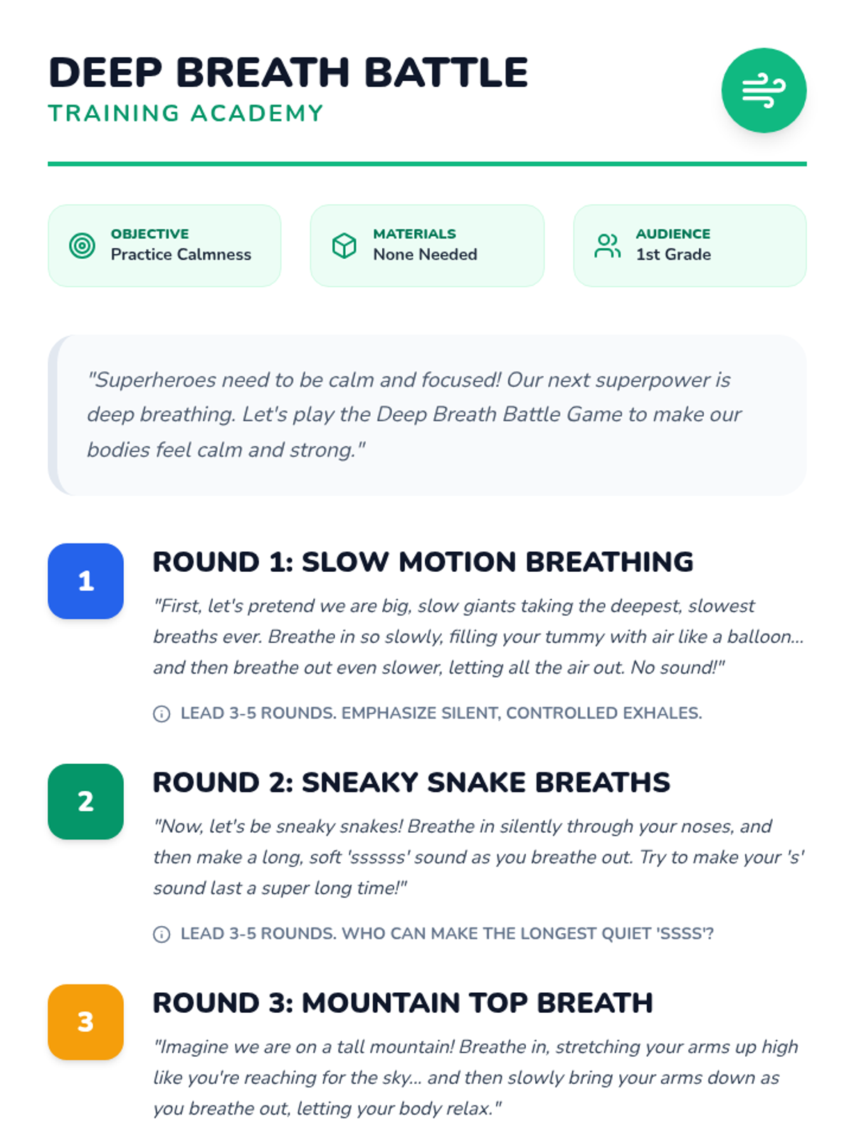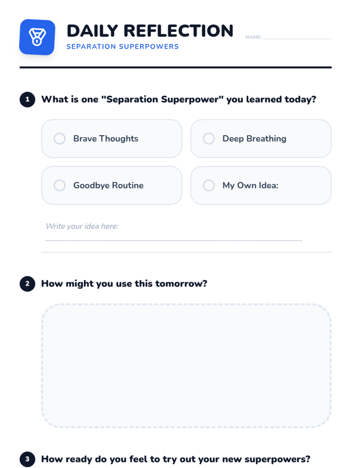 A 30-minute lesson for 1st graders to help them manage morning separation anxiety using 'superpowers' like brave thoughts, deep breathing, and goodbye routines.