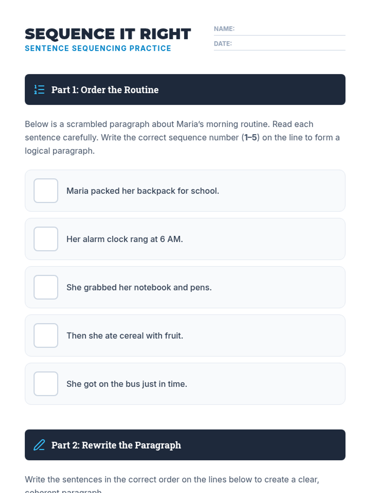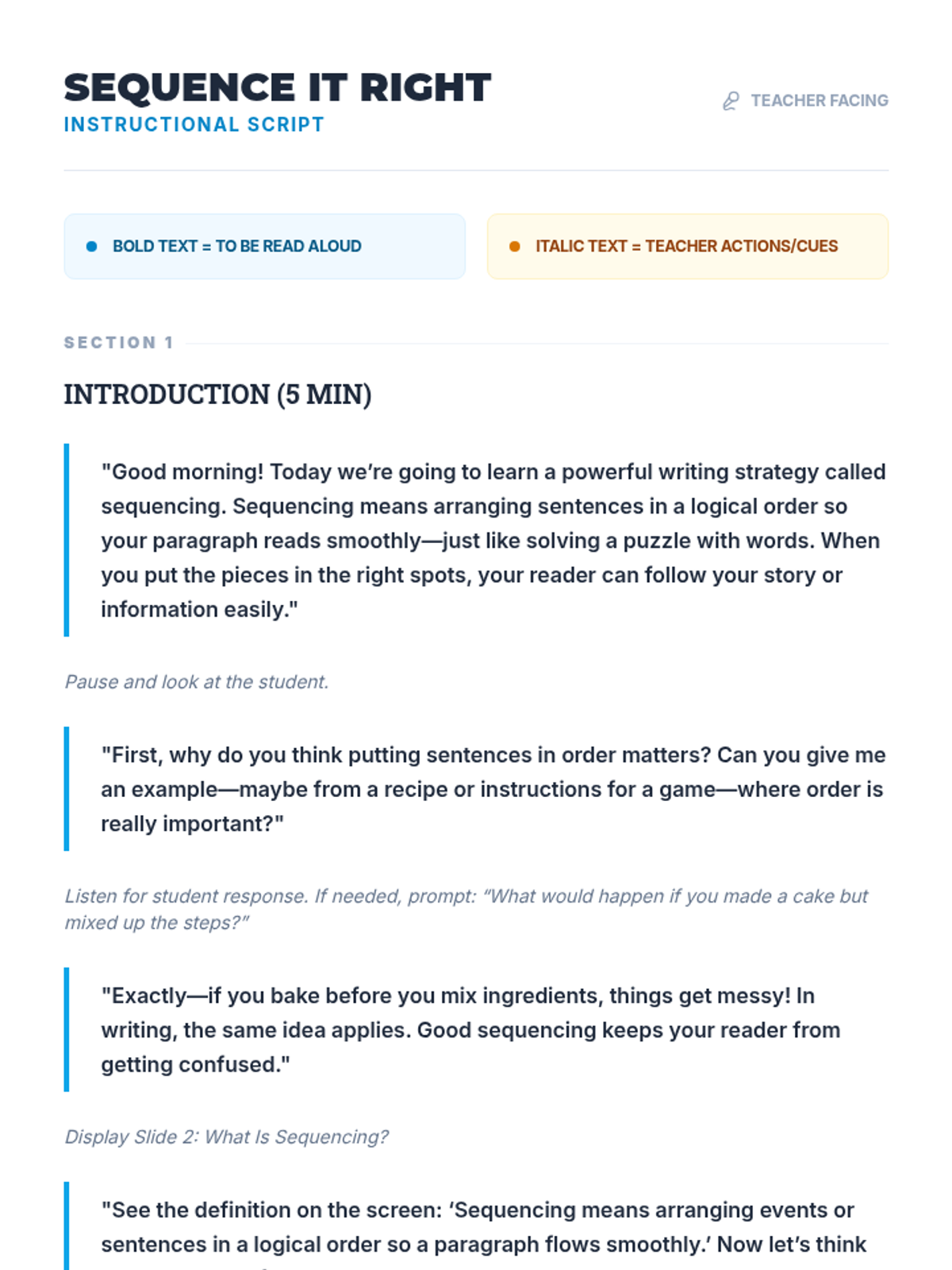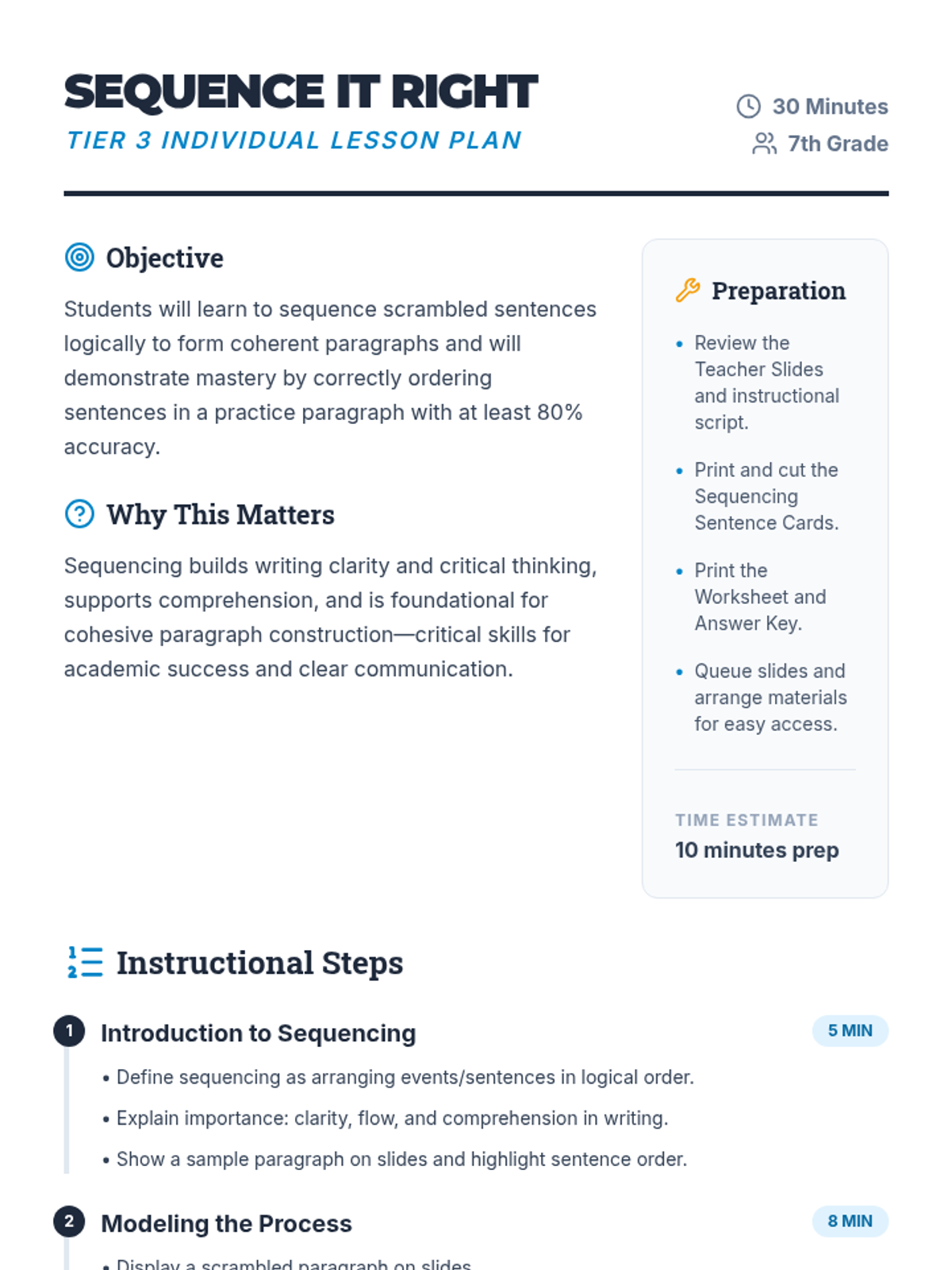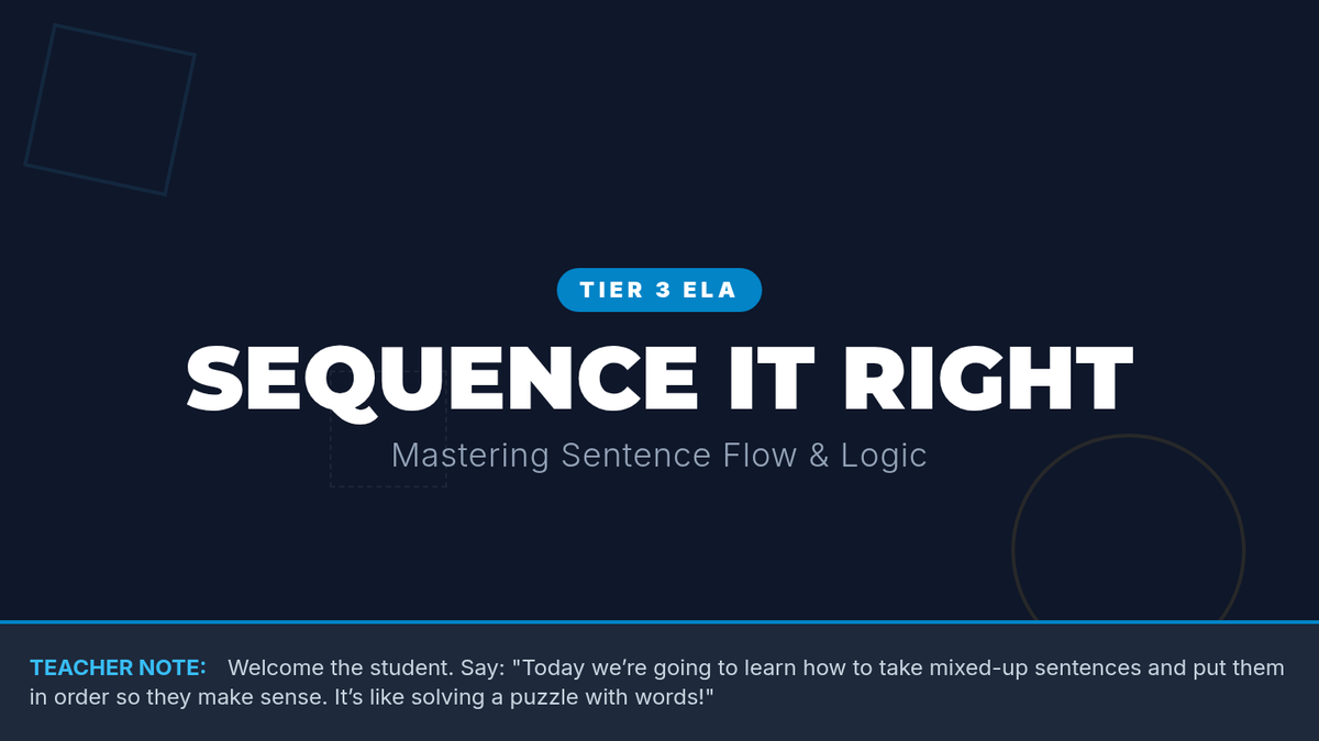 A 30-minute individual Tier 3 lesson for 7th graders focusing on logical sentence sequencing to improve paragraph coherence and writing clarity.