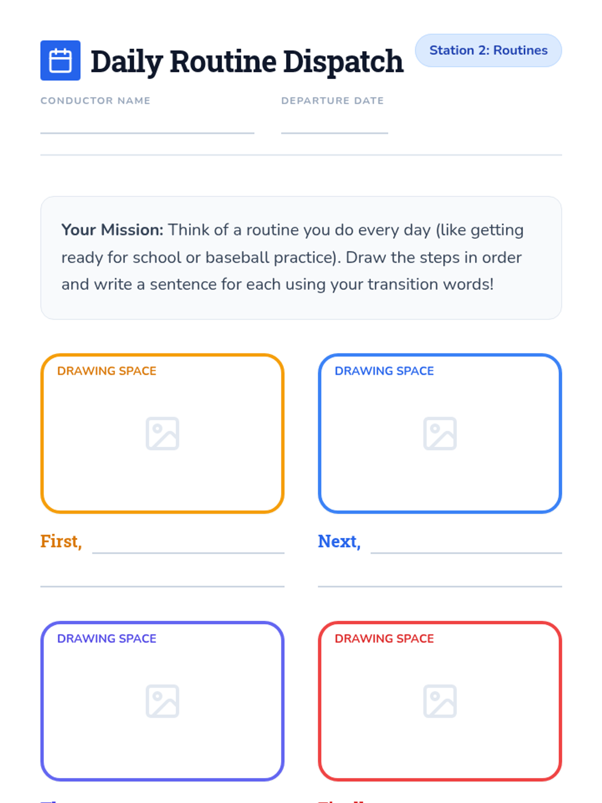 Students apply transition words to familiar daily routines and use sentence frames to write a structured four-step sequence.
