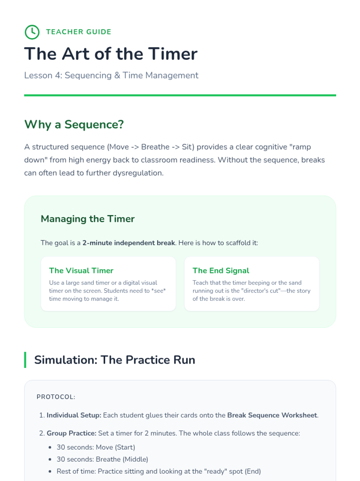 Students organize their chosen movements into a logical sequence: Start (Move), Middle (Breathe), End (Sit). They practice following this sequence independently using a timer. This structures the break to ensure a definite beginning and end.