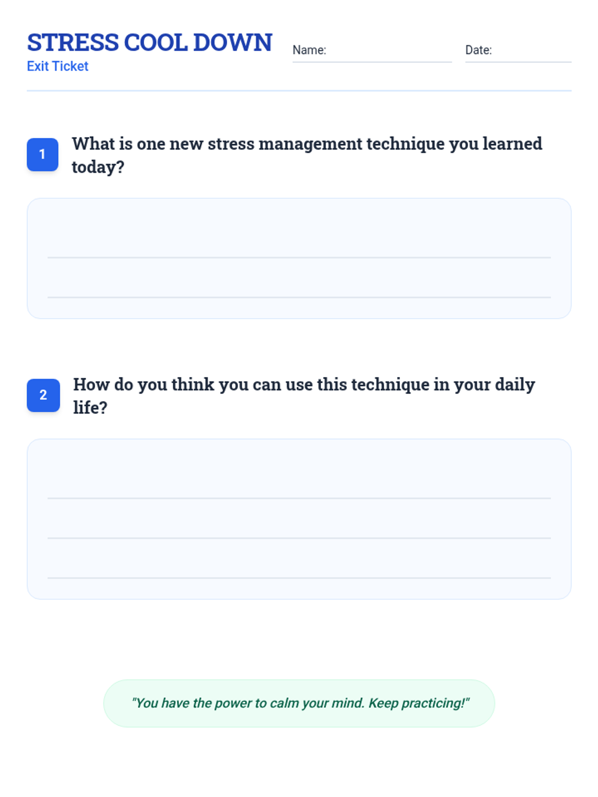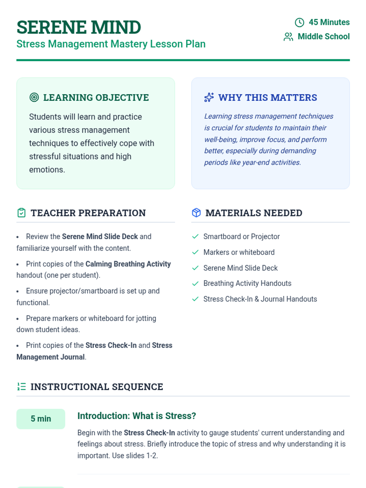 A 45-minute lesson for middle schoolers that introduces practical stress management techniques like square breathing, positive visualization, and progressive muscle relaxation to help navigate year-end pressures.