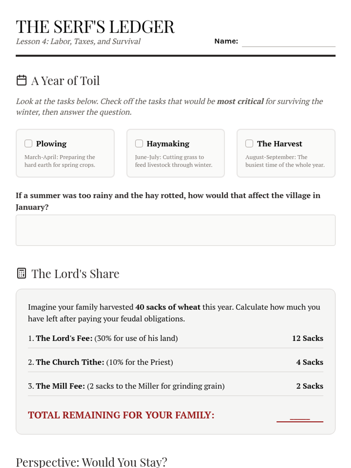 Focusing on the bottom of the pyramid, students analyze the seasonal calendar of a serf. They calculate the taxes and labor owed to the lord, fostering empathy and understanding of the lack of social mobility.