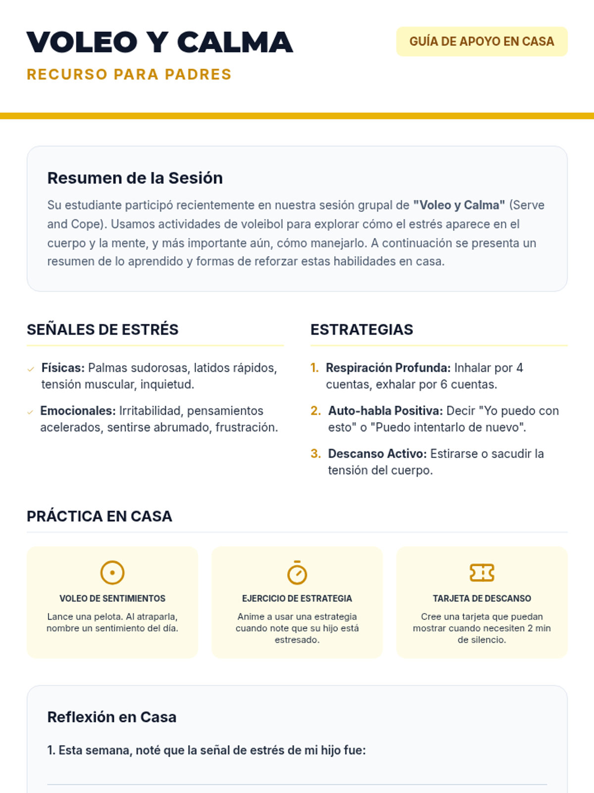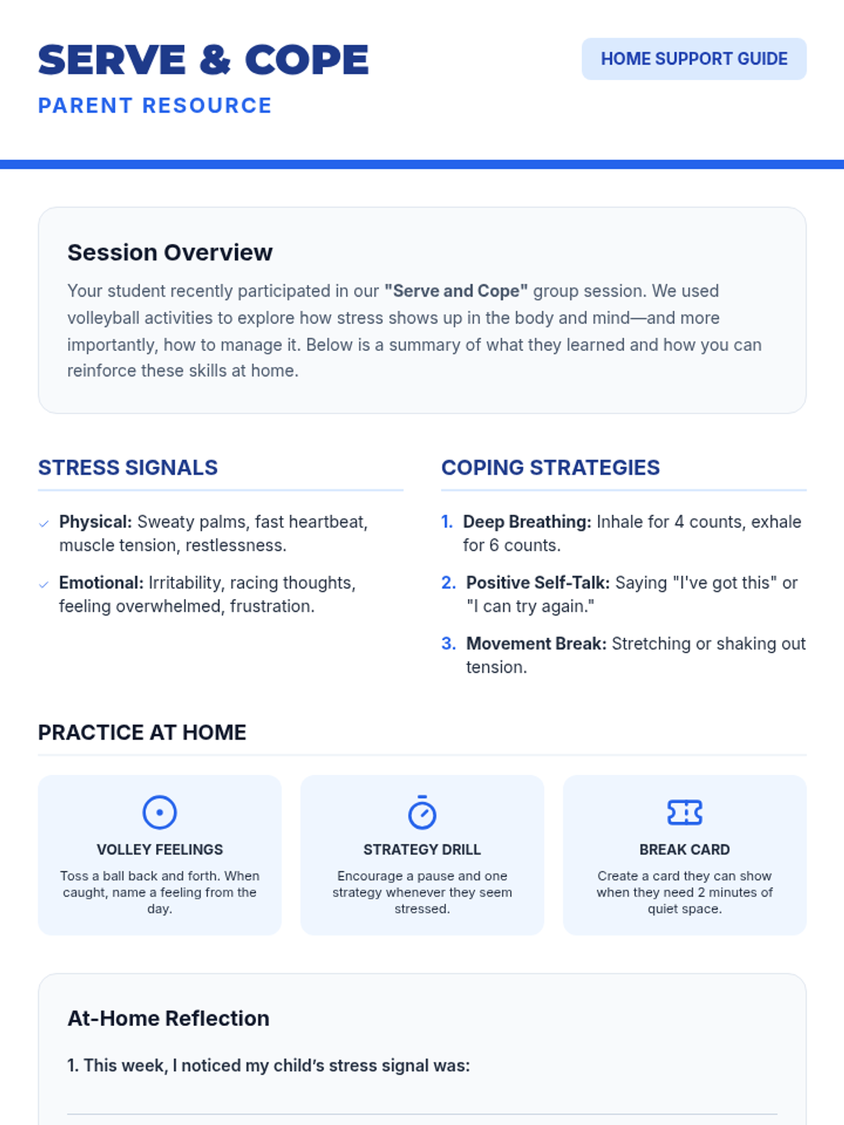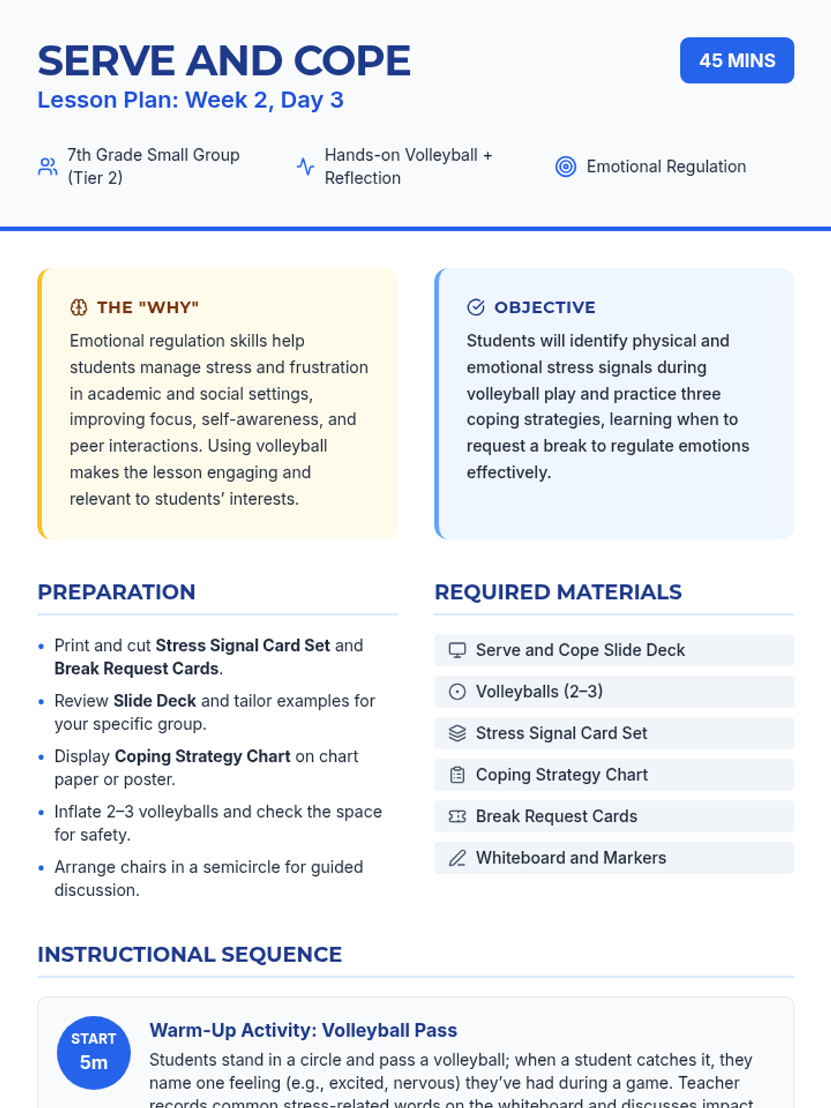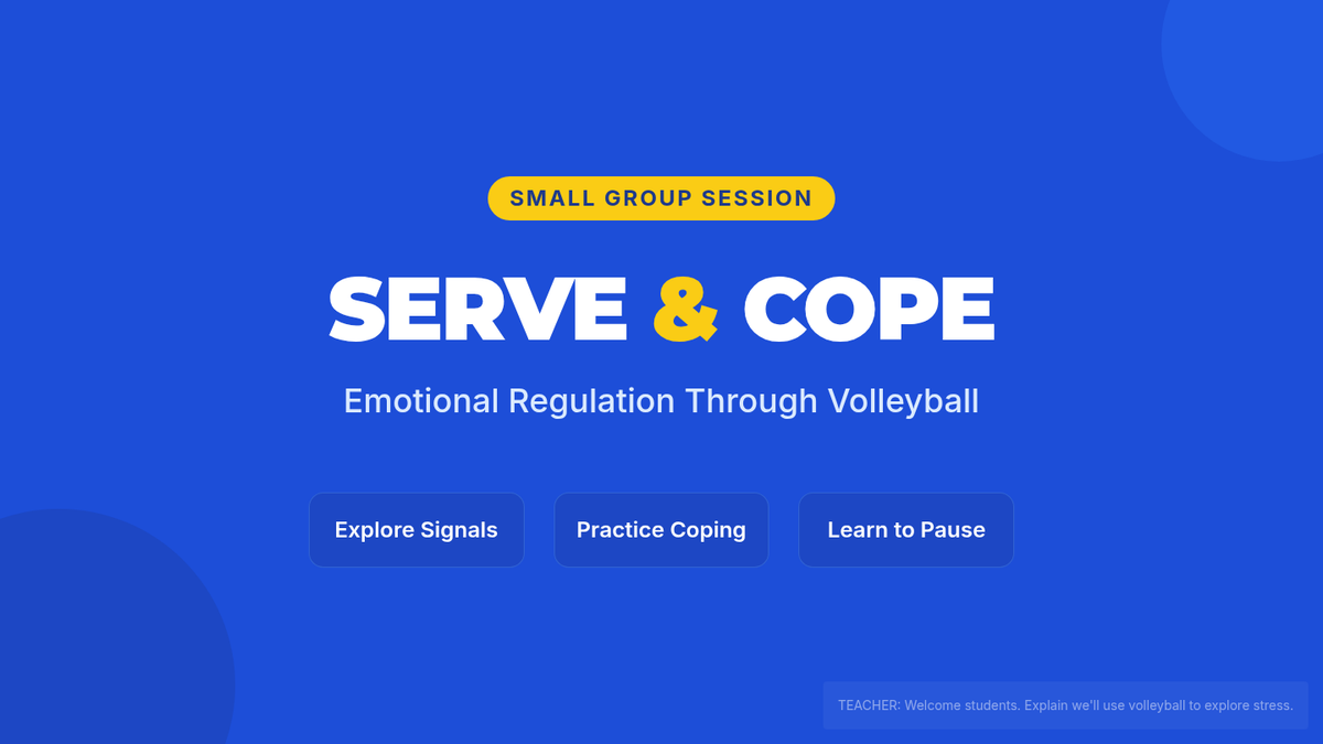 In this 45-minute group session, 7th-grade students explore emotional regulation through volleyball, learning to identify stress signals and practice coping strategies in a supportive small-group setting.